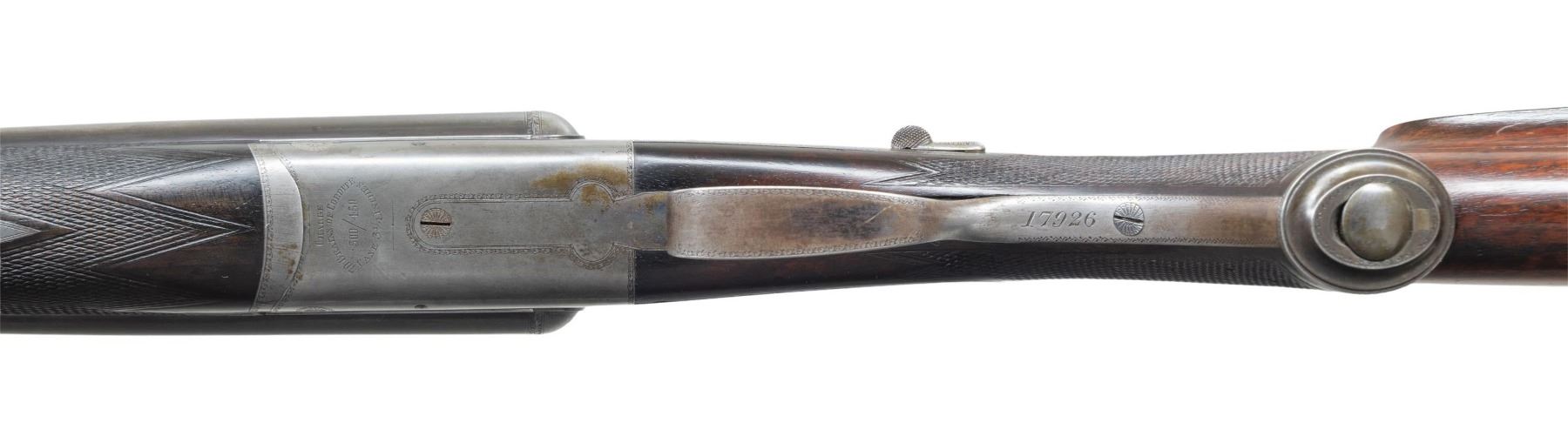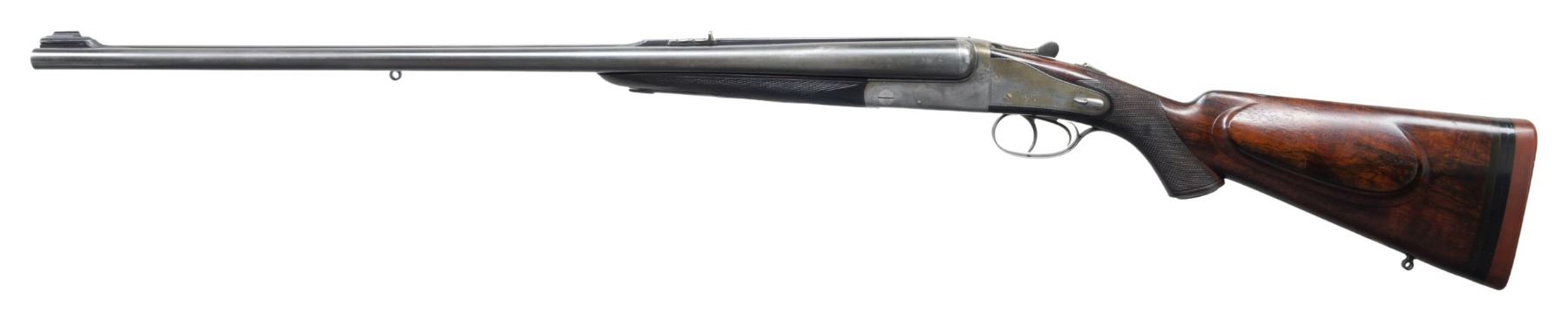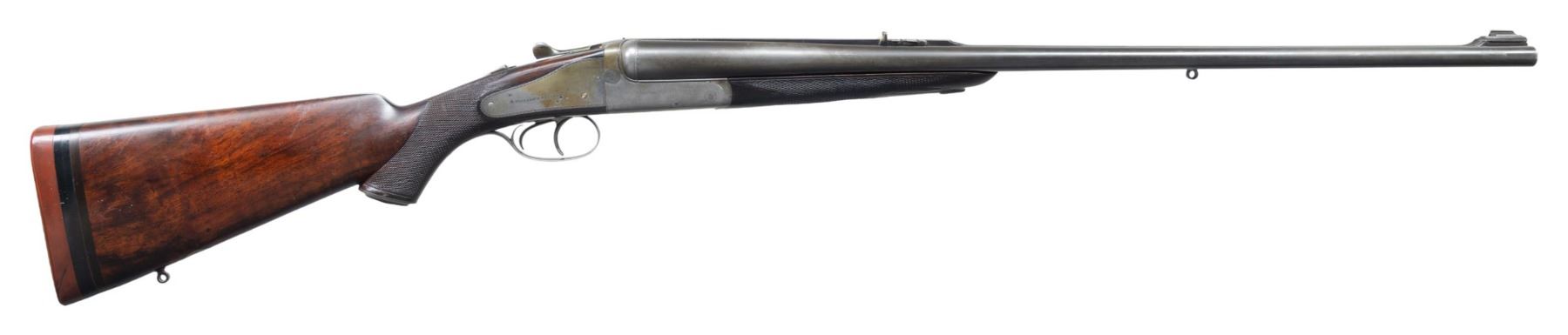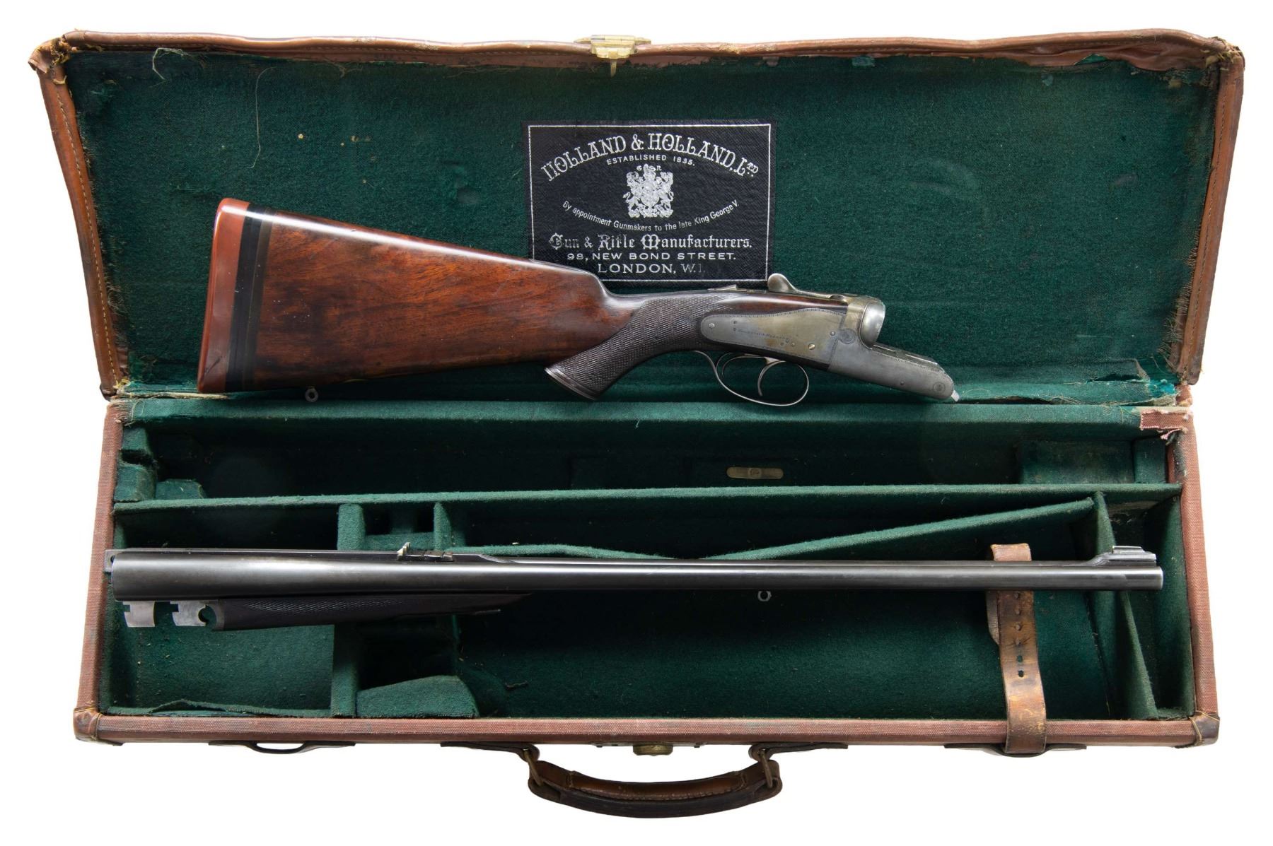 DANGEROUS GAME DOUBLE RIFLE WITH CASE. Cal. 500/450 Nitro. 3-1/4". S# 17926 (1905). Built just before the military caliber (.450) rifles were banned in the colonies resulting in production of .465, .470s, etc. This unrestored rifle is in a very highly regarded big game cartridge. The 26" chopper lump barrels are fitted with a quarter rib holding one standing two folding leaf express rear sights. A small white pyramid is glued beneath the "V" of the standing sight. Typical H&H style front ramp holds white front bead. Tops of barrels are engraved "Holland & Holland" "98 New Bond Street London." "Winners of all the Field Rifle Trials London". Barrel flats are stamp with London nitro proofs for 70 grains cordite and 480 grain bullet. S# is on the bottom of both barrels and splinter is extra heavy. Case hardened action with hand detachable back spring locks features non-automatic safety, ("SAFE" inlaid in gold), long top strap that extends over comb, hidden crossbolt third fastener, gold band tumbler end cocking indicators, bushed strikers and double triggers. Engraving on action consists of small scroll borders with bottom engraved "Charge" "70 Grains of Cordite" "500/450" "Case 3-1/4 inches". Each lockplate is engraved "Holland & Holland". Takedown lever is engraved "Holland's Patent". Trigger guard has S# on tang which extends to steel trap grip cap holding spare front sight with flip-up night bead wrapped in paper that is printed "For 100 yds +" "Hold at 6 o'clock" "For 50 yds". Pistol grip buttstock made of well marbled and well figured European walnut measures 14-3/4" over red "Old English" pad on two 1/4" spacers. Stock features classic H&H style checkering and shadow line right hand cheekpiece, a vacant gold oval and sling eye are on toeline; matching eye on barrel. Matching splinter forend has pivoting lever release. MEASUREMENTS: WEIGHT: 10 lb. 2 oz. UNATTACHED ACCESSORIES: gun is housed in period reddish canvas leather trimmed case; lined in dark green cloth. A silver embossed black leather label is in lid. A copy of the book "Buffalo Shot Placement and Trophy Evaluation" by Kevin Robertson. Gun is pictured with trophy Cape Buffalo on page 44 of this book. CONDITION: fine; unrestored. Barrels retaining most of their original blue with considerable hand wear and browning at normal carry points. Action and lockplates retain a good amount, perhaps 30% of their original case hardening color, the balance a smooth silver gray. Trigger guard and top lever retain traces of their original blue. A fair amount of case color is on grip cap. Stocks retain most of their original oil finish and show some added oil as maintenance over many minor marks and scratches. Checkering shows considerable wear but is still effective. Bores are bright and shiny with sharp, strong rifling throughout with some slight throat erosion evident in right barrel. Action is tight. Barrels are on face. Mechanically fine. Lock internals are clean and bright. Case is rather tattered and is missing bits of leather trim. Handle is good, as is one strap, others missing. Interior cloth is fair to good with some tatters and shows lifting. Label is good. Simply a good solid double rifle. Consignor states he has shot three Cape Buffalo and won a number of shooting championships with this fine rifle. (25-3423/MGM). CURIO. $13,000-19,000.