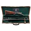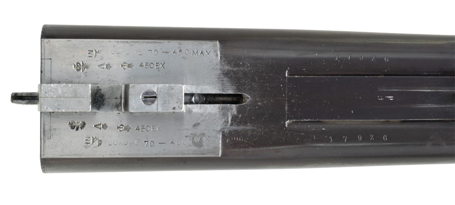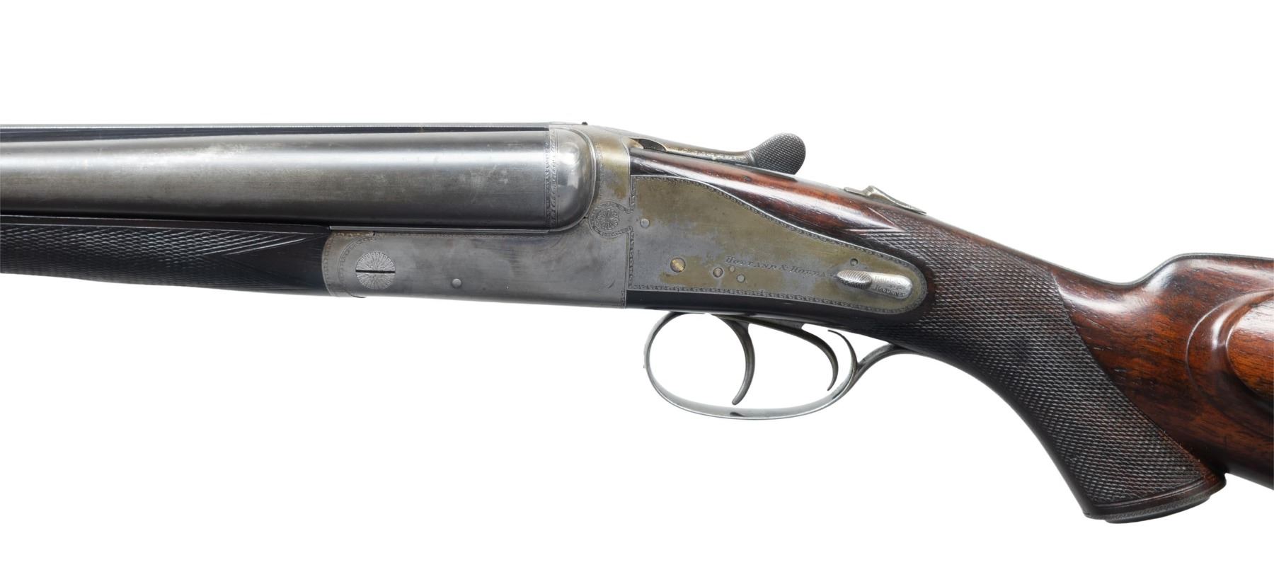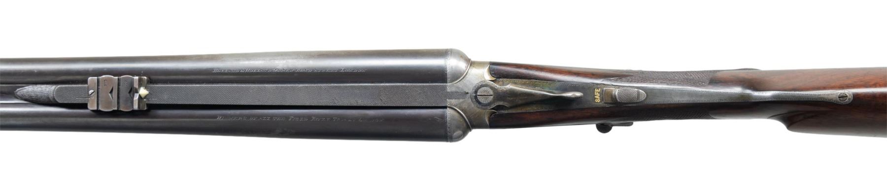 DANGEROUS GAME DOUBLE RIFLE WITH CASE. Cal. 500/450 Nitro. 3-1/4". S# 17926 (1905). Built just before the military caliber (.450) rifles were banned in the colonies resulting in production of .465, .470s, etc. This unrestored rifle is in a very highly regarded big game cartridge. The 26" chopper lump barrels are fitted with a quarter rib holding one standing two folding leaf express rear sights. A small white pyramid is glued beneath the "V" of the standing sight. Typical H&H style front ramp holds white front bead. Tops of barrels are engraved "Holland & Holland" "98 New Bond Street London." "Winners of all the Field Rifle Trials London". Barrel flats are stamp with London nitro proofs for 70 grains cordite and 480 grain bullet. S# is on the bottom of both barrels and splinter is extra heavy. Case hardened action with hand detachable back spring locks features non-automatic safety, ("SAFE" inlaid in gold), long top strap that extends over comb, hidden crossbolt third fastener, gold band tumbler end cocking indicators, bushed strikers and double triggers. Engraving on action consists of small scroll borders with bottom engraved "Charge" "70 Grains of Cordite" "500/450" "Case 3-1/4 inches". Each lockplate is engraved "Holland & Holland". Takedown lever is engraved "Holland's Patent". Trigger guard has S# on tang which extends to steel trap grip cap holding spare front sight with flip-up night bead wrapped in paper that is printed "For 100 yds +" "Hold at 6 o'clock" "For 50 yds". Pistol grip buttstock made of well marbled and well figured European walnut measures 14-3/4" over red "Old English" pad on two 1/4" spacers. Stock features classic H&H style checkering and shadow line right hand cheekpiece, a vacant gold oval and sling eye are on toeline; matching eye on barrel. Matching splinter forend has pivoting lever release. MEASUREMENTS: WEIGHT: 10 lb. 2 oz. UNATTACHED ACCESSORIES: gun is housed in period reddish canvas leather trimmed case; lined in dark green cloth. A silver embossed black leather label is in lid. A copy of the book "Buffalo Shot Placement and Trophy Evaluation" by Kevin Robertson. Gun is pictured with trophy Cape Buffalo on page 44 of this book. CONDITION: fine; unrestored. Barrels retaining most of their original blue with considerable hand wear and browning at normal carry points. Action and lockplates retain a good amount, perhaps 30% of their original case hardening color, the balance a smooth silver gray. Trigger guard and top lever retain traces of their original blue. A fair amount of case color is on grip cap. Stocks retain most of their original oil finish and show some added oil as maintenance over many minor marks and scratches. Checkering shows considerable wear but is still effective. Bores are bright and shiny with sharp, strong rifling throughout with some slight throat erosion evident in right barrel. Action is tight. Barrels are on face. Mechanically fine. Lock internals are clean and bright. Case is rather tattered and is missing bits of leather trim. Handle is good, as is one strap, others missing. Interior cloth is fair to good with some tatters and shows lifting. Label is good. Simply a good solid double rifle. Consignor states he has shot three Cape Buffalo and won a number of shooting championships with this fine rifle. (25-3423/MGM). CURIO. $13,000-19,000.