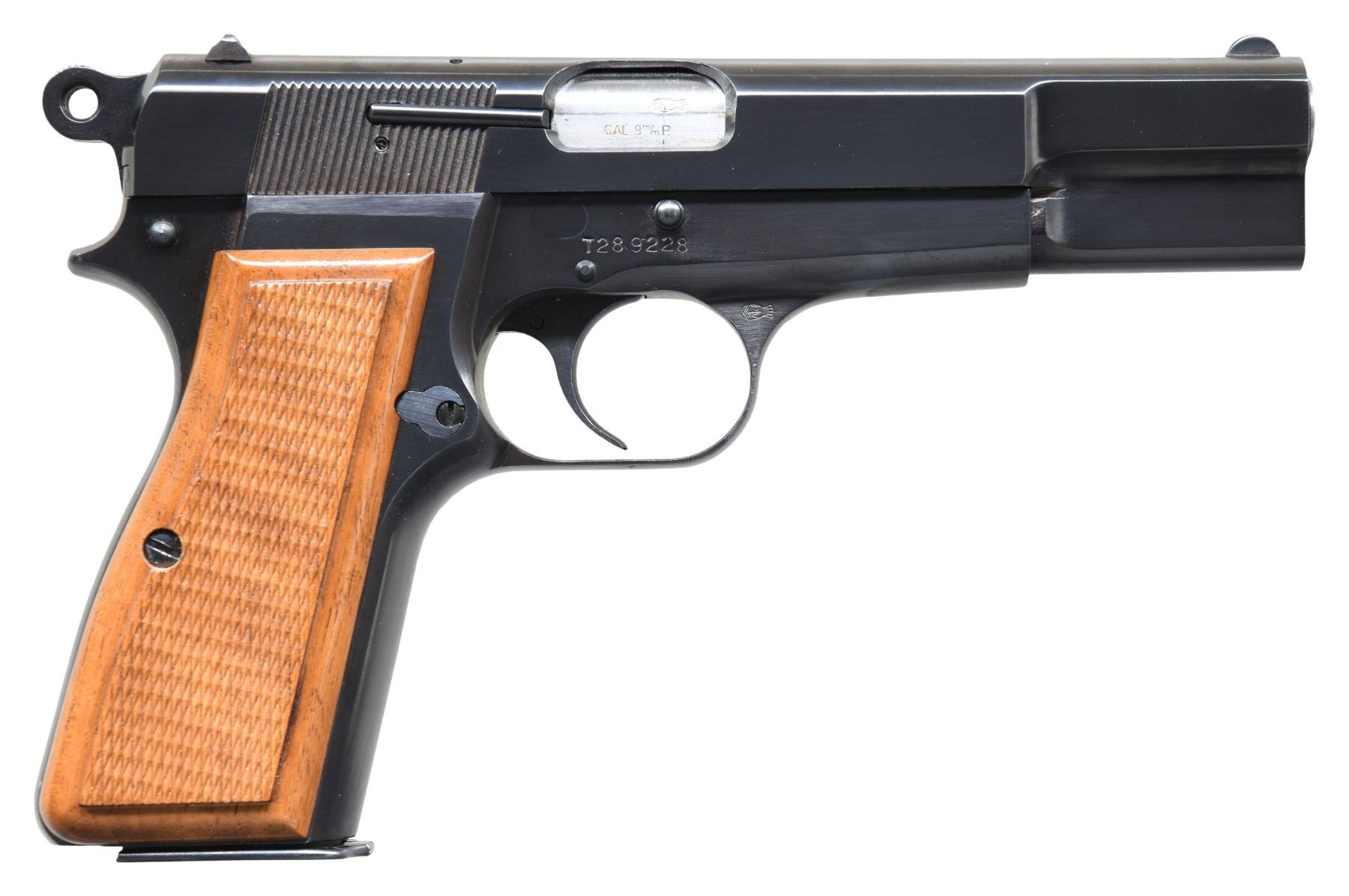 SEMI-AUTOMATIC PISTOL. Cal. 9mm Luger. S# T289228. Bbl. 4 5/8". Hi Power semi-automatic pistol mfg. in Belgium by Fabrique Nationale and imported by Browning Arms Company in 1968. The left side of the slide is marked with Browning's importer information above "MADE IN BELGIUM". Right side of the forward trigger guard web and 2-piece bbl. exhibit a Belgian commercial proof. Metal components exhibit a blue finish overall, save for on the slide, which is polished in-the-white. Frame is mounted with 2-piece varnished checkered wood grips, which feature red anti-moisture barrier paint on the interior of the panels. Slide features an external extractor, with a fixed half-moon blade front sight and dovetailed U-notch rear sight. MAGS: 1 dull blue 13-rd. mag., with polished blue button type floorplate. UNATTACHED ACCESSORIES: black leather Browning soft case. CONDITION: extremely fine, with metal components retaining bountiful amounts of their original factory blue finish, exhibiting a few light superficial handling marks, with an approx. 1 5/8" scratch present on the left side of the slide. Brilliant mirror bore, exhibiting sharp and well defined rifling throughout. Grips are excellent overall. PROVENANCE: The Estate Collection of Charles Wagner. (25-427/MLW). CURIO. $750-1,000.
