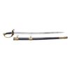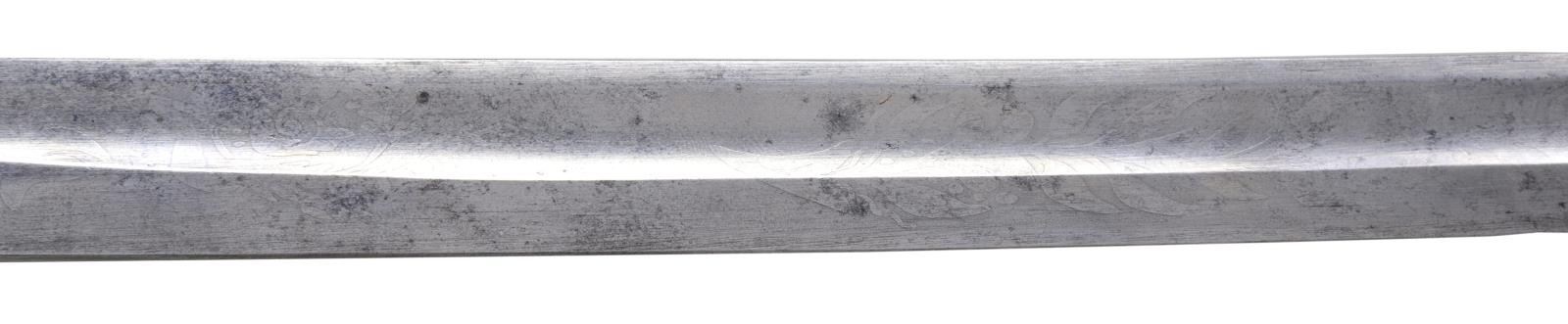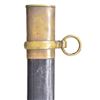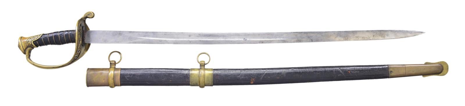 SWORD. Boyle & Gamble, Richmond, VA was the largest maker of officer swords in the Confederacy, finding beautiful "as found" examples however is rare. You will not find a more perfect & pleasing example in original scabbard of the pattern, wonderful brass patina, perfect scabbard leather, near perfect leather grip. Blade has especially long 3.5” flat ricasso showing forging “flaw” of iron tang blacksmith welded to steel blade, retaining protective leather washer so sword is tight. 15” etched patriotic panels include panoplies of arms on each ricasso, one with battleflag above shield with “CSA”. The original Boyle & Gamble scabbard is characteristic glued & sewn edge construction with pinned brass mounts and fits perfectly. CONDITION: fine overall, 29.5" blade retains much of its original luster, with staining and pinprick pitting, etched panels mostly discernable. Brass hilt & scabbard mounts have matching light/medium mustard patinas. Leather grip & single copper wire wrap are tight & complete except few well patinaed chips unaffecting aesthetic. Original scabbard is fine overall, retaining most of its original black polished surface with craquelure. (02-19422/JS). $7,000-9,000.