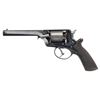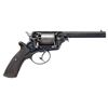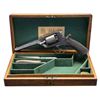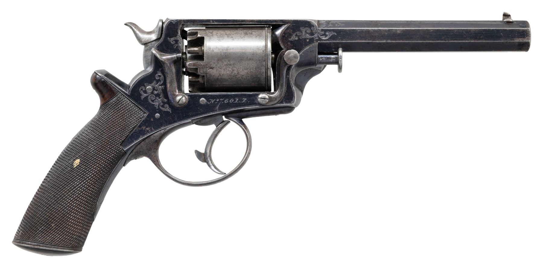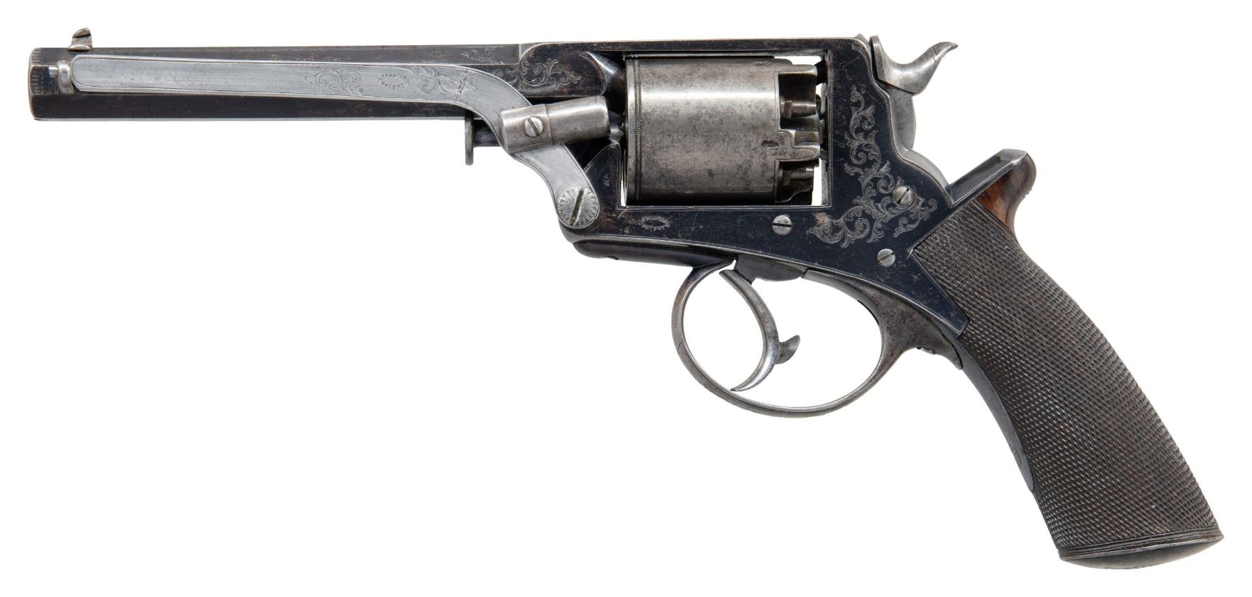 REVOLVER. Cal. 54 bore (~.45). S# 7601 T. Standard configuration, 6" octagonal unmarked barrel, integral notched rear sight, loading assembly marked "TRANTERS PATENT" attached to left side of frame which has scroll engraving en suite to frame, trigger guard, and butt cap, single trigger with spur. S# engraved on right side of frame "No. 7601 T", mounted with one piece checkered walnut grips. Revolver is housed in an original turquoise baize lined oak casing compartmented for revolver, Dixson powder flask, brass 54 bore "Adam's Patent" 2 cavity bullet mold, green label Fletcher cap tin. This was a popular revolver worldwide, many in this serial range have Southern agent marks, Hyde & Goodrich, New Orleans; Radcliffe, Columbia, SC; Guion, New Orleans are examples. S# 7993 is inscribed to Dabney Maury who would become Confederate general. CONDITION: revolver is fine overall, retaining 90% bright original blue finish on barrel & frame, cylinder is overall silver/gray patina. Casing is good overall with "LONDON ARMORY" label, accouterments are fair to good. Revolver is mechanically fine and works in both single & double action, bright rifled bore. PROVENANCE: Estate Collection of John "Jack" Dhooghe. (01-28224/JS). ANTIQUE. $3,000-5,000.