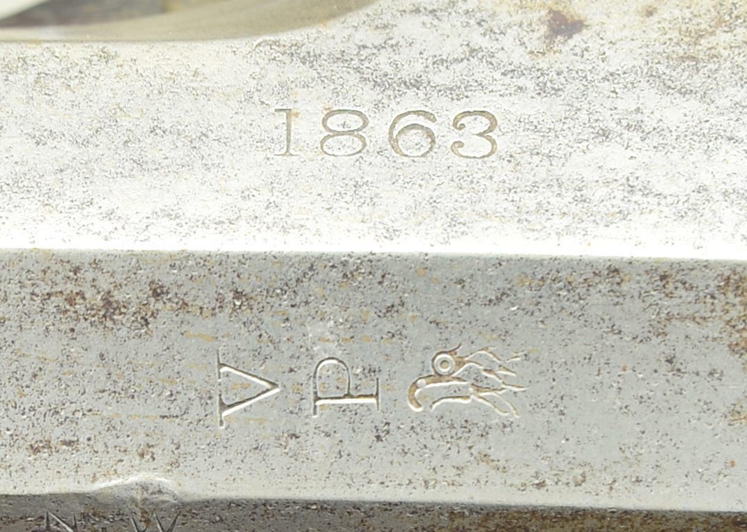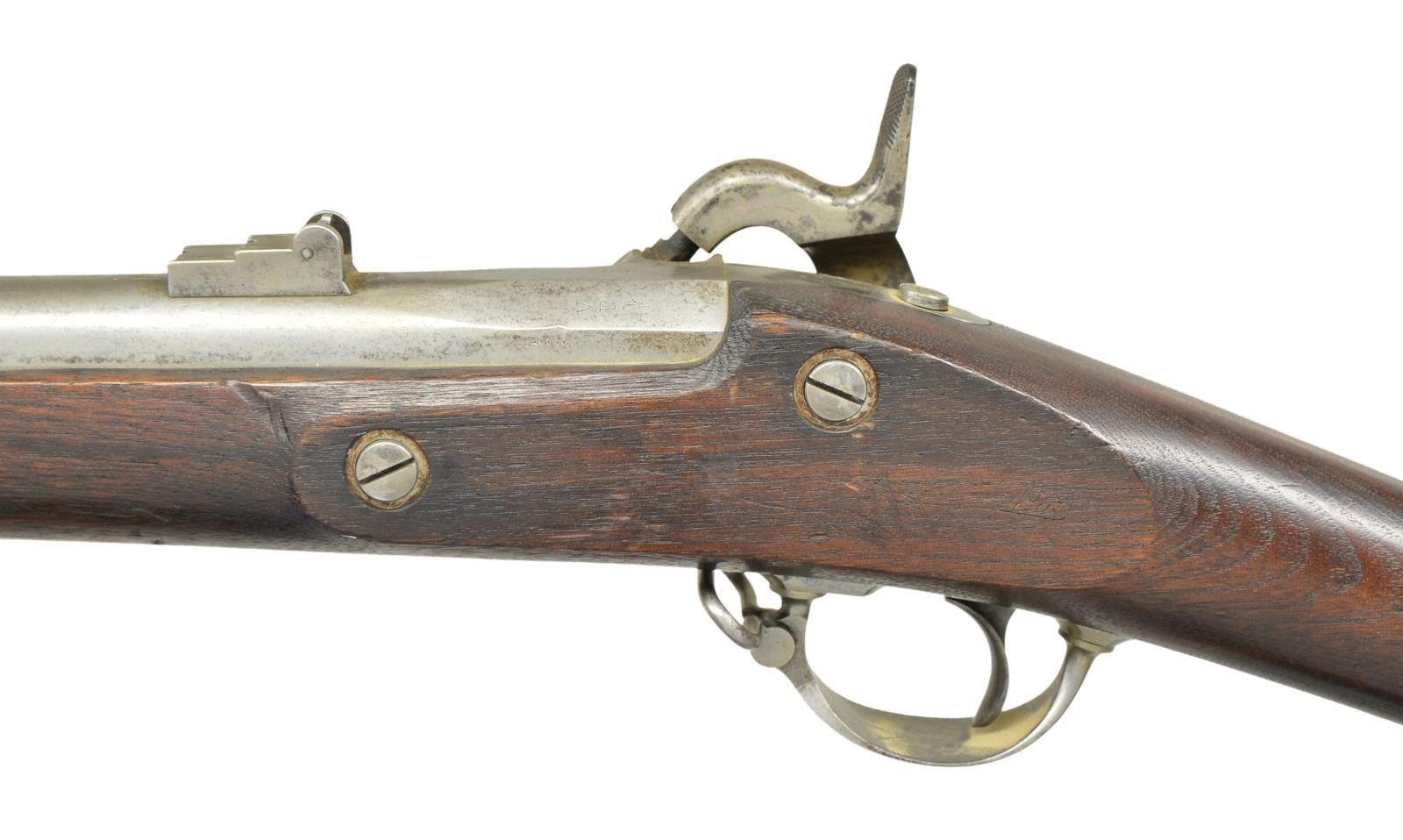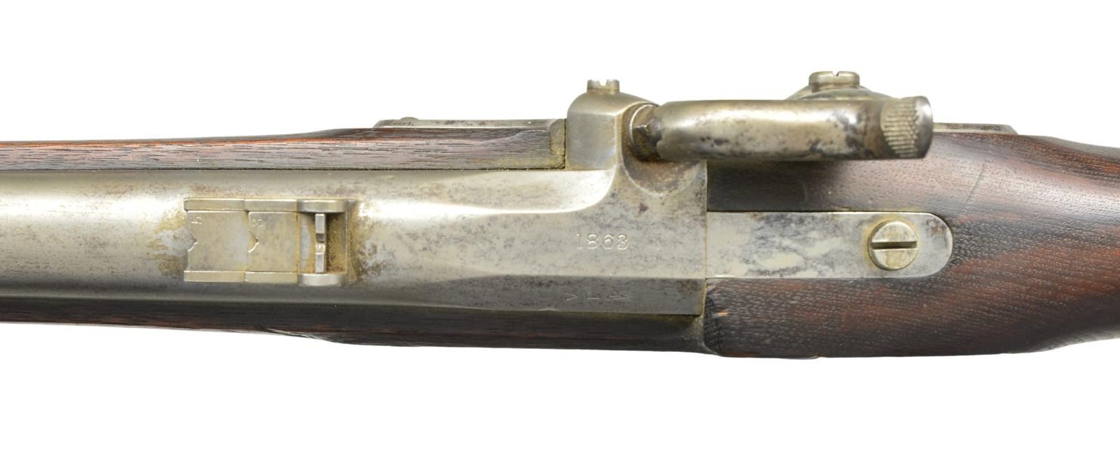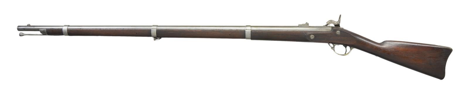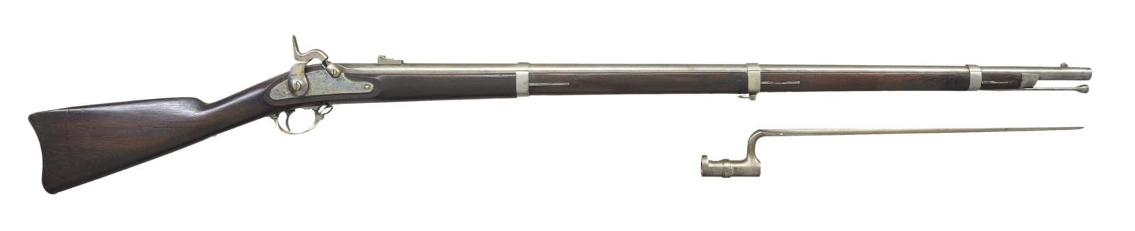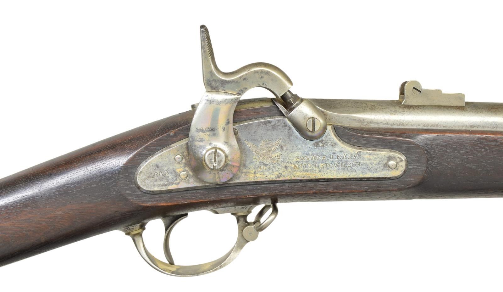 VP / eaglehead proofs, “N.W.” inspection on breech, 3 position rear sight, 3 flat spring retained barrel bands. Lock marked with spread wing eagle over “U.S.” & “SAVAGE R.F.A. Co / MIDDLETOWN. CON” & “1863” at tail. Walnut stock has inspection initials & cartouche. Buttplate surcharged “US”. Bayonet has 18.5” blade with US surcharge. This is superior condition survivor, original, & complete. PROVENANCE: Michael E. Bray estate collection. CONDITION: very good to fine overall, crisp markings, metal cleaned, mostly bright, stained, stock is sound with sharp edges, very good discernible cartouche & inspection initials. Mechanics fine, bright crisp rifled bore. Bayonet is very good. (01-23300/JS). ANTIQUE. $2,000-3,000.