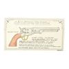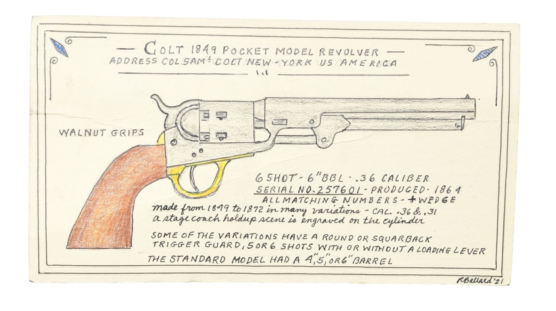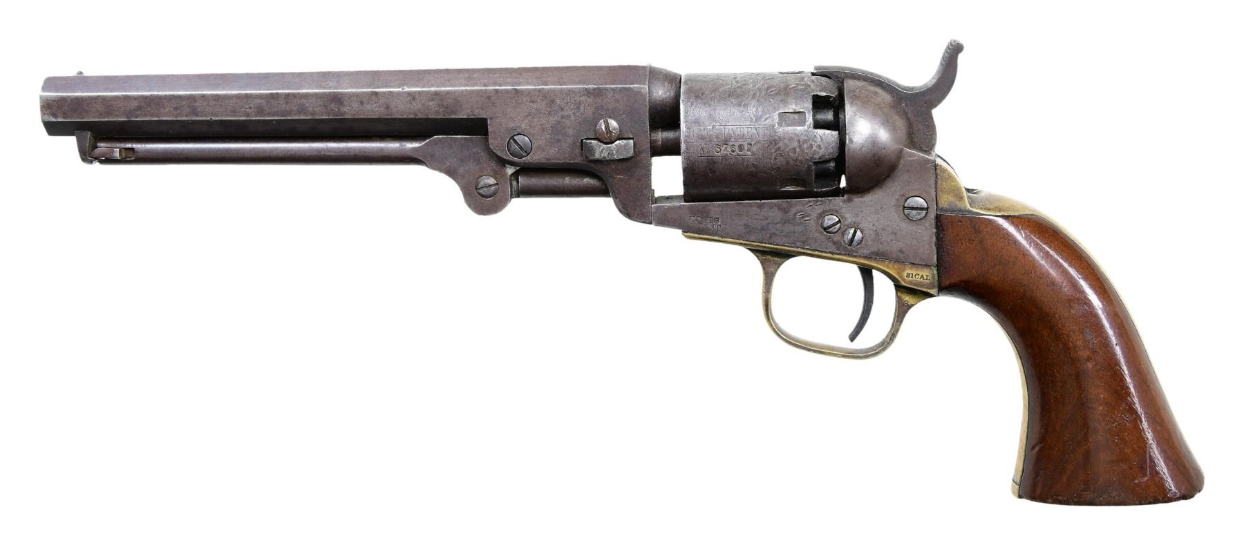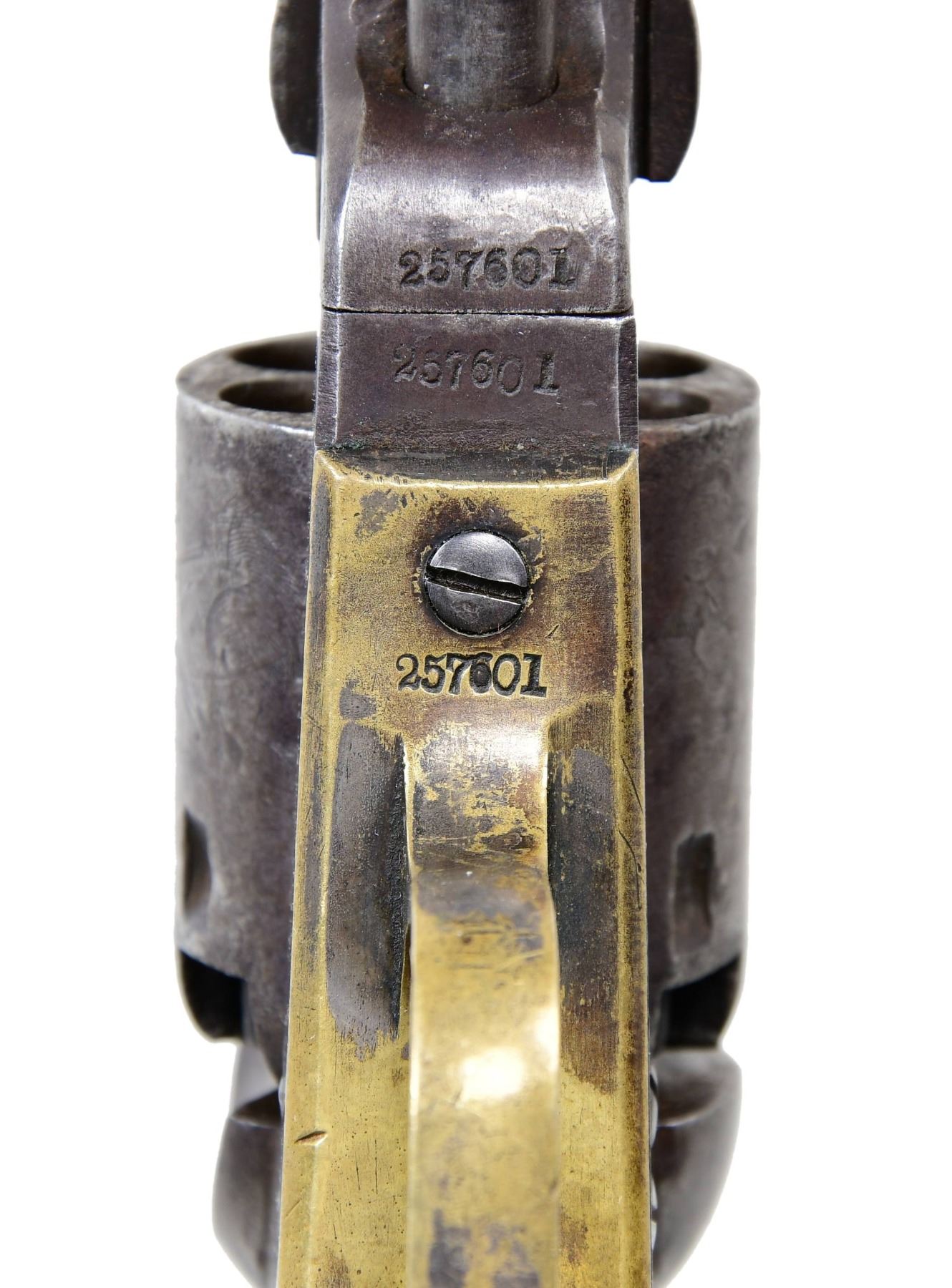 Cal. 31. S# 257601. Standard configuration made during height of Civil War early 1864, 6" octagonal barrel with 1-line NEW YORK US AMERICA address, small "COLT'S / PATENT" right side of frame, stagecoach holdup scene rolled 6-shot cylinder. Brass trigger guard and backstrap hold varnished walnut grips. UNATTACHED ACCESSORIES: hand drawn colored collection card by Roger Ballard. CONDITION: very good overall, all matching and complete, most of "stagecoach holdup" cylinder scene visible, dark plum/gray metal, traces of finish. Mechanically fine, good rifled bore, grips retain most of their original factory varnish. PROVENANCE: Roger Ballard collection. (01-26585/JS). $800-1,200.
