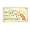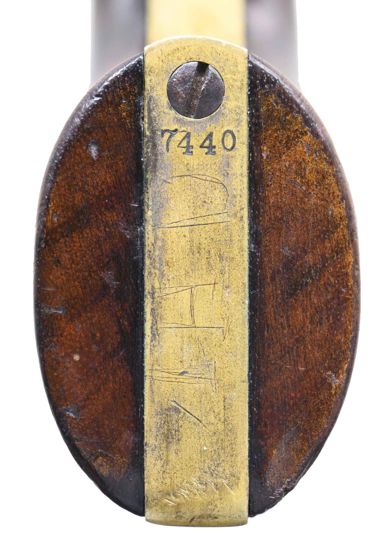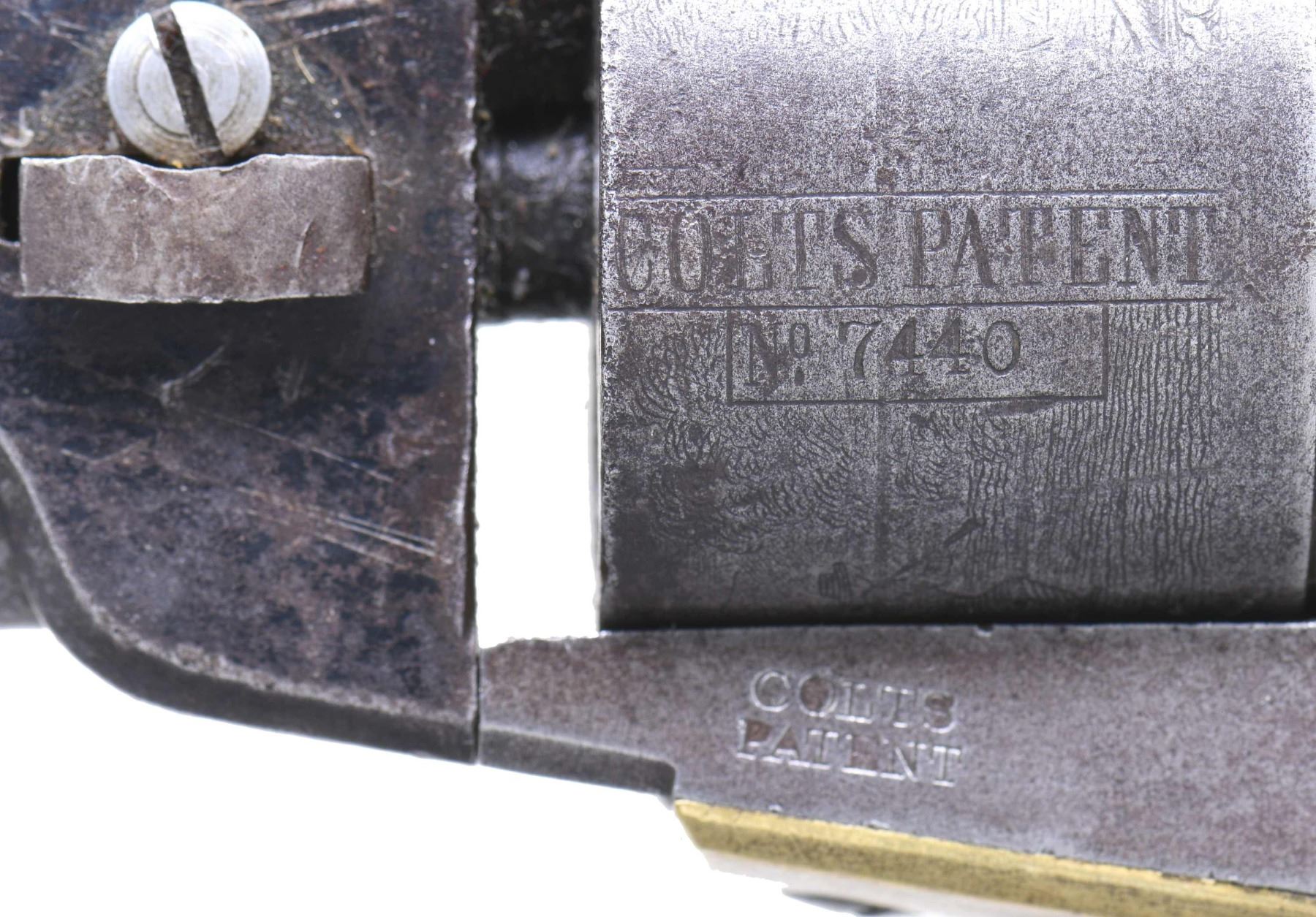 Cal. 36. S# 7440. Standard configuration made during Civil War in first year of production 1861, 4.5" octagonal barrel with 1-line NEW YORK US AMERICA address, small "COLT'S / PATENT" right side of frame, stagecoach holdup scene rolled 5-shot cylinder. Brass trigger guard and backstrap hold varnished walnut grips. Initials scratched in butt strap like seen on many Civil War rervolvers. UNATTACHED ACCESSORIES: hand drawn colored collection card by Roger Ballard. CONDITION: very good overall, all matching and complete, most of "stagecoach holdup" cylinder scene visible, dark plum/gray metal, traces of finish. Mechanically fine, good rifled bore, grips retain most of their original factory varnish. PROVENANCE: Roger Ballard collection. (01-26584/JS). $800-1,200.