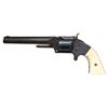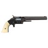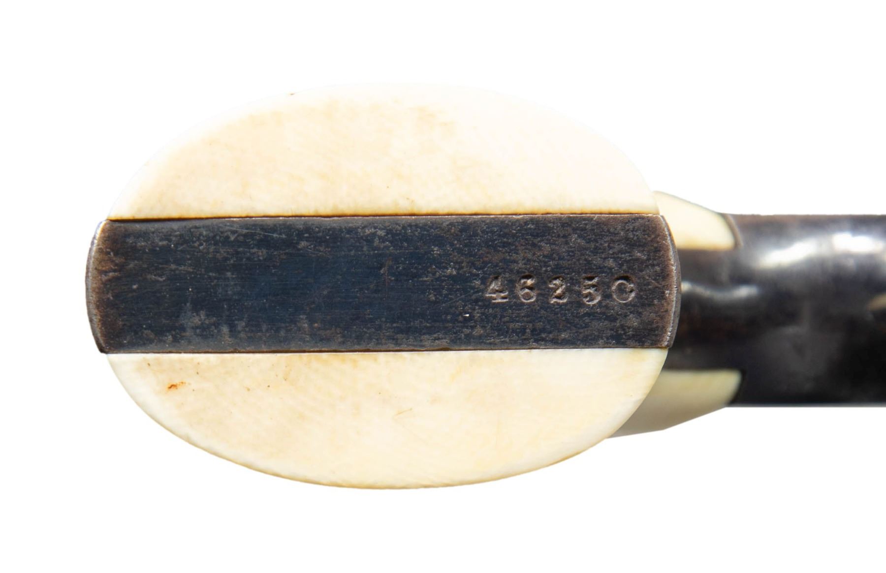 WITH FACTORY GRIPS. Cal. 32. S# 46250. This revolver is standard 1865 manufactured S&W No. 2 army revolver, 6" barrel, 1-line address. CONDITION: fine overall, retains about 90% bright factory blue with scattered rusted areas, all matching, good markings, smooth ivory grips well fit and toned patina, mechanically fine, crisp rifled bore. (01-28162/JS). ANTIQUE. $1,500-2,000.