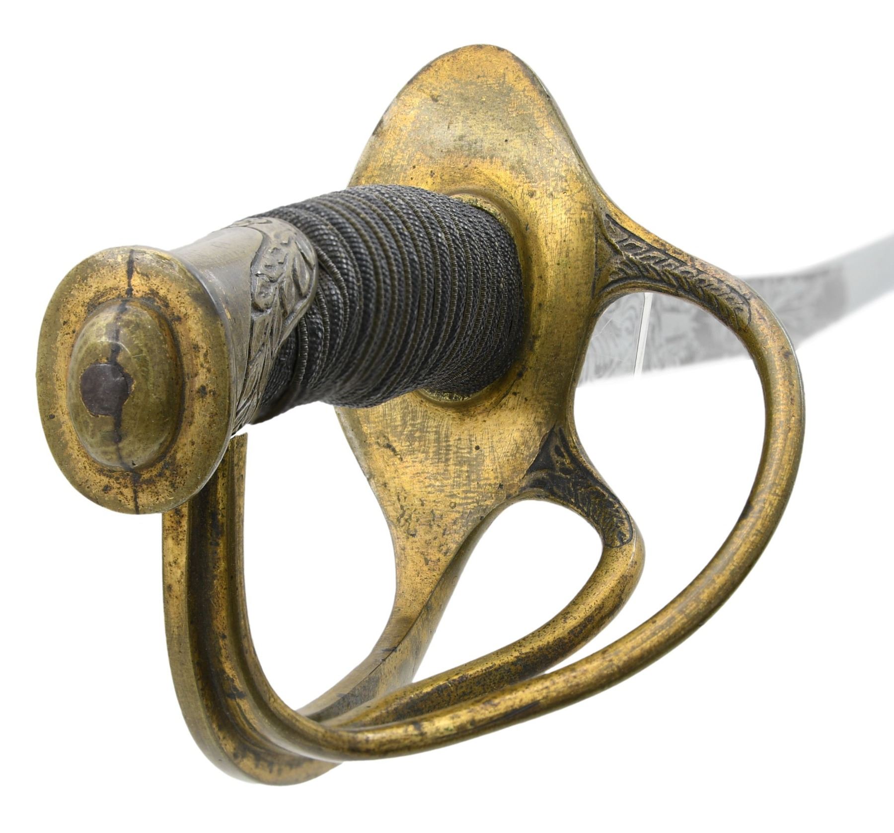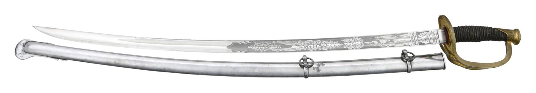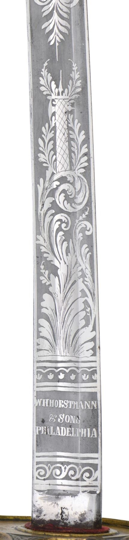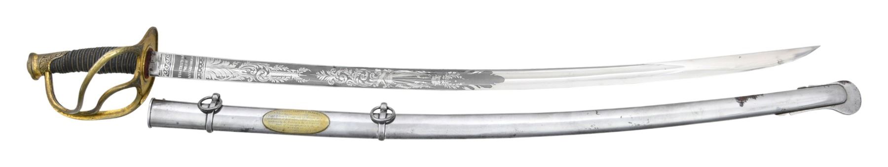 CAVALRY OFFICER'S SABER, LT. SAMUEL PERKINS, 1ST PHILADELPHIA BATTERY. This is a beautiful Horstmann, Philadelphia Cavalry saber with fine 32" patriotically etched blade, Presentation plaque applied to polished steel scabbard "LIEUTENANT SANUEL C. PERKINS / FIRST PHILADELPHIA BATTERY FROM / Capt. Wilcox's company of MINUTE MEN / as a token of their appreciation of the services / rendered by the battery in the defense of the State of Pennsylvania in the SUMMER of 1863 / Carlisle, Sporting Hill". UNATTACHED ACCESSORIES: nicely compiled history of Samuel Perkins including his service in the Gettysburg campaign which the sword was presented in commemoration of. A facsimile of a CDV showing Lieutenant Perkins in uniform with a cavalry saber, probably this one. CONDITION: fine overall, blade retains virtually all of its original luster and etched panels, perfect point. Shark skin grip is complete with tight wrapped triple wire, light scuffing to high points. Decorated brass hilt has much of its original gold plate with balance olive patina. Scabbard is equally fine with good steel polish, a few scattered areas of staining and pitting. Scabbard retains it's original protective wood liner and red cloth protective washer. (02-24429/JS). NON-GUN. $3,000-5,000.