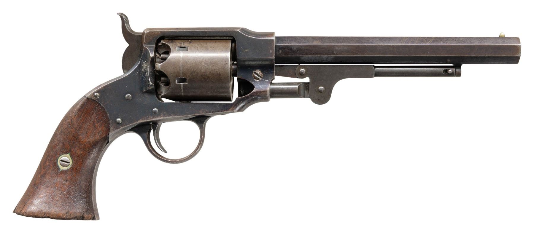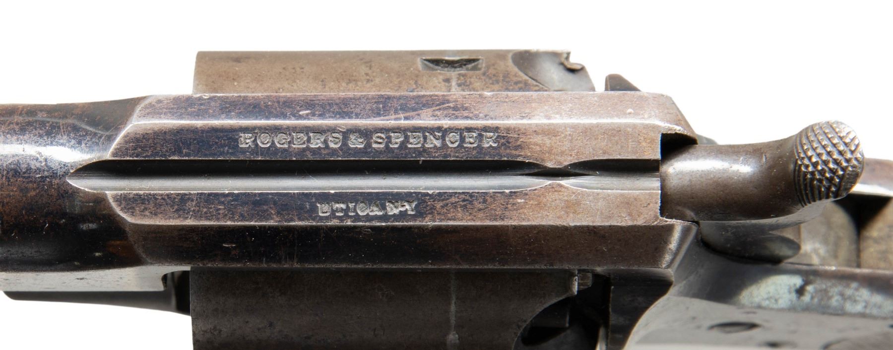 Cal. 44. S# 1535. Standard configuration, 7.5" octagonal barrel, solid frame, slotted top strap stamped: "ROGERS & SPENCER / UTICA, NY". Sharply flared grips at butt, inspector cartouched on left. CONDITION: very good to fine overall, revolver retains about 40-50% bright thinning original blue on barrel & frame, cylinder is gray with traces of blue, crisp markings. Grips have tacking on butt, heavy edge wear, large chip on left side removing portion of crisp inspection cartouche. Mechanics are fine, bright shiny rifled bore. PROVENANCE: The Esteemed Norm Greenberg Collection. (01-27674/JS). ANTIQUE. $1,200-1,800.