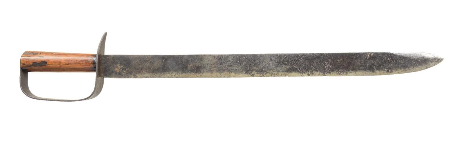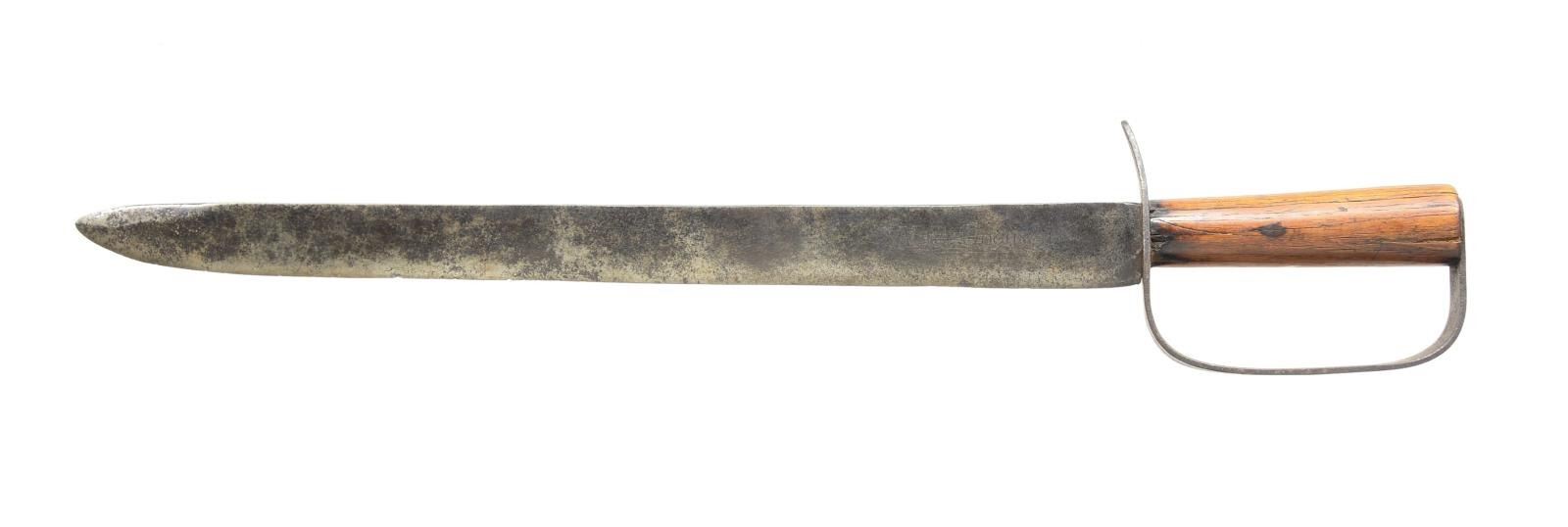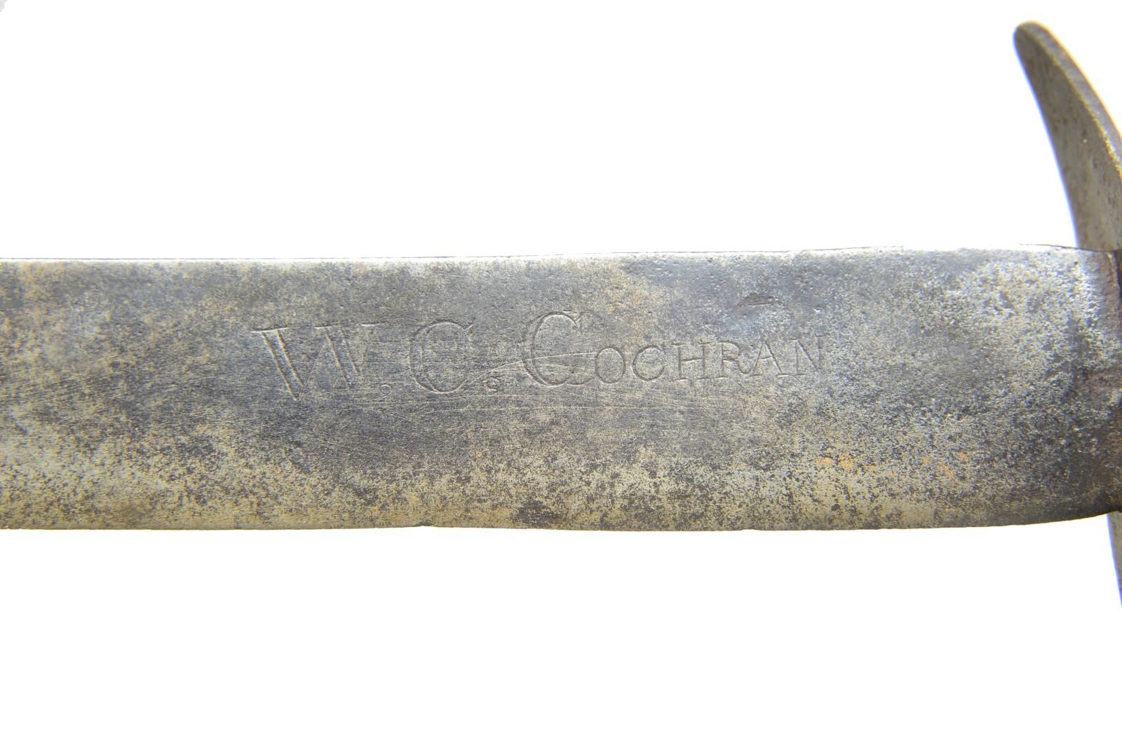 BELONGING TO W.C. COCHRAN OF THE 22ND GEORGIA. Overall length: 22 1/8". Blade length: 17 1/2". A classic Civil War Confederate, southern made, D- guard bowie knife w/ an exceptionally long blade that has a rare ID etched into the blade. The straight, nearly untapered blade appears to be a spear point at first glance but actually has a 2 1/2" false edge. The blade is etched, “W. C. COCHRAN” in absolutely period etching. Iron D-guard of classic form w/ turned wood handle that appears to be oak. We could locate 6 Confederate soldiers named W. Cochran or W. C. Cochran. No scabbard. UNATTACHED ACCESSORIES: An old paper that accompanied the knife reads, “GEORGIA D-GUARD BOWIE CLASSIC STYLE WITH ID ON BLADE. “W.C. COCHRAN” PAULDING COUNTY GEORGIA ENLISTED 4-12-62 CO C GA 22ND INFANTRY ARMY OF NORTHERN VIRGINIA GETTYSBURG 2ND MANASSAS MALVERN HILL”. CONDITION: blade has a mottled gray patina w/ scattered areas of cleaned light pitting. The engraved name is quite clear. Guard is undamaged. Grip shows expected wear w/ scattered dents & dings. There is notable iron staining extending up from the guard & down from the pommel. (02-15885/BF). $2,000-2,800.