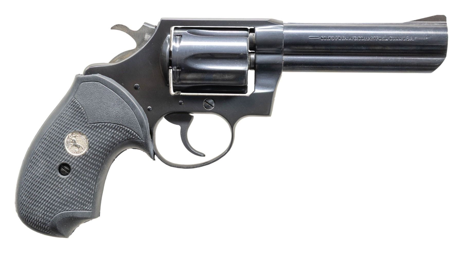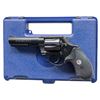 REVOLVER. Cal. 38 Spl. S# RD0544. Bbl. 4". Police Positive MK V double action revolver mfg. by Colt in 1993. Left side of the bbl. is marked with the model and cal. designations, with Colt's single line address marked on the right. Left side of the frame is marked with the Rampant Colt logo. Metal components exhibit a blue finish overall, save for on the sides of the hammer, which are polished in-the-white. Frame is mounted with a 1-piece Colt silver medallion checkered grip. Blade front sight with frame square notch rear sight. UNATTACHED ACCESSORIES: factory blue plastic hard case. CONDITION: fine, with metal components retaining virtually all of their original factory finish overall. Cyl. bears a light dragline. Sides of hammer show some spots of light oxidation. Mirror bore, retaining well defined rifling throughout. Proper manual mechanics. Grip is excellent overall. (25-5103/MLW). MODERN. $1,000-1,500.