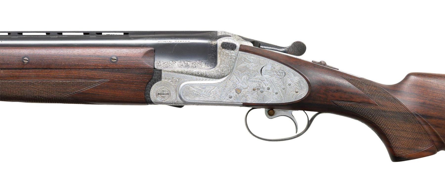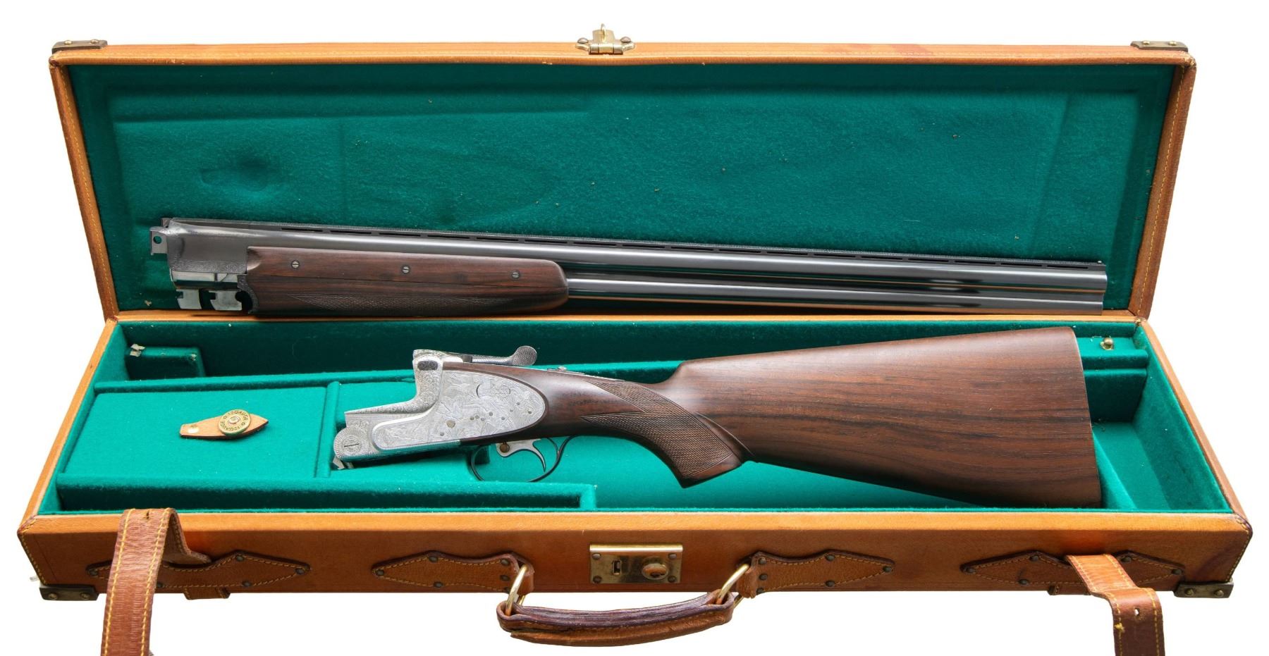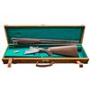 SINGLE TRIGGER GAME GUN WITH CASE. Cal. 12 Ga. 2-3/4". S# 336288. The 28" demi-bloc barrels with low matted ventilated rib have maker's name and address engraved on tops at rear. Coin finished double Kirsten action is fitted with automatic safety, hand detachable sidelocks, gold plated internals, gold line tumbler end cocking indicators and single selective trigger. Action is engraved with full coverage nicely cut shaded scroll with maker's name and address on either side. Lockplates are engraved with game scenes with group of rising mallards on left and pheasant in woodlands on right. S# is on blued trigger guard tang. Pistol grip buttstock made of well veined and lightly figured European walnut measures 14-7/8" over checkered wood butt and features chin strap transition to checkered grip. Matching 3 piece ejector forend has Deeley release. MEASUREMENTS: BBLS: Bore Diameter: O .721 . U .722. Restriction: O .026 (IMod). U .012 (Light Mod). Wall thickness: O .032. U .032. STOCK: DAH: 2-5/16". DAC: 1-1/2". CAST: about 1/2" off. LOP: 14-7/8". WEIGHT: 8 lb. 1 oz. UNATTACHED ACCESSORIES: gun is housed in original tan leather case with brass corners lined in green felt. Includes AYA letter dated 2015 describing the No. 37 in Spanish. Letter gives year of mfg. for this gun as 1970 & further states "CURRENT PRICE: for a NEW ONE: USA $18,138.00". CONDITION: exceptionally fine nearly "as new" with only a few minor handling and assembly marks in all factory finishes. Bores are bright and shiny. Mechanically crisp. Case is very fine, leather with water stains; interior with some rubs. (25-7012/MGM). CURIO. $4,000-6,000.