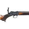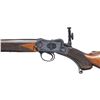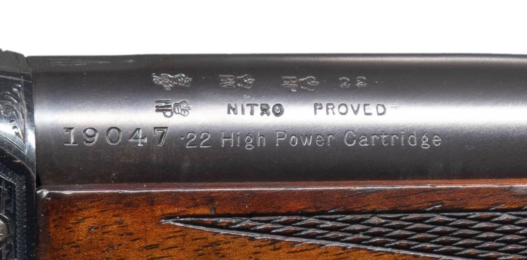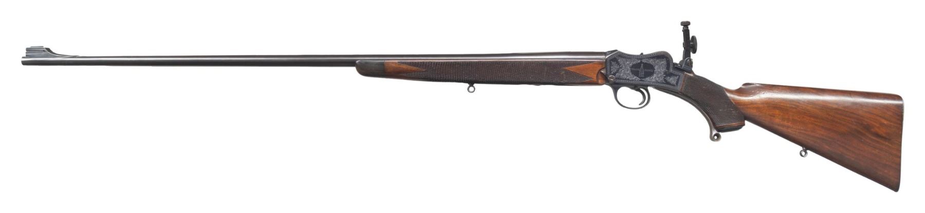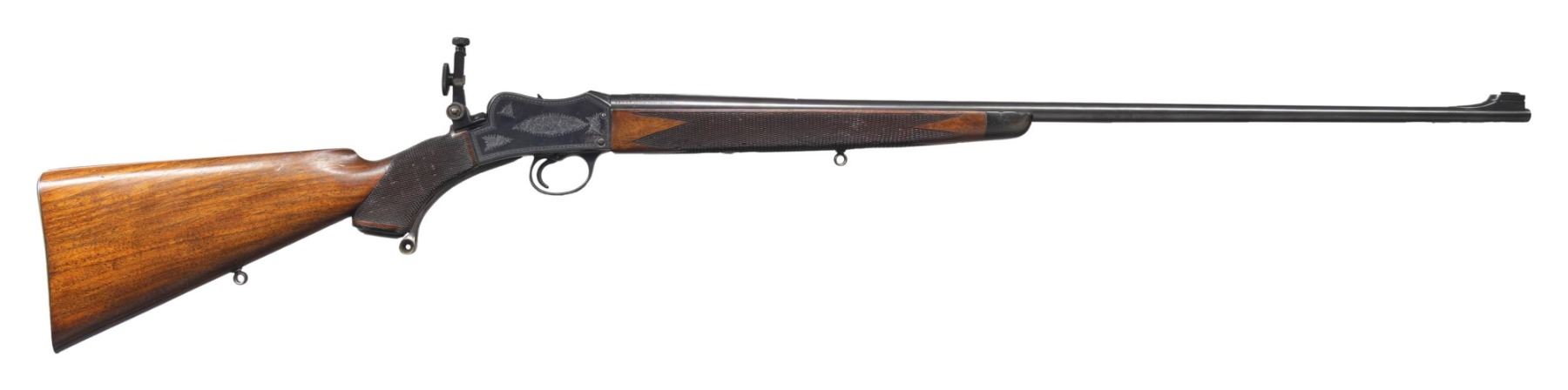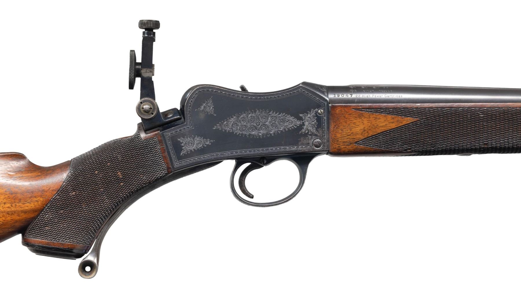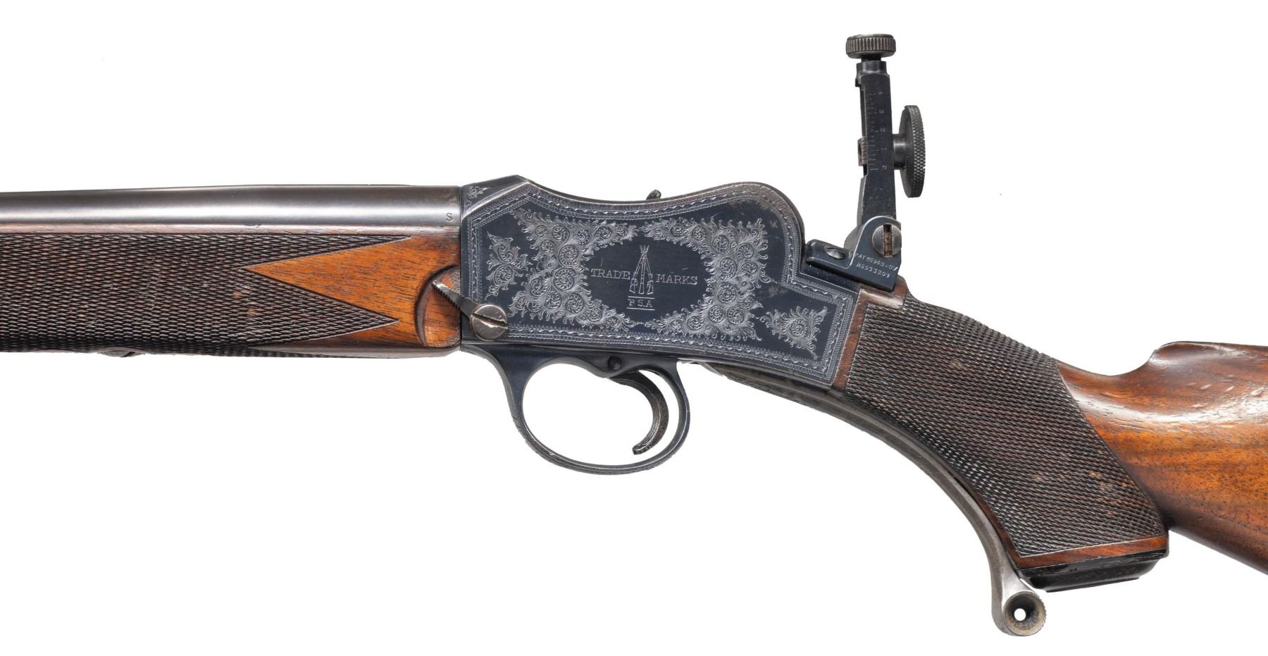 POWER. Cal. 22 Hi Power. S# 19047. The 29-1/2" tapered round barrel fitted with front ramp holding small silver bead, has Birmingham proofs, S# and caliber markings on right rear. Bright blued small Martini action has takedown screw on left side which tightens receiver around barrel. Loosening screw lever allows barrel to be unscrewed once action is opened. Top of action is fitted with BSA patent folding aperture sight adjustable for windage and elevation. Action is engraved with about 70% coverage nicely cut scroll within geometric borders. BSA trademark is on left side. Horn capped pistol grip buttstock made of lightly streaked European walnut measures 14-3/8" over engraved steel buttplate. Grip is checkered with pattern running over the top. Sling eyes are on toeline and matching long forend with horn tip that screws to barrel. CONDITION: very fine plus. Barrel retaining nearly all original rust blue. Action shows some cleaned rust at top left and bottom right, otherwise 85% original bright blue remains. Nearly all case hardening color remains on opening lever and breech block with cartridge channel polished. Stocks retain over 90% original oil finish with many marks and dings. Checkering is dark; lightly worn with some missing diamonds. Bore is sharp and shiny throughout. Mechanically fine. Breech face has been shimmed with paper to insure tight barrel fit. PROVENANCE: Estate of Lloyd Robinson. (25-6681/MGM). CURIO. $2,500-3,500.