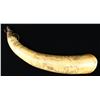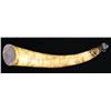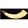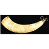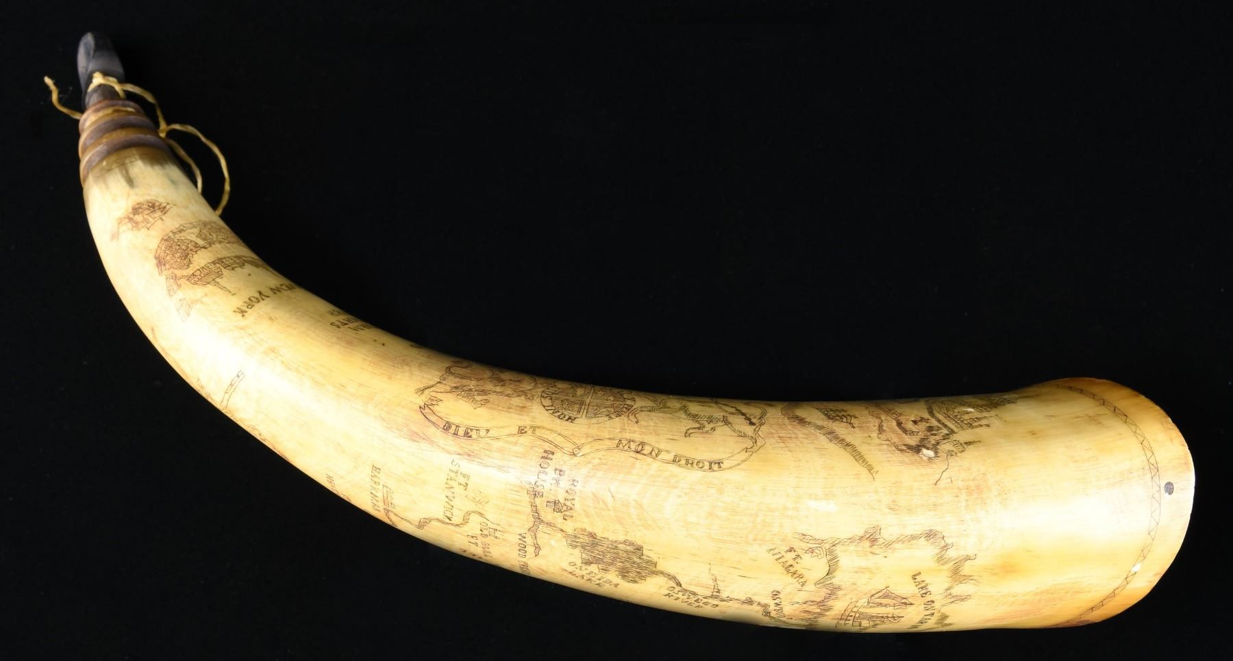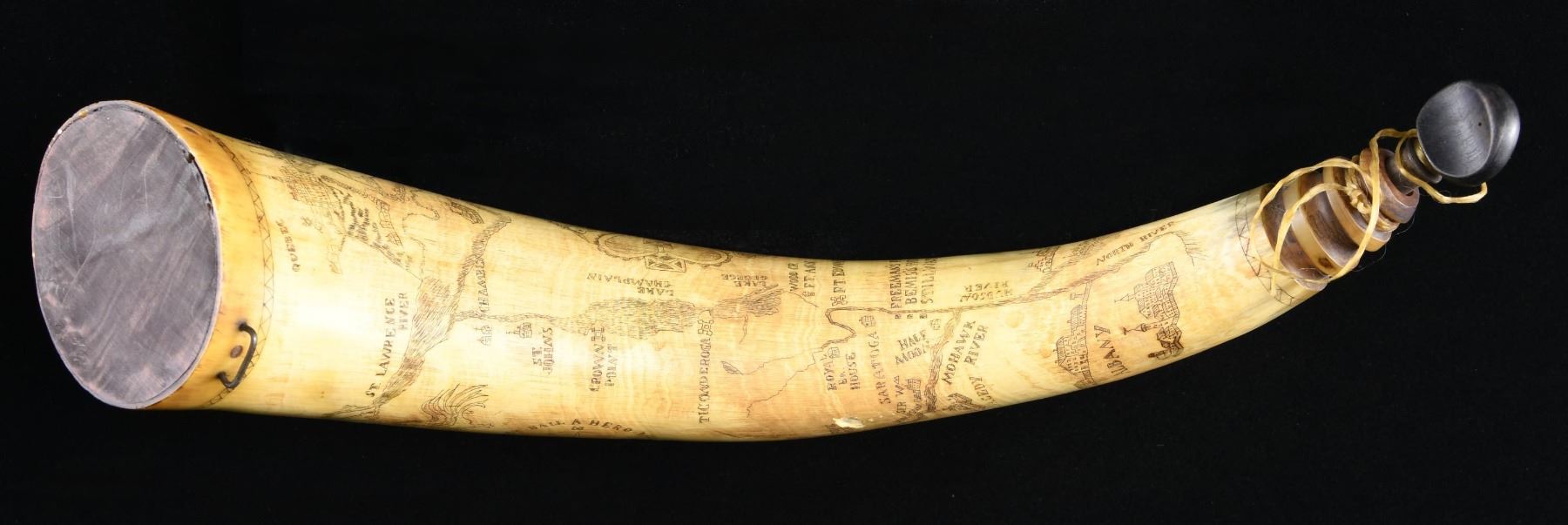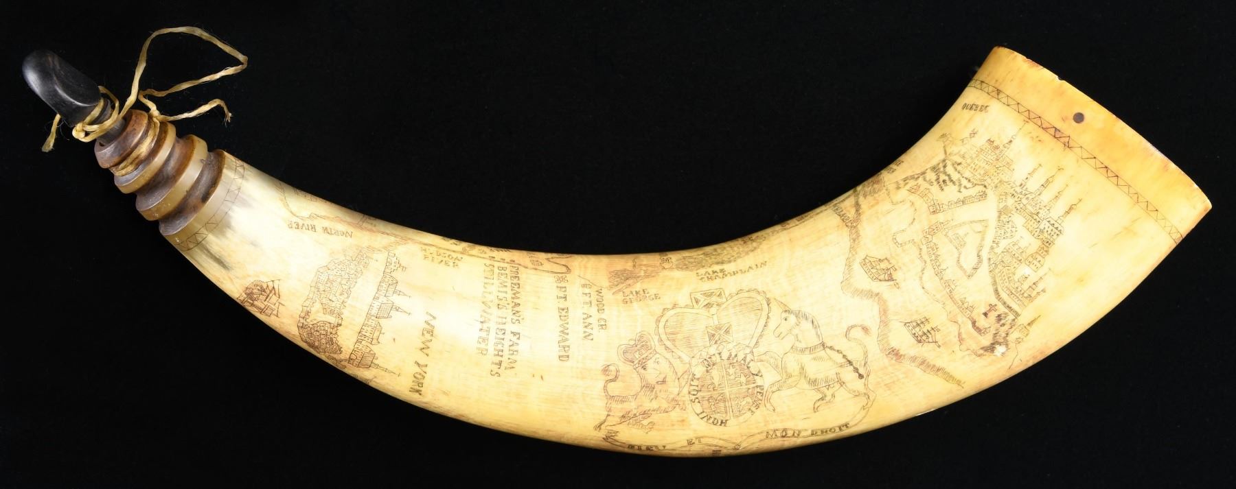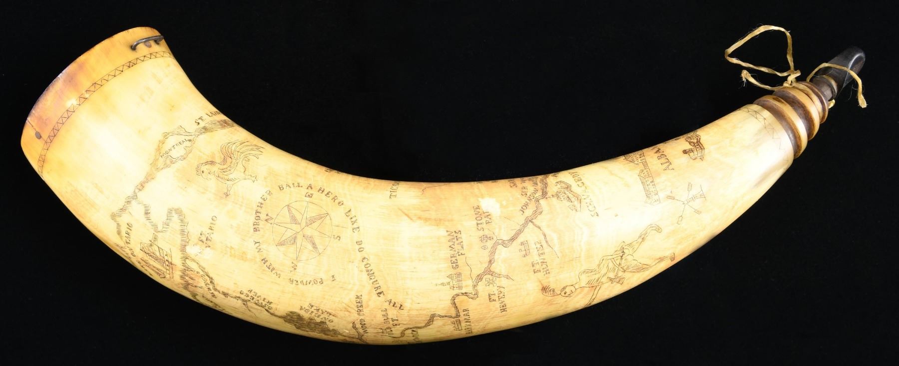 MAP HORN. 16" overall, full coverage, nicely scrimshawed in 18th Century style by Lee Larkin. Horn depicts cities of Albany, New York City with all the forts up to the city of Quebec. Central British Coat of Arms and motto: "POWDER WITH MY BROTHER BALL A HERO LIKE DO CONQUER ALL". Lee Larkin is well known among contemporary horners. CONDITION: fine overall, 4 small areas of insect damage. (02-23975/JS). NON-GUN. $600-800.