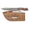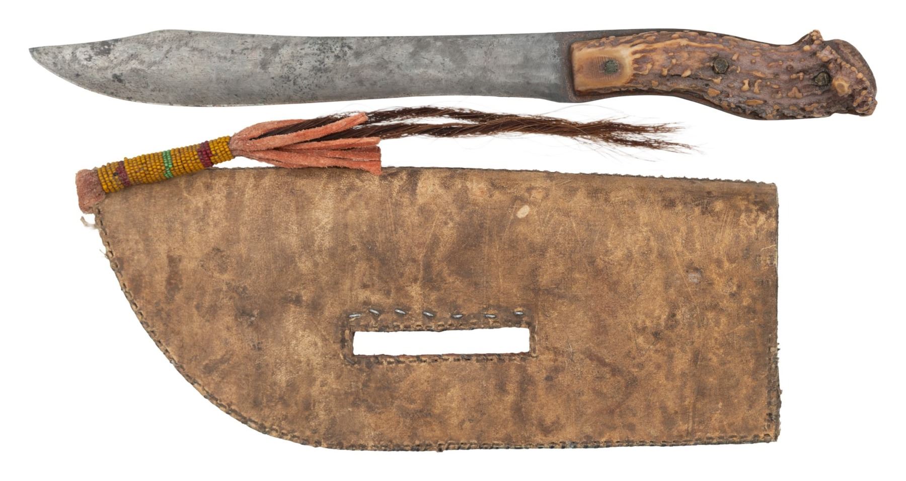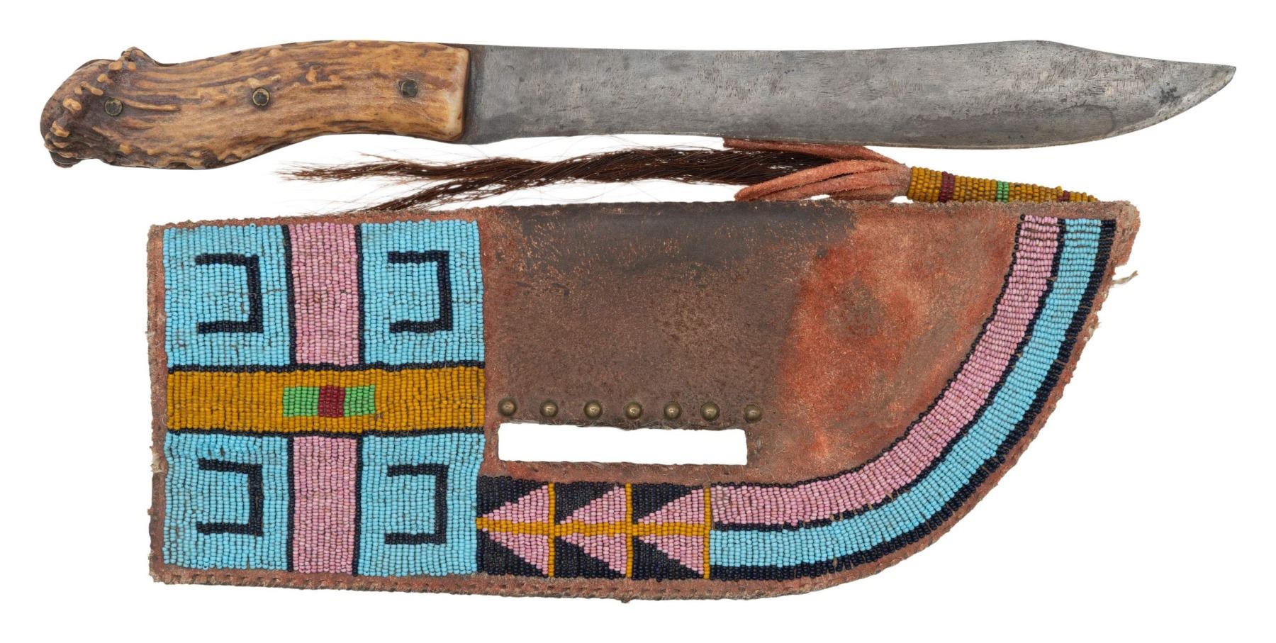 KNIFE. 14" knife with 9" skinning blade, 11.5" x 4.25" sinew & thread sewn, beading in yellow, dark blue, red, pink, & sky blue, slotted, one row small brass tacks, beaded drop with horse hair tassel. CONDITION: very good to fine overall. (02-25228/JS). NON-GUN. $400-600.