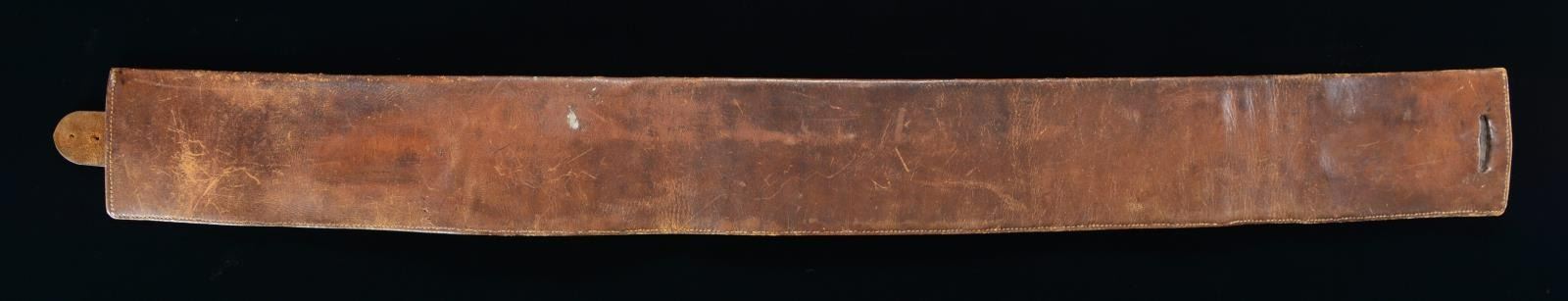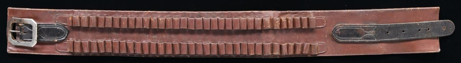 35" brown leather, 3.75" wide money belt with 44/45 cartridge loops for 66 bullets. Unmarked sewn tongue and plated octagonal buckle. CONDITION: very good overall, sound and supple, tongue has crazing. PROVENANCE: Martin Lane Historic & Western Americana Lifetime Collection. (02-21471/JS). $600-800.