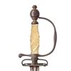 SMALL SWORD. 25" overall, 20" lustrous engraved blade. Steel mounted with pierced guard, engraved knuckle bow and pommel, engraved steel scabbard with shield shaped engraved frog button with cross of Savoy. The very high quality of this sword must have come from a noble or royal family. Finely carved grip is shell or agate with portrait of Louis XV. CONDITION: very fine overall, blade retains virtually all its original luster and polish. Carved grip has two chips in the rope border at top. Steel hilt and scabbard have iron patina. (02-22841/JS). NON-GUN. $800-1,200.