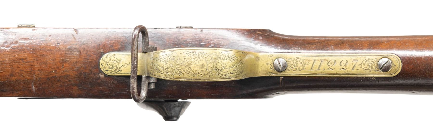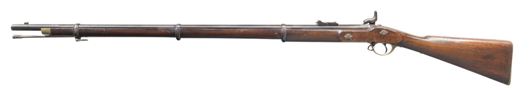 MUSKET. Cal. 577. S# 11227. Pattern 1853 volunteer rifle musket, made about 1860 based on serial number. Reilly was quality gunmaker in London for few generations early 19th century into 20th century. Several other high quality volunteer muskets are known by Reilly. Standard configuration, 39" barrel made by London Armoury Company, 25 gauge London proofs, lock has crown and VR cypher and "E.M. REILLY & CO / NEW OXFORD ST / LONDON". Brass furniture is engraved. CONDITION: fine overall, barrel has traces of original blue finish, balance plum patina, lock has silvered patina. Stock is sound with large chip repair at toe. PROVENANCE: Estate Collection of John "Jack" Dhooghe. (01-28234/JS). ANTIQUE. $1,000-1,500.