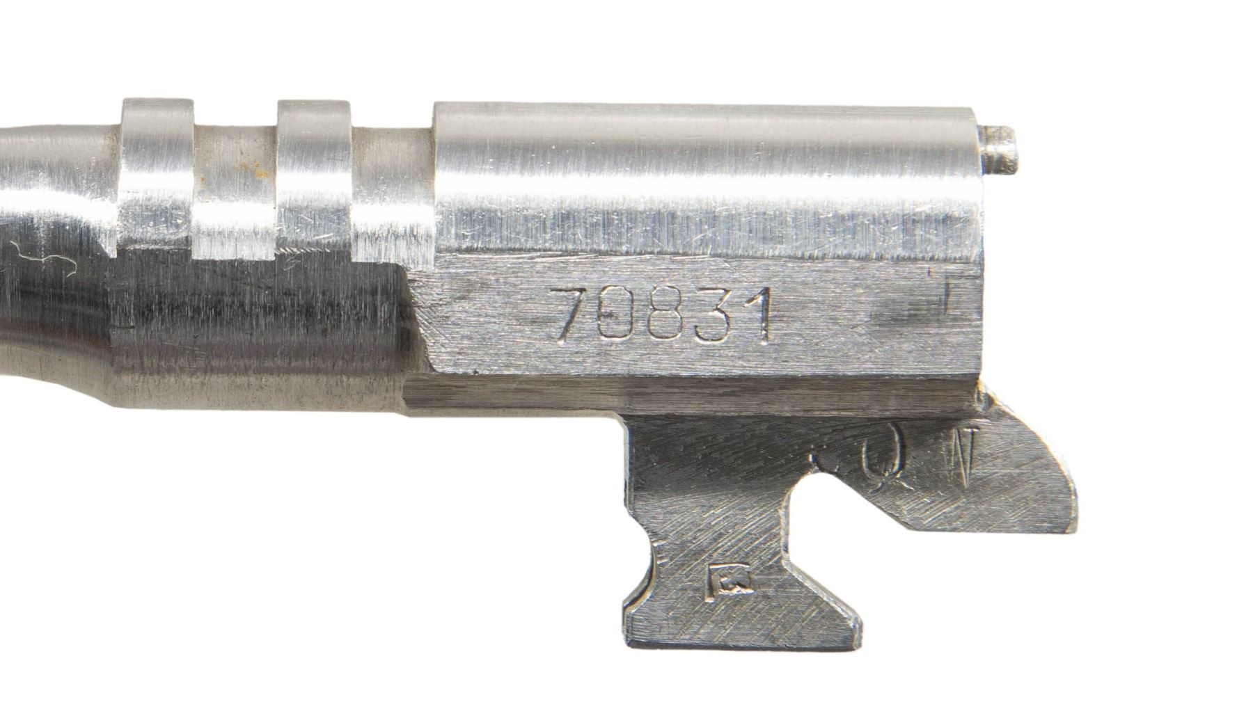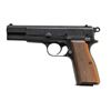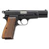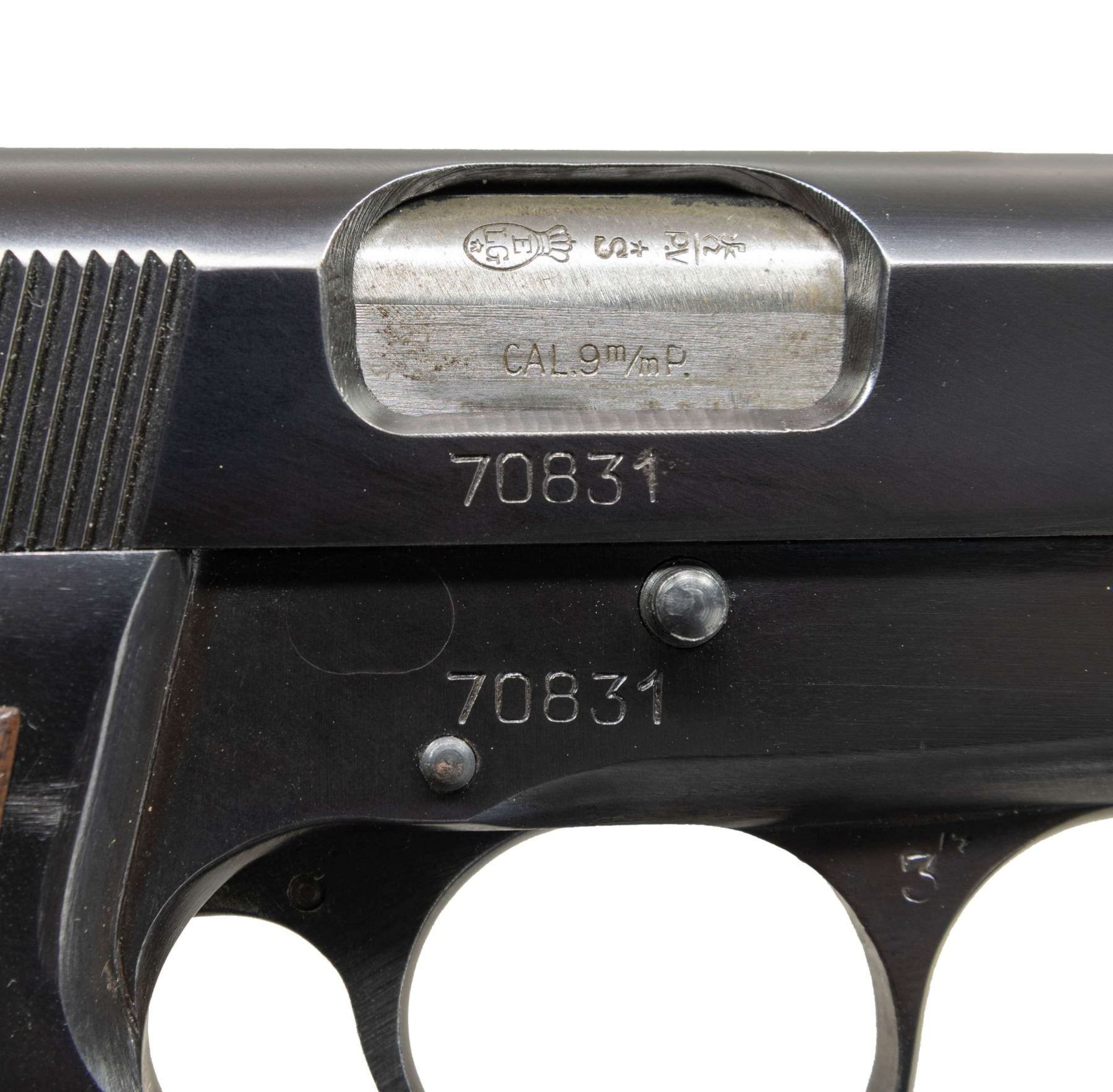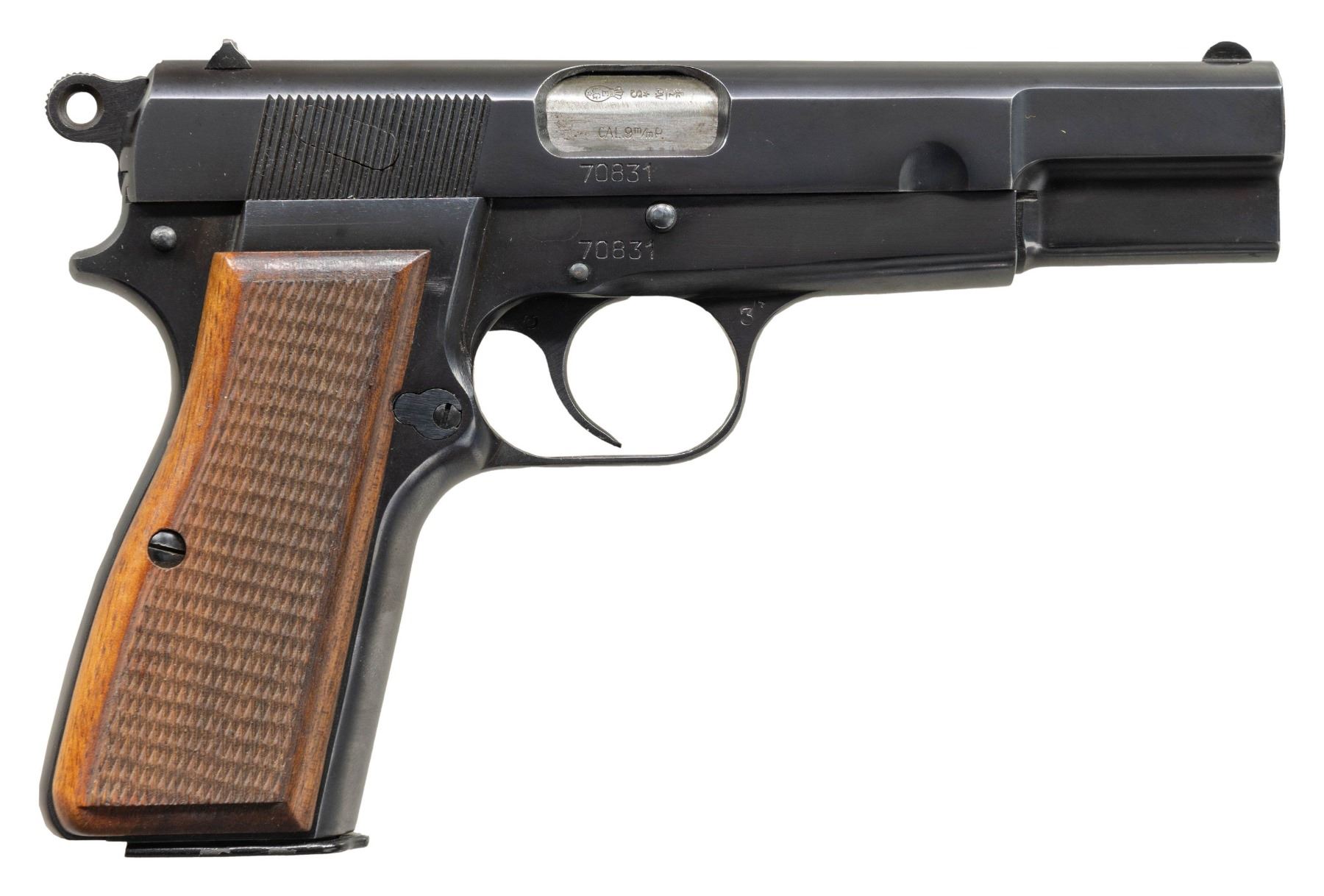POWER SEMI-AUTOMATIC PISTOL. Cal. 9x19mm. S# 70831. Bbl. 4 5/8". Hi Power semi-automatic pistol mfg. in Belgium by Fabrique Nationale and imported/retailed by Browning Arms company, circa. 1954-1957. Starting at approx. S# 70000, the Hi Power pistol began being commercially marked and imported by Browning Arms Company, with these pistols being amongst the very first Hi Powers commercial imported by Browning into the U.S. The left side of the slide is marked "BROWNING ARMS COMPANY ST LOUIS Mo./ MADE IN BELGIUM". The left side of the frame and slide, as well as the right side of the bbl. (on chamber) exhibit Belgian commercial proofs. Metal components exhibit a blue finish overall, save for on the bbl., which is polished in-the-white. Frame is mounted with 2-piece checkered wood grips, which feature red anti-moisture barrier paint on the interior of the panels. Thumbprint slide features an internal extractor, fixed half-moon blade front sight, and dovetailed U-notch rear sight. All serialized parts are matching and include the frame, slide, and bbl. (left). MAGS: 1 13-rd. with aluminum follower, blued body, and black enamel finished button type floorplate. CONDITION: metal components retain the vast majority of their original factory blue finish, showing some spots of light edge wear, with few diminutive spots of freckling present on the grip straps. Brilliant mirror bore, exhibiting some spots of grease, while retaining well defined rifling throughout. Grips show some very light smoothing to the diamonds and a few minor superficial marks, but are otherwise excellent. A high condition example of one of the earliest Fabrique Nationale Hi Power pistols imported by Browning Arms Company. (25-4400/MLW). CURIO. $1,000-1,500.