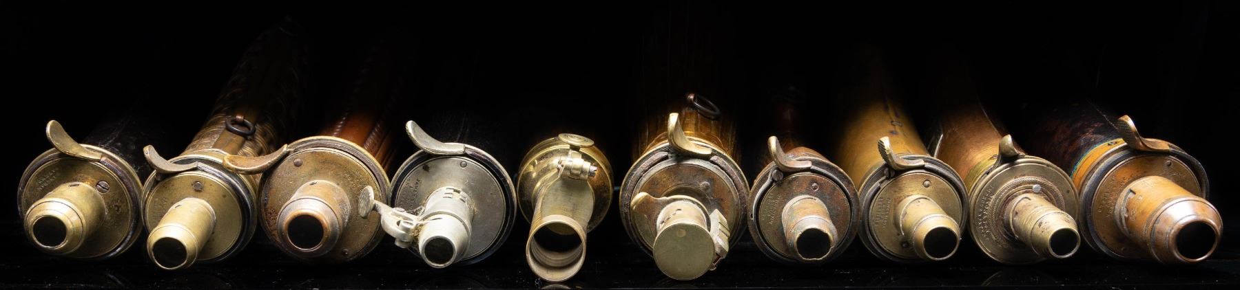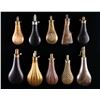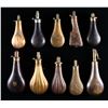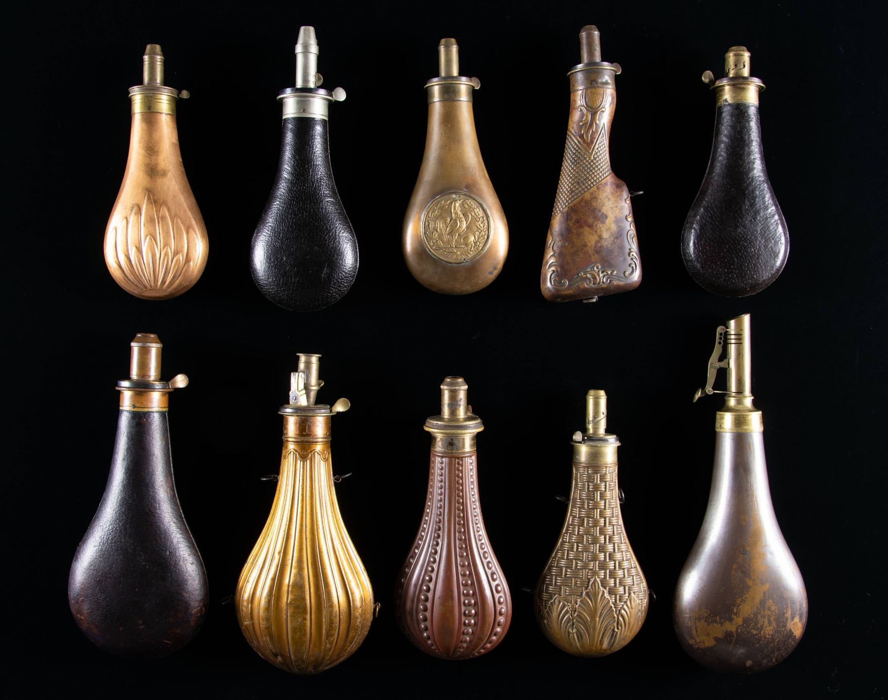 SHOTGUN POWDER FLASKS. 10.5" embossed design with patent charger, 8" 1836 presentation flask, 8.5" embossed rifle stock, 8" with applied round embossed rooster & "LIRETY", 8" & 9" & 10" leather covered flasks, 8.5" basketweave embossed, 9" nicely varnished flute and ball embossed. CONDITION: good to very good overall. PROVENANCE: The Esteemed Norm Greenberg Collection. (02-24848-7/JS). NON-GUN. $700-900.