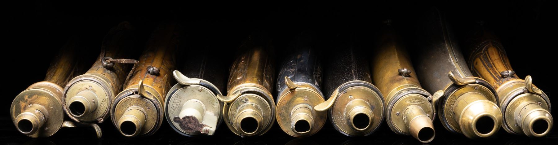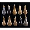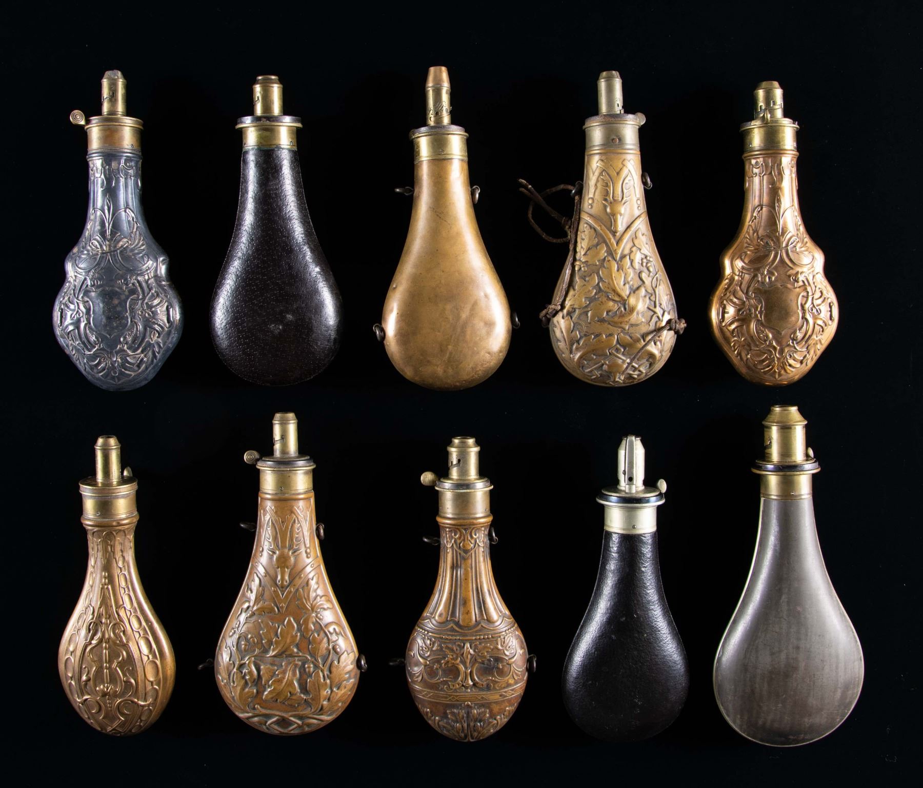 FLASKS. Ten variations of Hawksley flasks with different Hawksley, Sheffield markings including 9.5" tin flask with massive 6-dram charger, 8.5" white metal embossed, 8" leather covered with patent charger, 8" with applied oval hunting scene. CONDITION: good to very good overall. PROVENANCE: The Esteemed Norm Greenberg Collection. (02-24848-8/JS). NON-GUN. $700-900.