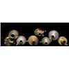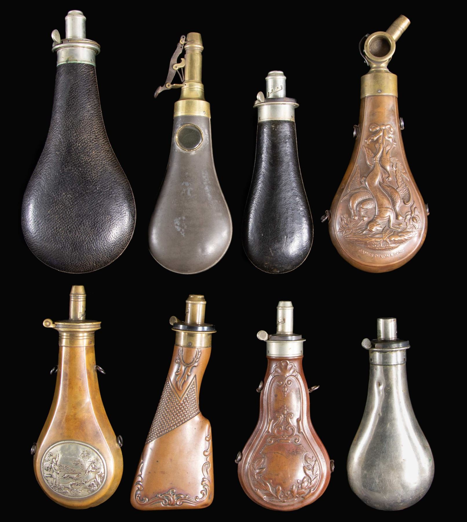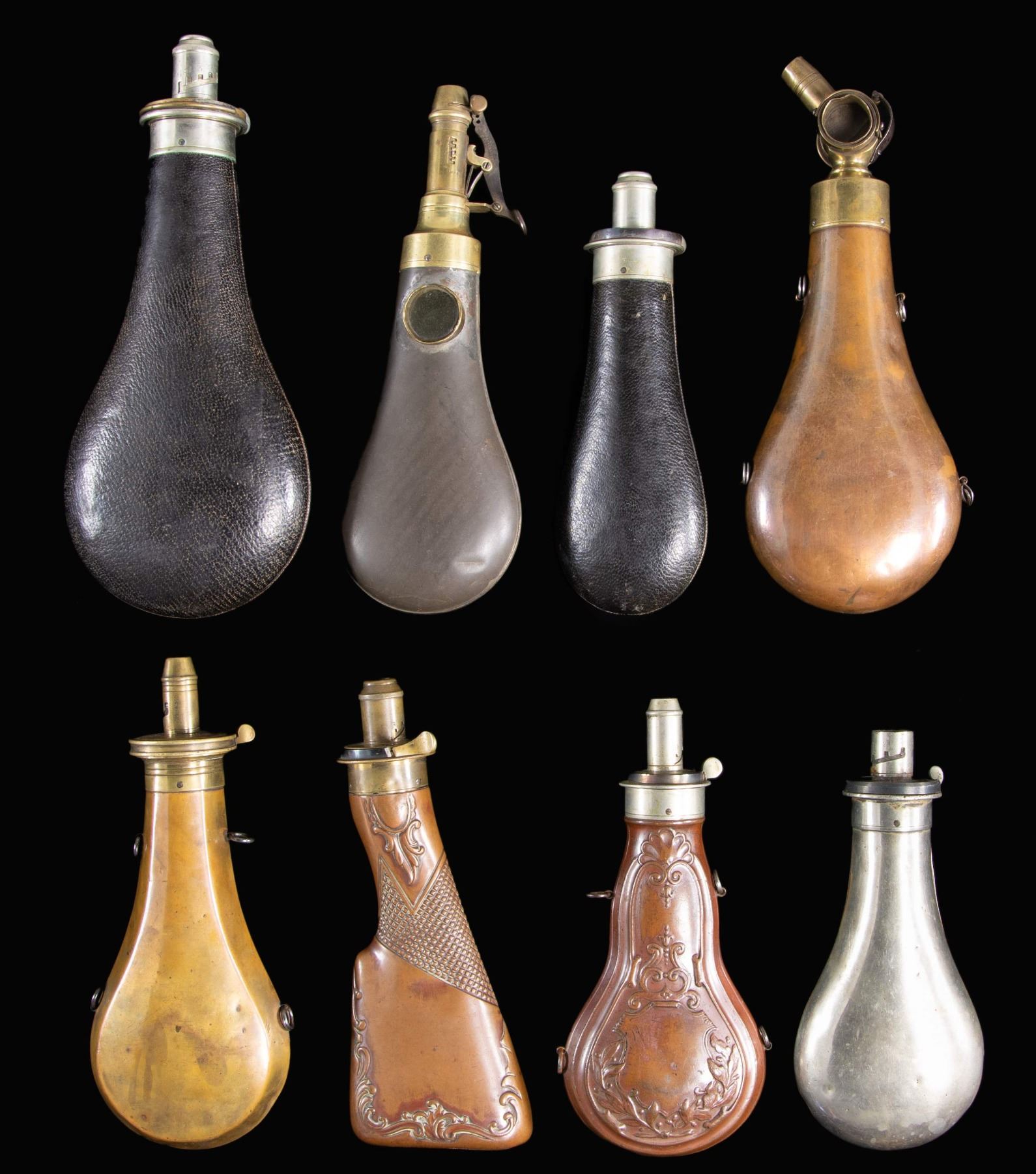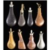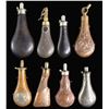 POWDER FLASKS. 9" embossed design with patent charger with glass windows and rotating top, 9" tin flask with 2 glass windows & patent powder measure charger, 8" embossed rifle stock, 8.5" with applied white metal oval hunting scene, 7.5" & 10" leather covered flasks, 7.5" white metal, 8" embossed varnished violin shaped flask. CONDITION: very good overall. PROVENANCE: The Esteemed Norm Greenberg Collection. (02-24848-11/JS). NON-GUN. $800-1200.
