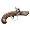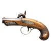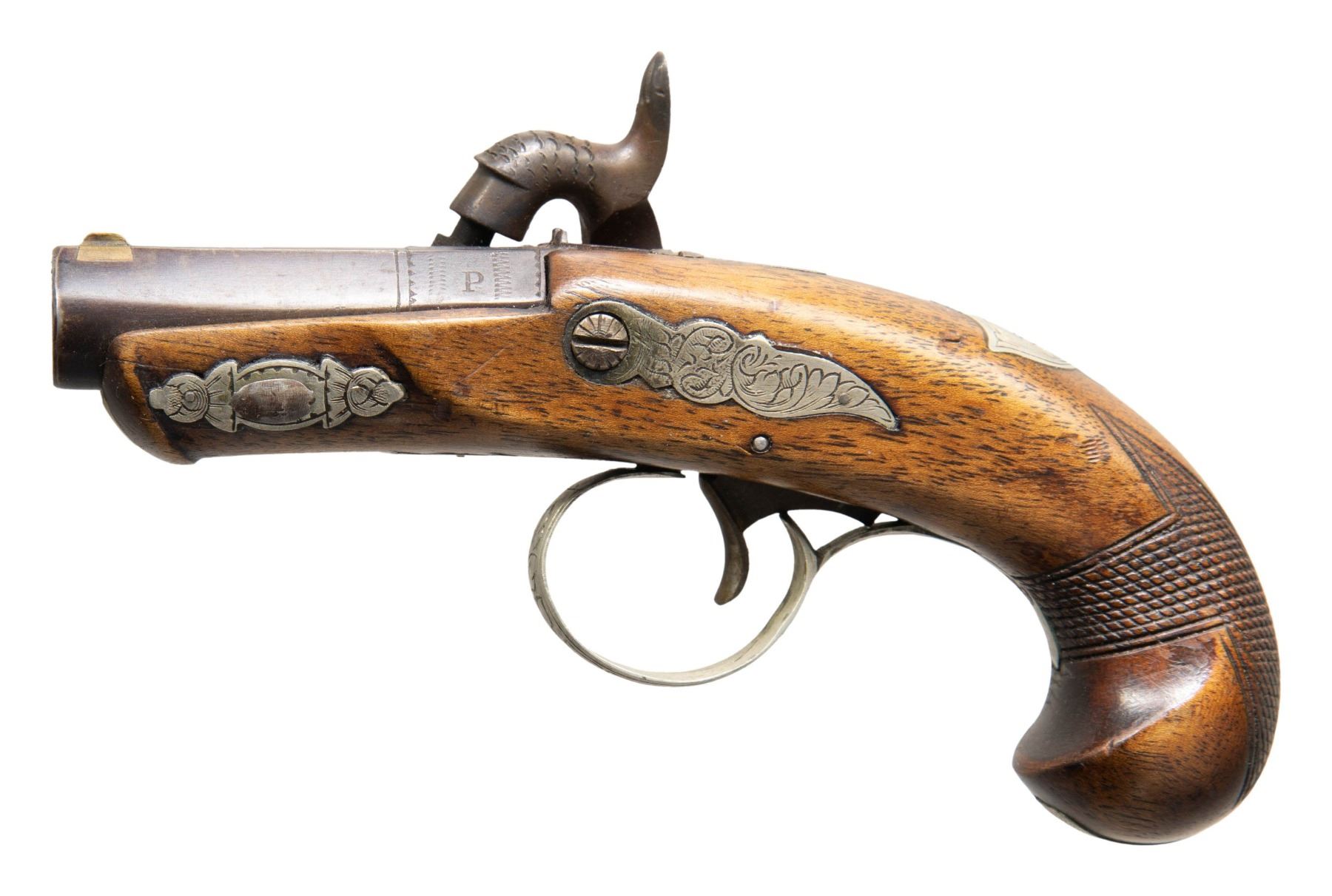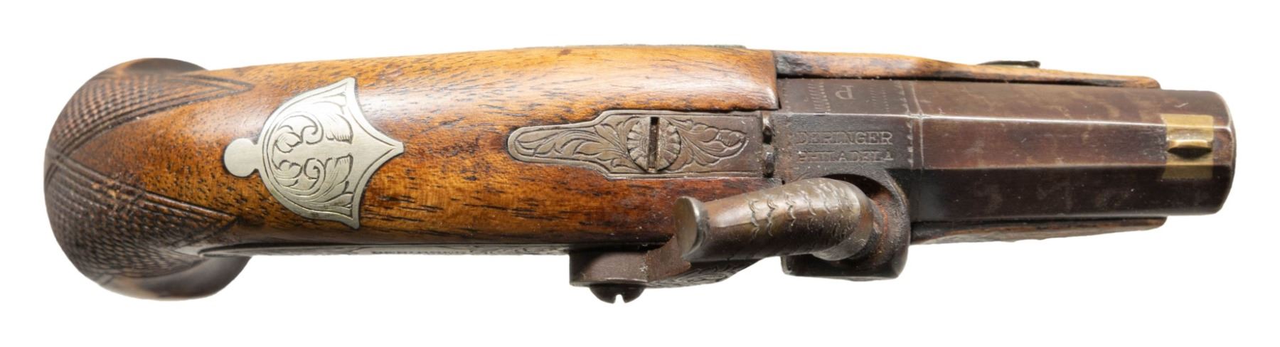 Cal. 42. NSN. 5.5" overall, 2" barrel including breech stamped "DERINGER / PHILADEL'A" & "P" proofed, original marbled brown finish, lock has same "DERINGER / PHILADEL'A" as barrel, engraved German silver furniture, checkered walnut stock. This is a superior survivor of the most famous of Derringer style pistols. CONDITION: very good to fine overall, crisp markings, smooth patinaed surfaces, mechanics fine, crisp smooth 7-groove rifled bore. PROVENANCE: Bob Allispones estate collection. (01-28680/JS). ANTIQUE. $1,200-1,500.