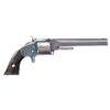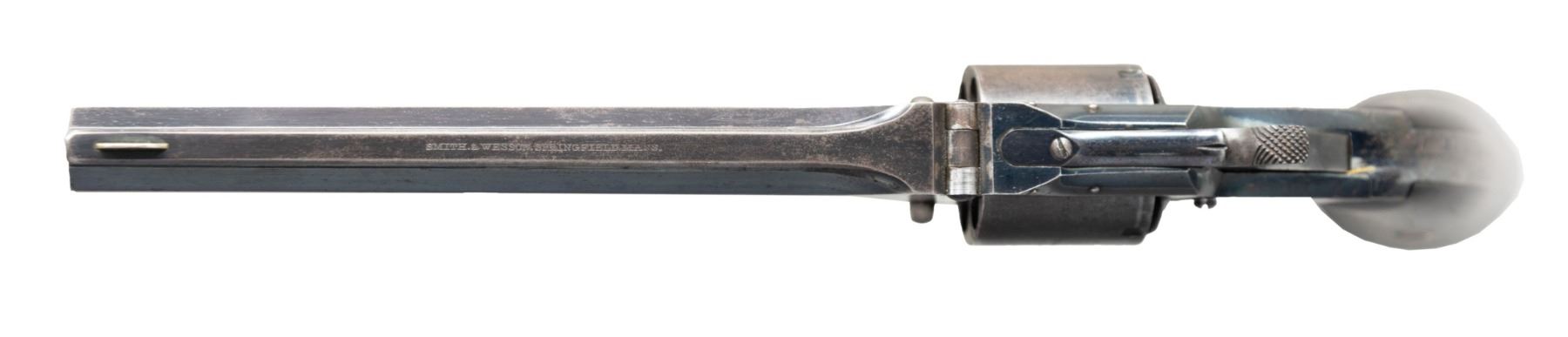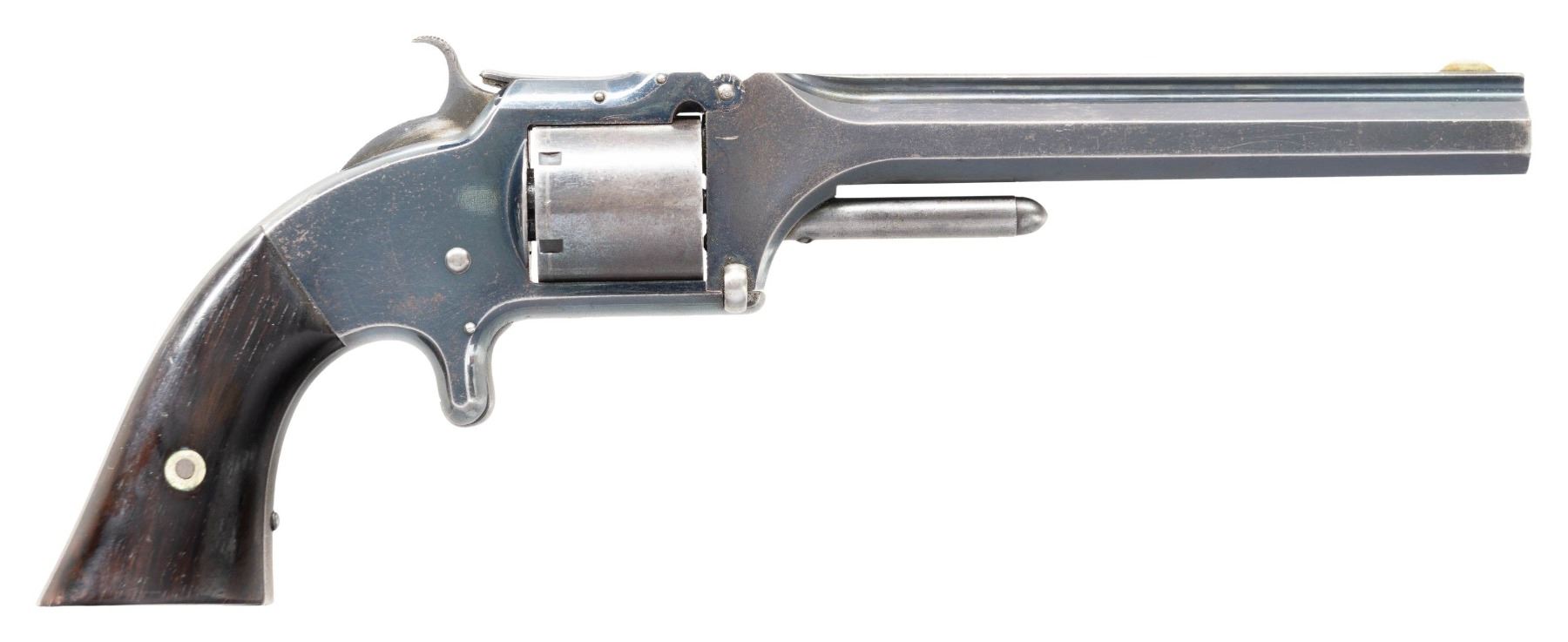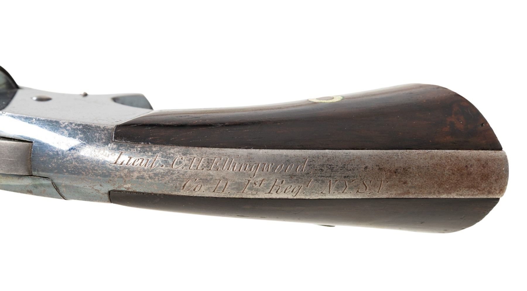 "LIEUT. C. H. ELLINGWOOD, 1ST NYSV". Cal. 32. S# 867. Standard early 2 pin Smith and Wesson No. 2 army revolver, 6" barrel, manufactured Inscrmid 1862, inscribed on backstrap: "Lieut. E. H. Ellingwood / Co. D 1st Reg't NYSV". Charles Henry Ellingwood (1837-1876) was commissioned as a second lieutenant in Co. D of the First Regiment of New York State Volunteers on November 2, 1861. He resigned on February 3, 1862 although he had signed on for two years. His official service records include a letter of resignation, citing pressing business needs, but the nature of his business goes unmentioned. During his service the regiment was stationed at Camp Butler, Newport News, Virginia. While in camp he made a drawing of himself and fellow soldiers that is copied in research file. UNATTACHED ACCESSORIES: small file of research, and biography. CONDITION: fine overall, complete & matching serial numbers and assembly markings, retaining about 70% original blue finish, rosewood grips are fine with light edge wear. Mechanically fine, crisp bright rifled bore with scattering pitting. PROVENANCE: Estate Collection of John "Jack" Dhooghe. (01-28250/JS). ANTIQUE. $1,500-2,500.