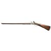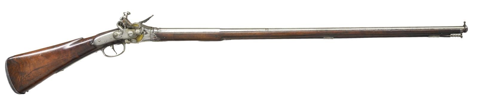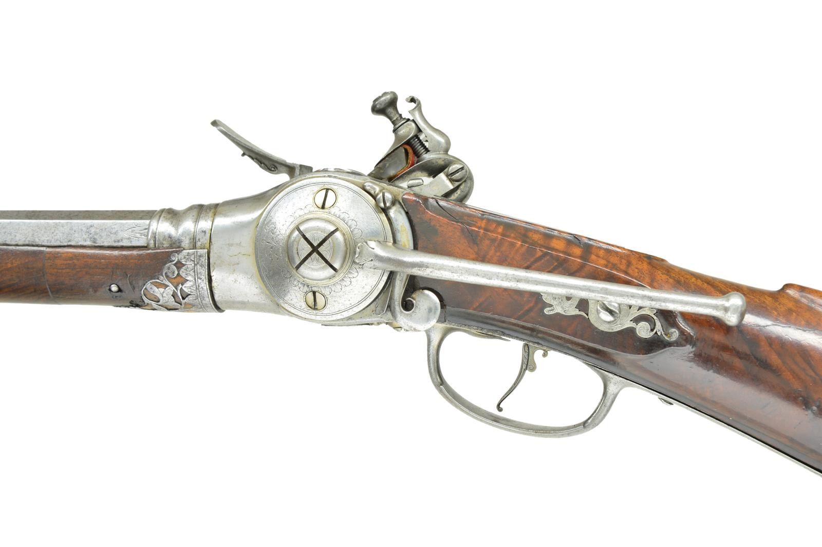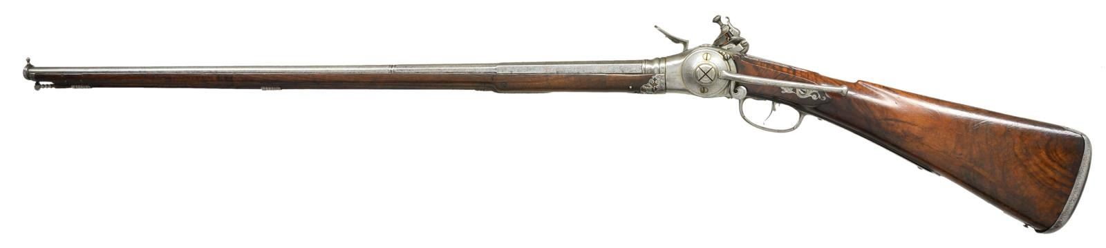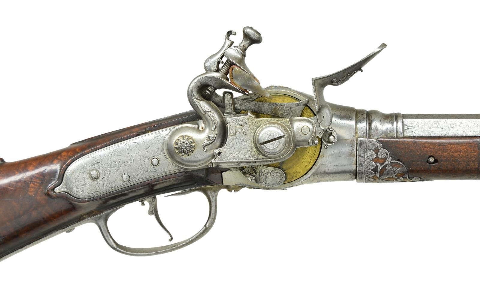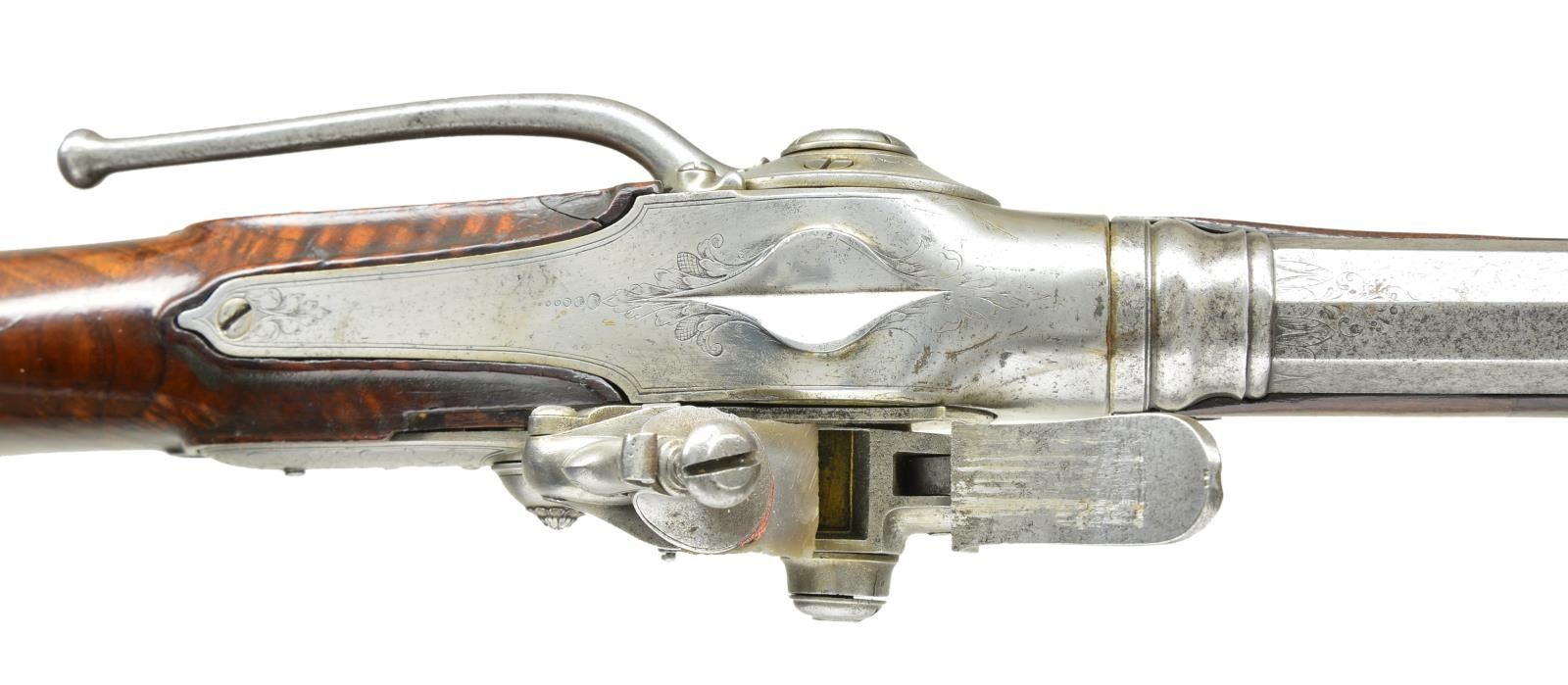 SPORTING GUN BY THE CECCHI BROTHERS (ACQUA FRESCA) OF BARGI. Cal. 52. NSN. The Lorenzoni system for making repeating flintlock guns was developed around 1700. It was fairly efficient and developed quite a following throughout Europe and into Great Britian. It was produced for a relatively long time. The system used a rotating drum set transversely that picked up a charge of powder and a ball from magazines loaded through the butt. Rotating the lever on left side deposited charge and ball into chamber in breech section. Continuing the rotation of the lever cocked the hammer and closed frizzen. Returning the lever to original position exposed powder in the pan making gun ready to fire. Most of these guns have barrels that were easily dismounted with tapered heavy thread. Barrels were usually smooth bored. Bores were generally tapered from breech to muzzle to increase accuracy. This gun has 32 1/4" barrel with octagon rear section which transitions to sixteen sided; then to round through turned band and terminates in a heavy raised band at muzzle with large sight bead. Two piece full length walnut forend is pinned to barrel and a fancy steel tipped ramrod mounts through two fancy turned pipes and matching tail pipe. Iron decoration at rear is pierced in the form of scrolling acanthus and has grotesque face at center. Action has deep sighting "V" on top and brass rotating drum. Back spring flintlock is engraved "Acgua Fresca" "Bargi" (The fairly well known Cecchi brothers, Matteo and Pietro that worked together in the early 18th century). They were known for their exceptionally fine deep chiseled metal work which shows up on the beautifully sculpted serpentine cock, as well as the face and tail of frizzen found on this gun. Other high relief carvings of note are on the lever retaining spring on left side of action. Non relief, but finely detailed engraving extends to fine attenuated scrolls overall, along with the torso of man on lock plate, a phoenix on pan housing and coiled sea monster on frizzen cocking dog. Trigger guard finial is pierced and engraved with grotesque face. Straight grip buttstock of burl grain walnut has heavy steel hinged buttplate covering access to powder and ball magazines with release button on toe. Thin top tang extends to within 3/4" from point of comb. CONDITION: good with some restoration. Metal parts are cleaned to silver gray over light pitting. Wood has most of an old finish probably renewed, with marks and scratches. Forend wood, probably an early replacement over most of its length. Two pieces of wood make up first 3" at breech end. Some screws show replacement in action, hinged buttplate will not open. Stock shows some losses of wood and replacement around lockplate. Bore is good, mechanically good. (01-21981/MGM). ANTIQUE. $7,000-12,000.