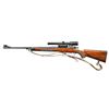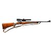 SPRINGFIELD SHORT RIFLE WITH SCOPE. Cal. 35 Whelen. S# 1656 (CA 1939). After suffering a debilitating stroke in 1937, famed engraver Rudolph Kornbrath retired. His coworker Josef Fugger continued on and was responsible for almost all of Griffin & Howe's work until 1960. His scroll is much more delicate then that of Kornbrath and he most often depicts full bodied animals. This classically embellished prewar Griffin & Howe rifle has 22" light weight barrel without rear sight, but does have sleeved on wide sling eye and stippled front ramp with gold bead and sight protector. Top of barrel is engraved "No. 1656" "Griffin & Howe Inc. New York". 1903 Springfield action has had rear tang slimmed and tang safety installed. A G&H side mount and Lyman 48 sight are also fitted. Bolt body, extractor, follower and bolt runway are engine turned, bolt handle marked "NS" has been lowered. Knob is checkered in five panels. Bottom metal has had trigger guard thinned and slimmed. Two stage trigger is retained, blade checkered. All metal parts are tastefully engraved with sprays of scroll and small scroll borders. Larger areas of scroll incorporate oak leaves and other acanthus elements; and this engraving scheme extends to Lyman sight base, side mount, bolt shroud and bolt handle. (Oak leaves are in semi relief at root). On the floorplate this lovely treatment surrounds a finely detailed game scene of two bighorn rams in alpine environment. Trigger guard bow depicts a quartering buffalo bull. This work is unsigned which is not unusual, as Fugger's signature is quite scarce. Very attractive, flesh tone, lightly streaked and figured European walnut pistol grip stock measures 13 1/2" over engraved and checkered steel buttplate with trap. Trap contains staff for receiver sight and oiler. Stock features swept right hand cheek piece, horn tip, closely spaced borderless point pattern checkering at grip and around forend, and a case hardened and engraved grip cap with trap (contains rear sight aperture). Toeline is fitted with sling eye and gold oval engraved with the initials "NEJ". Rifle is fitted with unmarked (appears to Swarovski or Zeiss) 1.5-4.5 scope with duplex reticle in G&H rings and slide. Rifle is accompanied by a brown leather sling in M70 type detachable loops. CONDTION: fine as refinished. Metal parts retaining essentially all of a fine reblue most likely done by the factory, engraving remains sharp and clear. Stock retains most of a glossy oil finish with a scattering of marks most notably four or five scratches on left side below bolt stop. Bore is very good, a bit dark in grooves (may clean), action smooth. Receiver sight base is fitted with a slide which has had aperture removed. Slide in buttplate trap has matching assembly number to base. Scope has a fair number of scratches on exterior, optically fine. (22-5796/MGM). CURIO. $5,000-8,000.