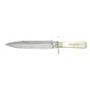 BOWIE KNIFE. 11.5”overall, 7.75” double edged dagger point with medial ridge, German silver mounted with mother of pearl slab grip. Ricasso stamped “JOSEPH / HAWKSLEY’S / CELEBRATED”, original gold embossed brown leather veneered German silver mounted sheath. CONDITION: very good to find overall, blade retains much with several small Nicks in cutting edge, sheath is very good with scuffs and only traces of gold, throat missing frog button. PROVENANCE: From the Lifelong Collection of Glen E. Mattox. (02-18379/JS). $1200-1500.