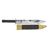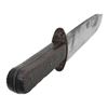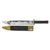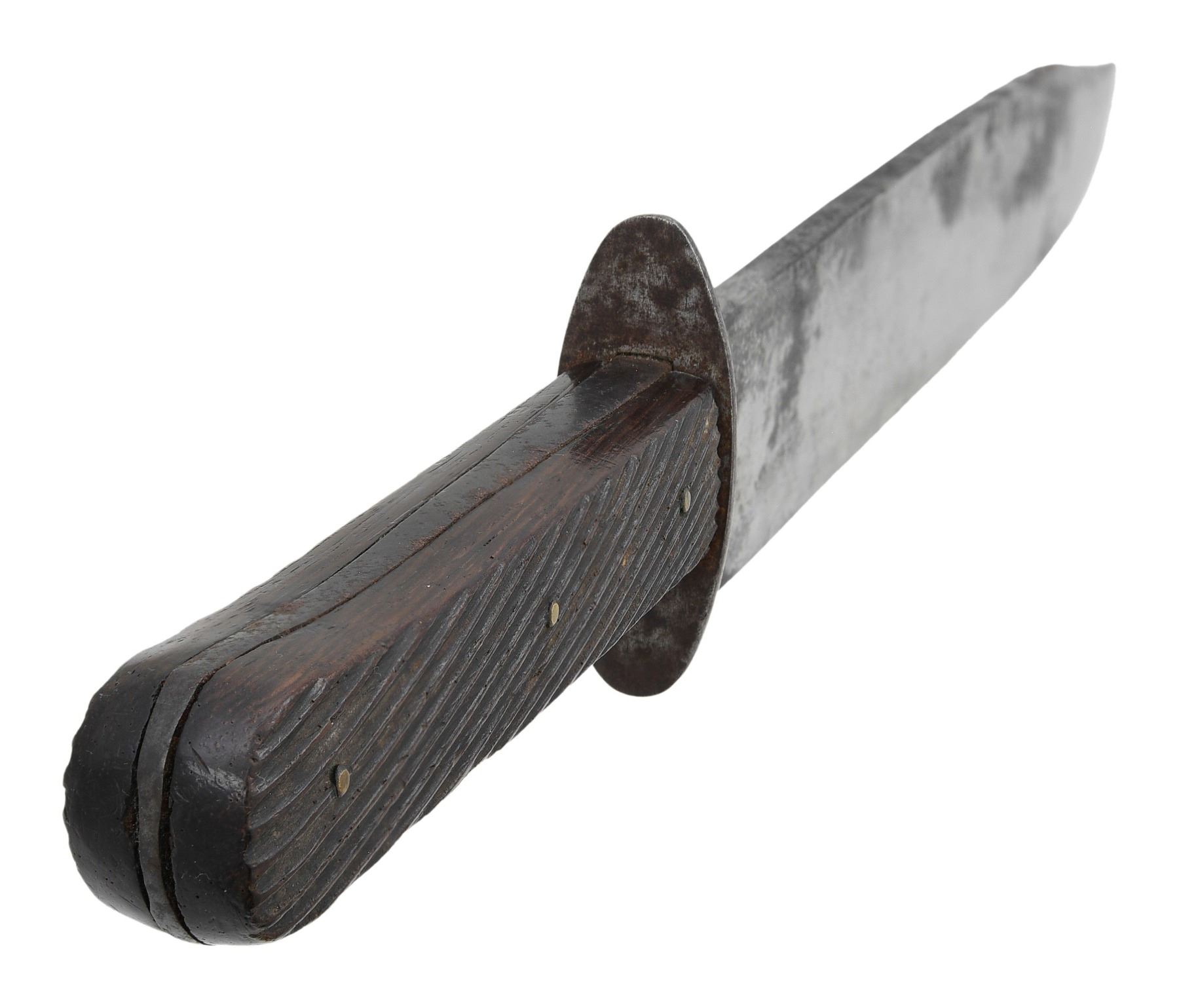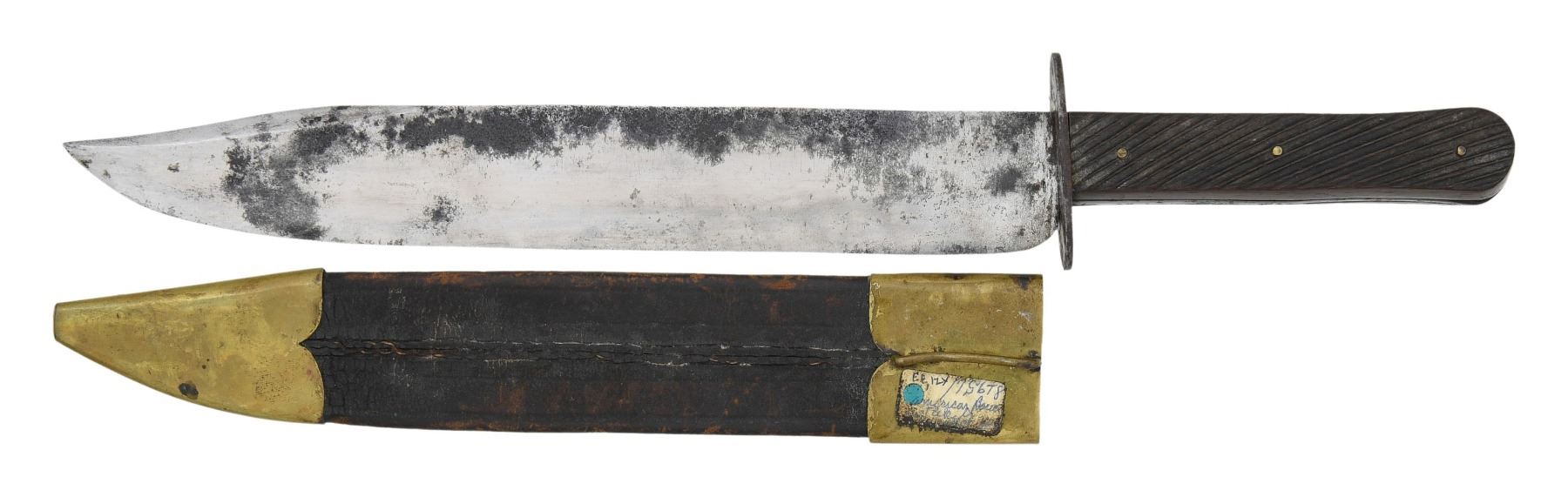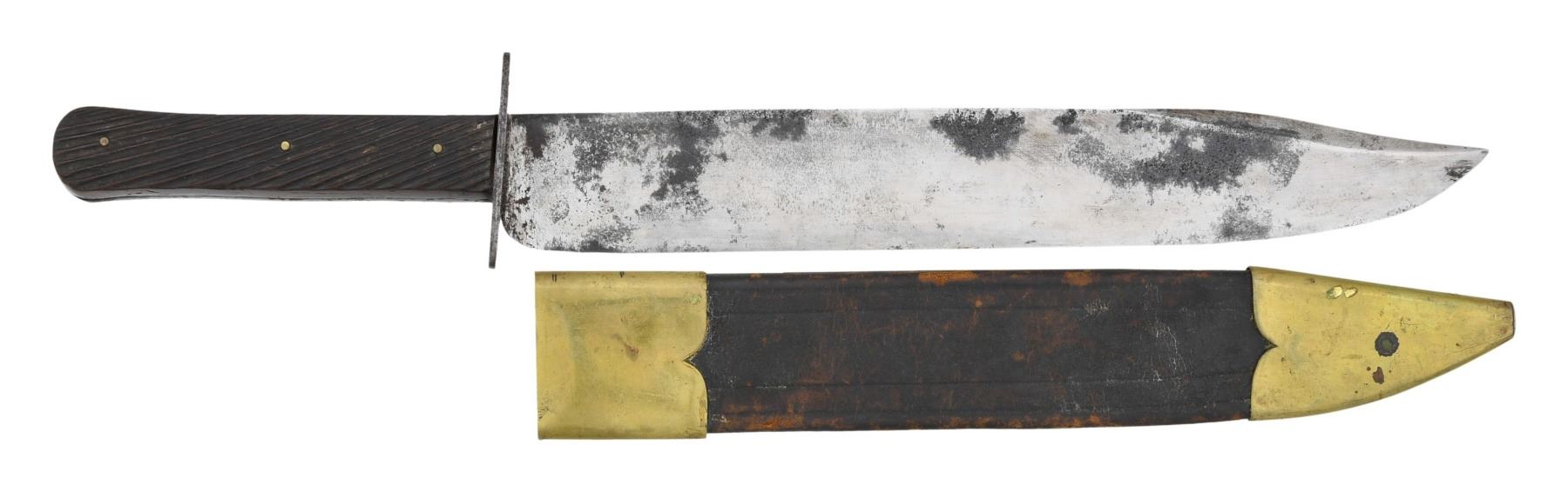 BOWIE, EX-FLAYDERMAN. 17.5" overall, 11.5" clip point blade, 2" wide, .31" thick at ricasso. This massive bowie is polished and cutlered Like a large scalpel with razor edges including the sharpened clip, full tang, 2.5" oval iron cross guard, diagonal fluted rosewood grip panels pin attached. This exact knife and sheath are pictured and described on page 341 of norm Flayderman's monumental text "The Bowie Knife". The sheath is tooled black leather with scalloped 2" tip & throat with braised wire belt loop. There is a nearly identical knife and sheath known with elk slab grips that point to early California manufacture. One California maker who was known to have migrated from Pittsburg in 1840s to San Francisco; Hugh McConnell made early California knives, but none of his early knives are marked. Several characteristics of the two known examples of this big bowie make for the California connections. I wonder where Norm found this one, it was in his collection for a very long time based on on wear & soiling to his old label. UNATTACHED ACCESSORIES: copy of pages from "The Bowie Knife" and photos of other survivor with Elk slap grips. CONDITION: very good to fine overall, blade retains much of its original Polish and luster with areas of black staining and pitting, grip panels will fit with hand worn patina. Sheath is well fit with light shrinkage, .25" gap between throat and crossguard. PROVENANCE: Norm Flayderman family collection. (02-24507/JS). NON-GUN. $2,000-4,000.