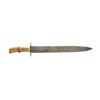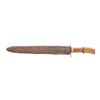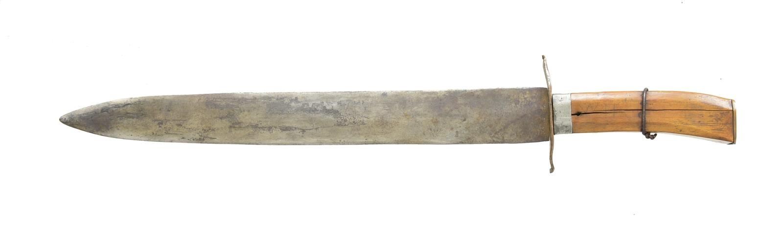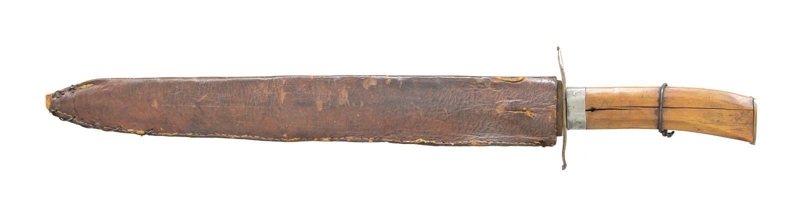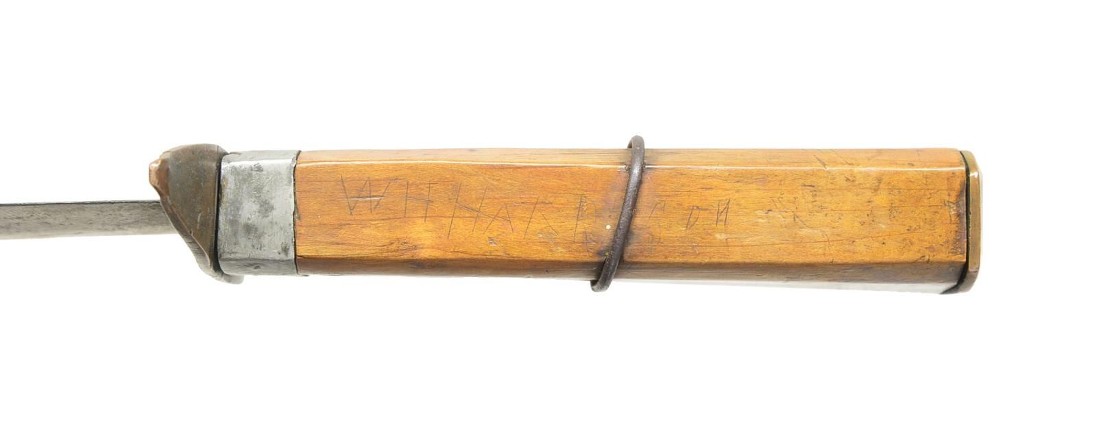 “W H HARRISON”. 17 1/4" Overall, 12 3/4" dbl. edged spear point blade made from file. 3" Brass crossguard. Carved fruitwood grip, pewter ferrule & brass pommel cap. Scratched on grip are initials “W H” & “W H HARRISON”. Accompanied by original leather sheath. CONDITION: very good overall, “as found”, blade still very sharp w/ staining & pitting. Grip has lg. crack that has contemporary repair of twisting single strand of iron wire tightly. The accompanying scabbard also has iron wire repairs where stitching is undone at tip & one loop at top. (02-15570/JS). $1,200-1,500.