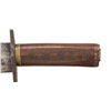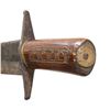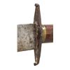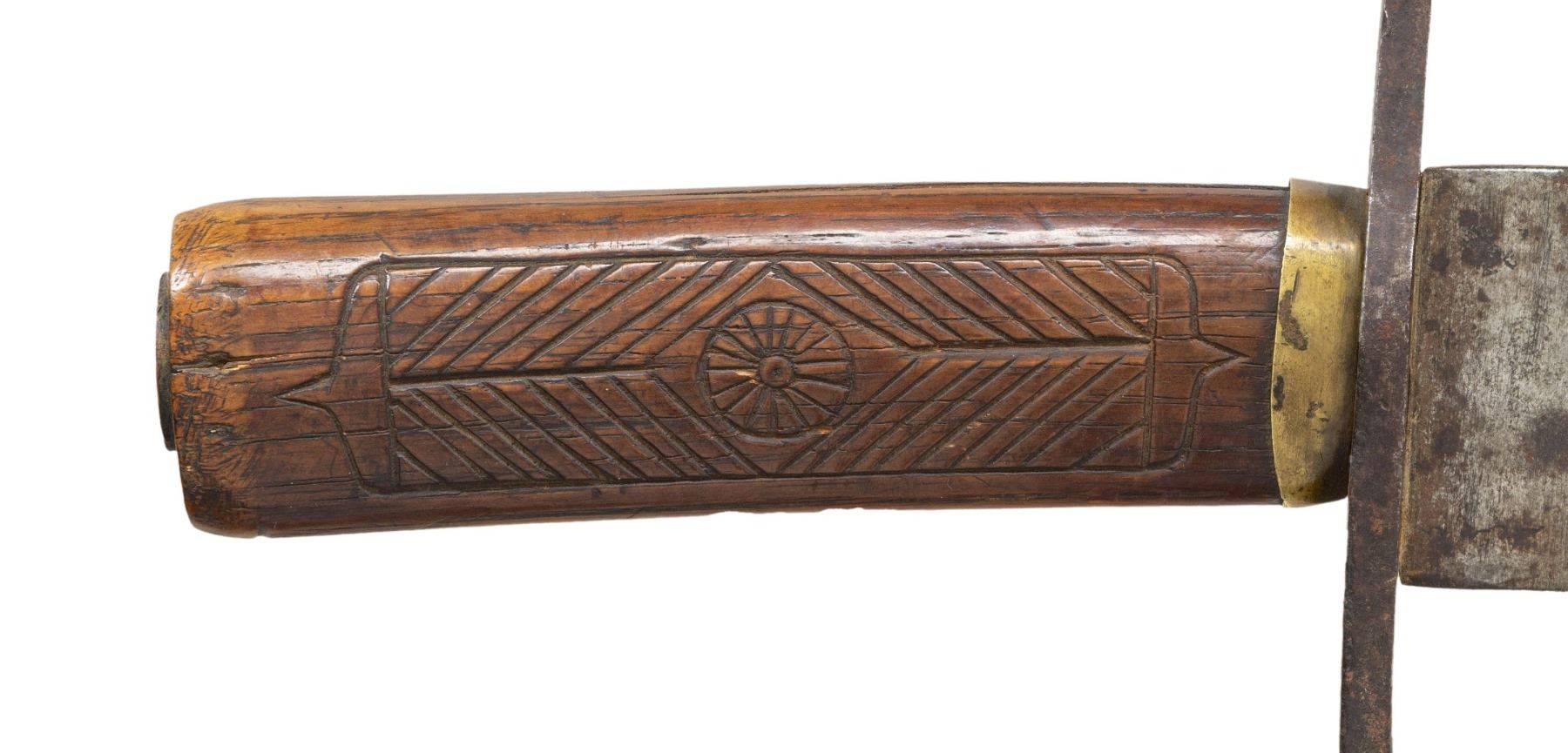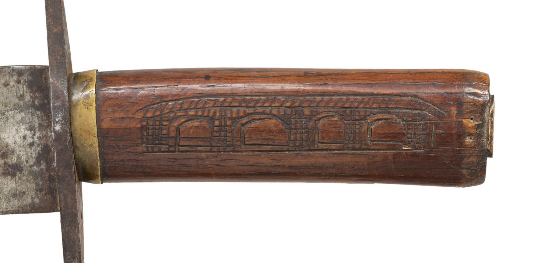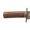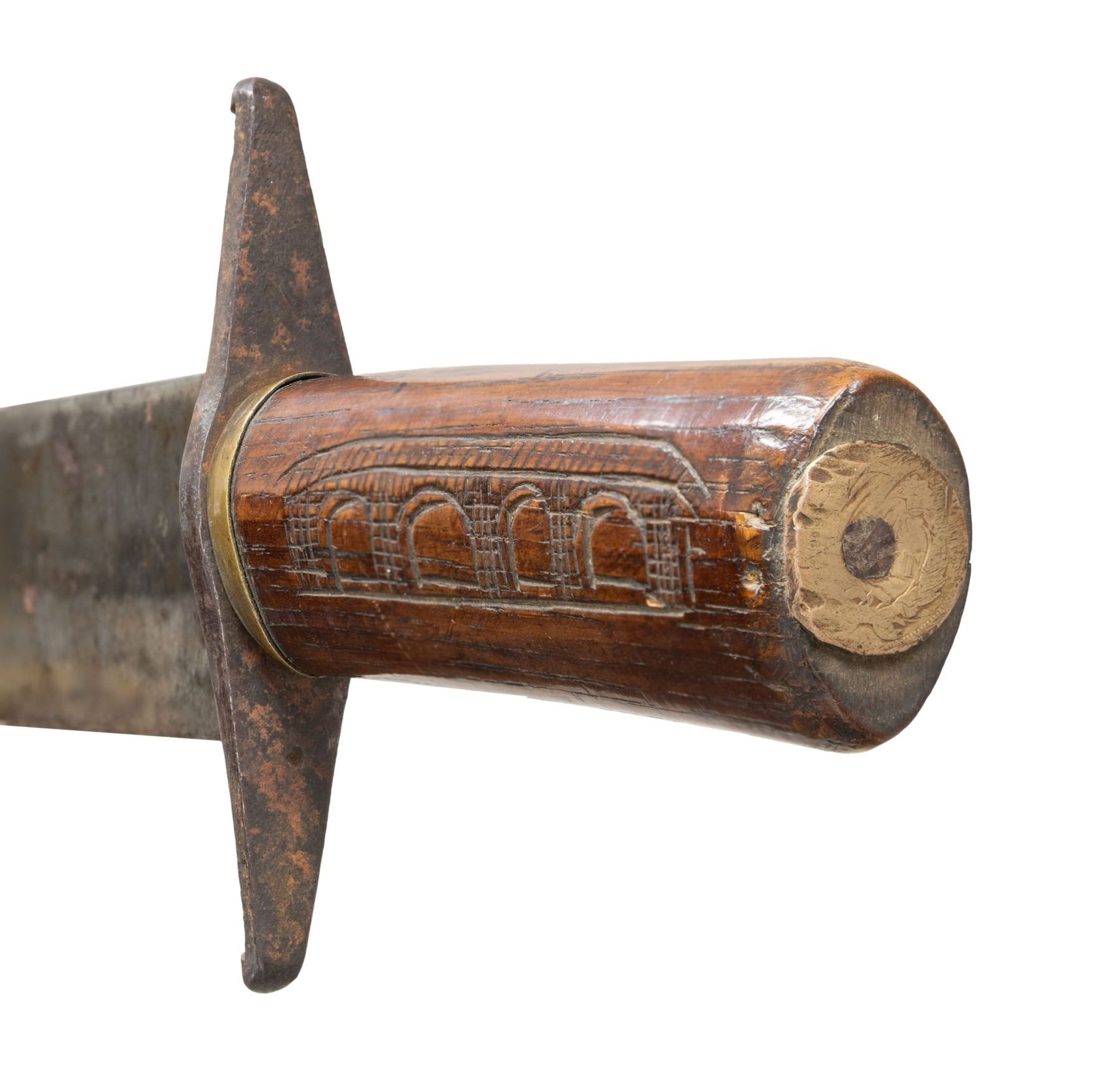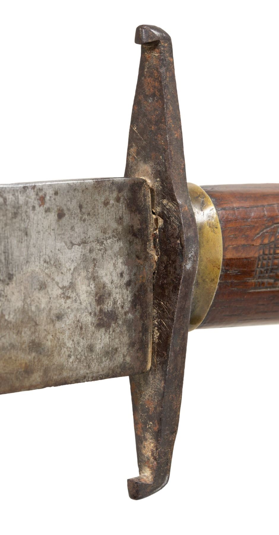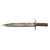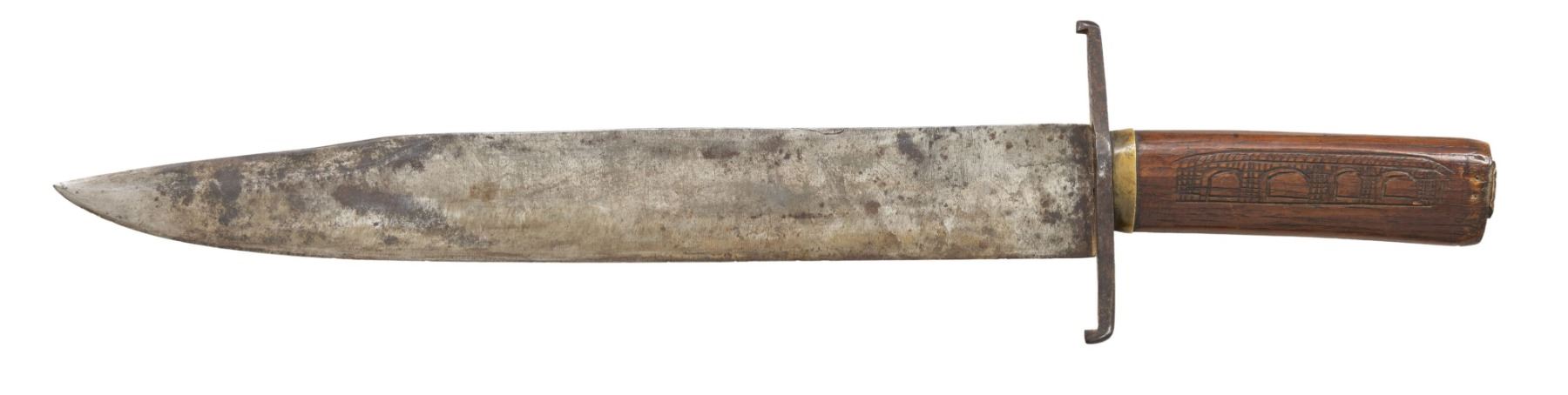 This well cutlered blade is 19.5" overall, 14" clip point blade, 4.5" clip is sharpened, 1.75" wide, .23" thick, saber ground, 4.5" iron cross guard with turned down quillons, nicely carved ovoid walnut grip, brass ferrule, pommel made from "flying eagle" penny. Several similar bowies shown in "CONFEDERATE BOWIE KNIVES" including an excavated example from Petersburg, VA. This is beautiful survivor in superior condition for a Confederate side knife. CONDITION: very good to fine overall, "as found", blade has forging flaws and finishing tool marks, scattered staining and pitting, hand worn patinaed grip, well defined folky carved design, 3" age crack on top edge. PROVENANCE: James R. Johnston collection. (02-26014/JS). NON-GUN. $3,000-5,000.