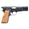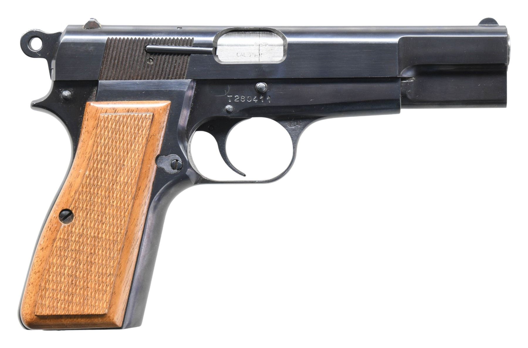 SEMI-AUTOMATIC PISTOL. Cal. 9mm Para. S# T280411. Bbl. 4 5/8". Hi Power semi-automatic pistol mfg. in Belgium by Fabrique Nationale and imported/retailed by Browning Arms Company circa. 1969. Left side of the slide is marked with Browning's importer information above "MADE IN BELGIUM". Right side of the forward trigger guard web and chamber exhibit a single Belgian proof mark. Metal components exhibit a blue finish overall, save for on the 2-piece bbl., which is polished in-the-white. Frame is mounted with 2-piece checkered wood grips, which feature red anti-moisture barrier paint on the interior of the panels. Slide (without thumbprint) features an external extractor, half-moon blade front sight, and a dovetailed U-notch rear sight. Mag. is absent. CONDITION: fine, with metal components retaining virtually all of their original factory blue finish overall. Brilliant mirror bore, retaining well defined rifling throughout. Grips show a few minor superficial handling marks, but are otherwise excellent. An exceptional Belgian Browning "T-Series" Hi Power semi-automatic pistol. (25-3648/MLW). CURIO. $800-1,200.