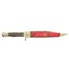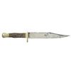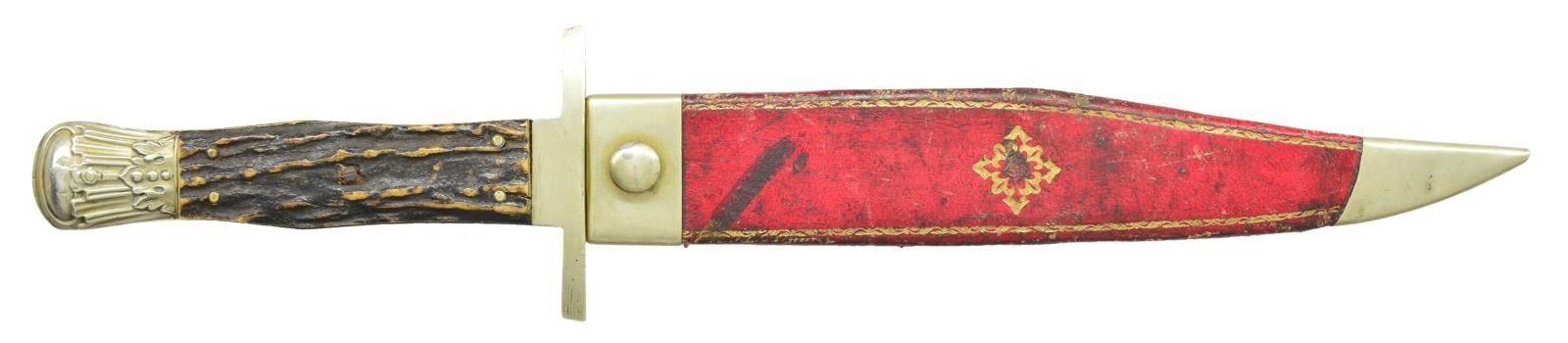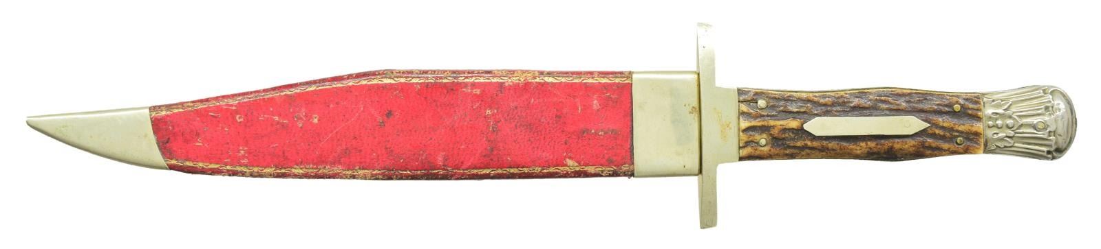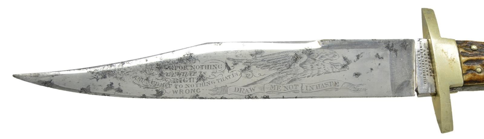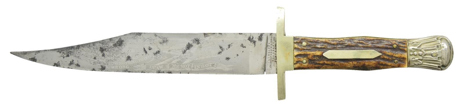 POINT BOWIE KNIFE. EX NORM FLAYDERMAN COLLECTION. 13” overall, 8” blade with 4” clip, finely etched over most of surface with two mottos: “WE ASK FOR NOTHING BUT WHAT IS RIGHT AND SUBMIT TO NOTHING THAT IS WRONG” & “DRAW ME NOT IN HASTE”, stamped on ricasso “LINGARD’S / CELEBRATED BOWIE KNIFE / PEA CROFT / SHEFFIELD. 3” solid German silver crossguard, reinforced die struck solder filled decorated pommel mounts. Original gold embossed red leather veneered sheath with German silver mounts. Ex- Norm Flayderman collection, pictured on Page 149 of his 2004 text “The Bowie Knife”. CONDITION: fine overall, blade retains most of its original polish and lustre with areas of staining and pitting affecting only a couple letters in first motto. Original sheath fits well with typical light scuffing and staining. PROVENANCE: From the Lifelong Collection of Glen E. Mattox. (02-18378/JS). $2,500-3,500.