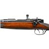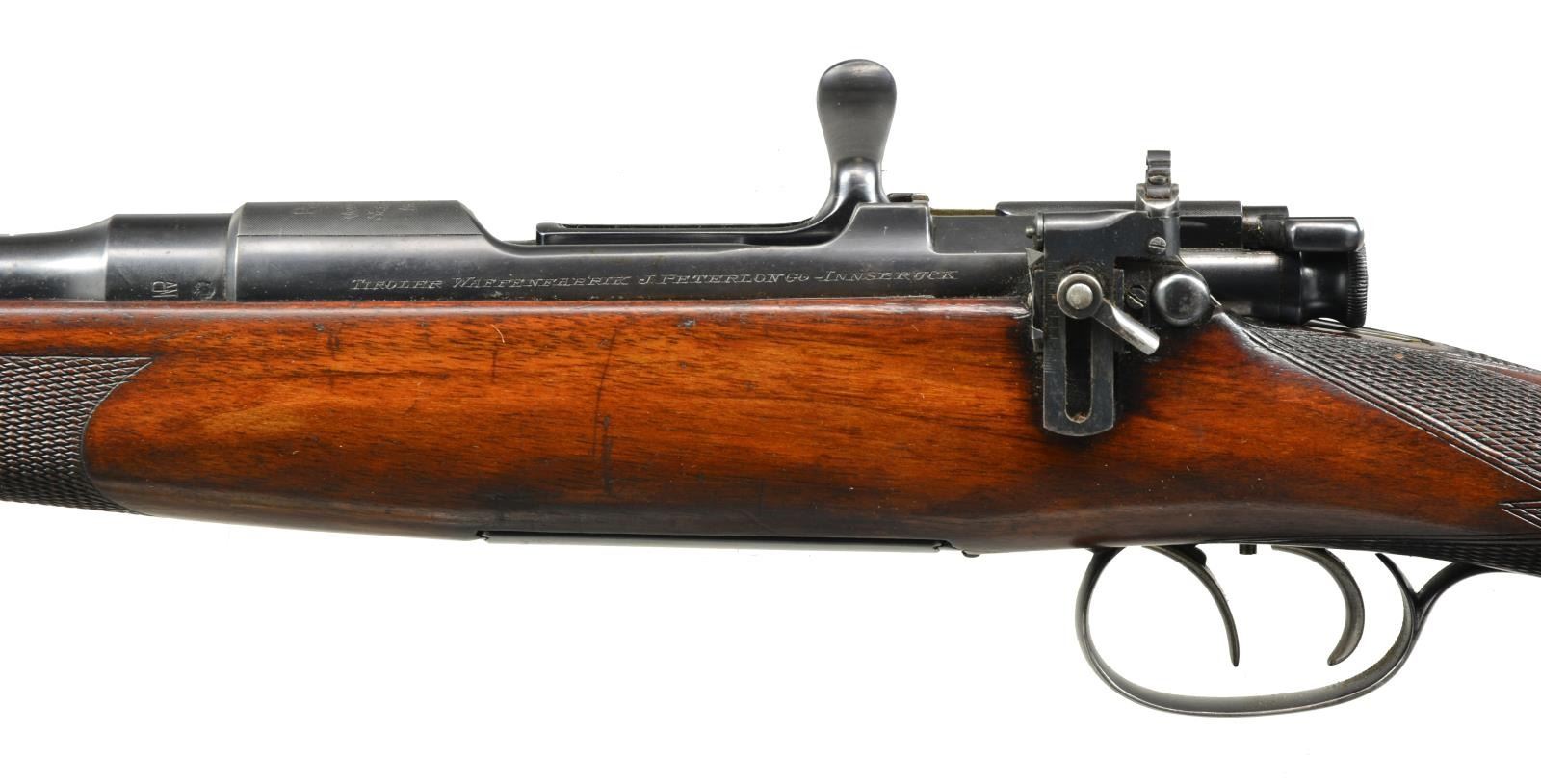 PETERLONGO OF INNSBRUCK. Cal. 9X56 MS. S# 1919. Bbl. 18". Standard configuration pre war carbine w/ 18" bbl. holding usual 1 standing 1 folding leaf, rear sight & German silver bead front in short matted ramp. Usual Mannlicher action has patent & model information on matted receiver ring. Left side wall w/ Steyr information removed engraved "Tirolier Waffenfabrik J. Peterlongo - Innsbruck". A Lyman 36 bolt stop sight has been installed. Carbine is fitted w/ dbl. set triggers & flag safety has been nicely engraved "S" on bottom. Relatively plain European walnut rnd. knob pistol grip stock extends to muzzle w/ usual steel cap & bail type forward sling attachment. Stock also features steel buttplate w/ trap w/ space for cleaning equipment in butt (cleaning rod present); right hand cheekpiece & point pattern checkering at grip w/ dbl. line borders (usual borderless checkering at forend). Bolt handle numbered 1369. UNATTACHED ACCESSORIES: included is an inventory sheet from Norris Morgan. CONDITION: metal parts most likely refinished by Peterlongo as Steyr markings had to be removed so his name could be put on the left sidewall. These parts presently retain over 90% of that blue w/ some sharp edgewear & scattered flecking. Floorplate retains over 80% of its blue. Trigger guard is silvered on edges. Buttplate retains most of its original blue. Bore is very good to fine w/ strong rifling, grooves appear frosted, (maybe metal fouling which might clean). Stock retains nearly all of a hand rubbed oil finish which may also have been applied by Peterlongo. Mechanically fine. (20-1681/MGM16). CURIO. $900-1,800.