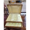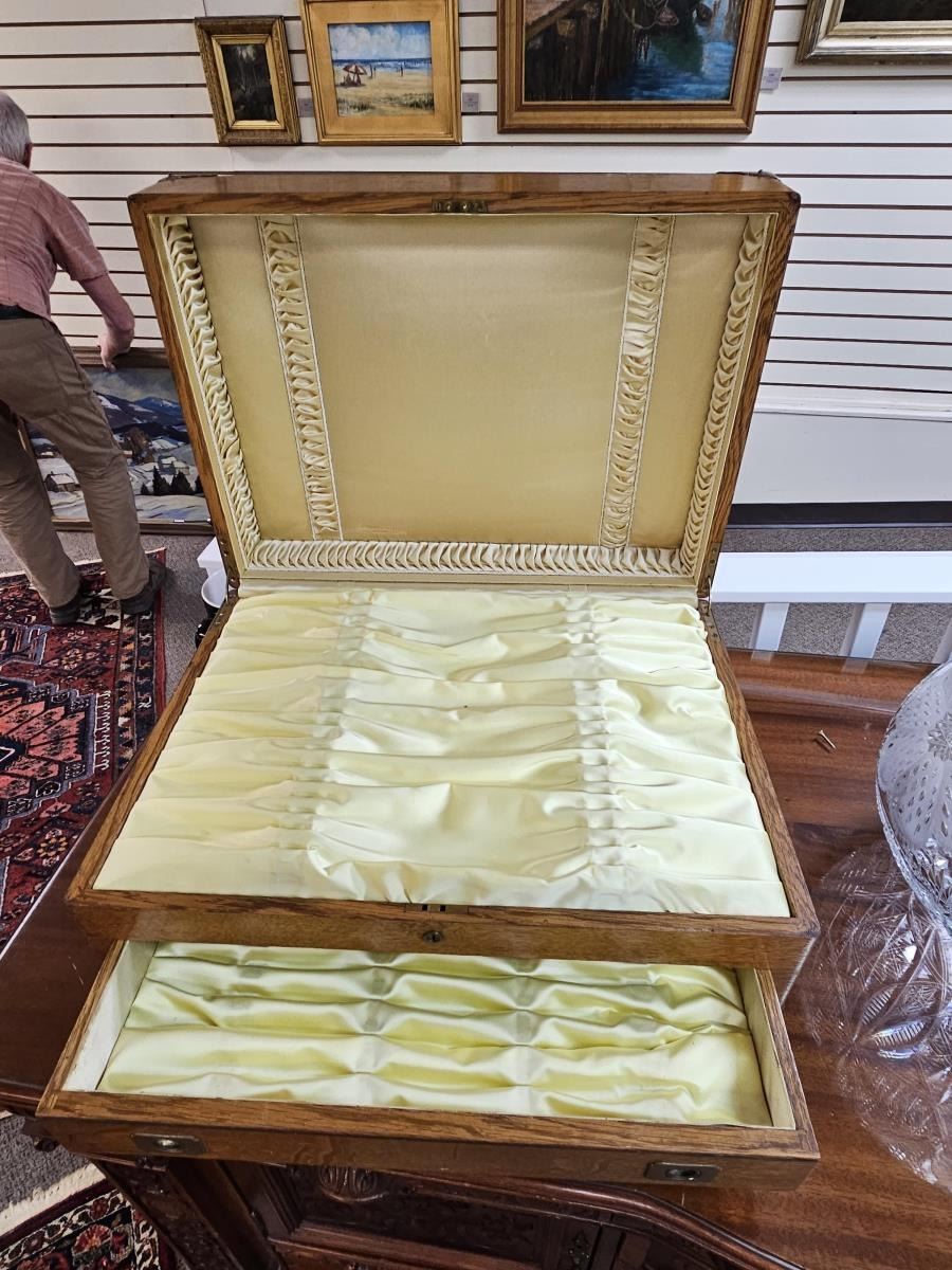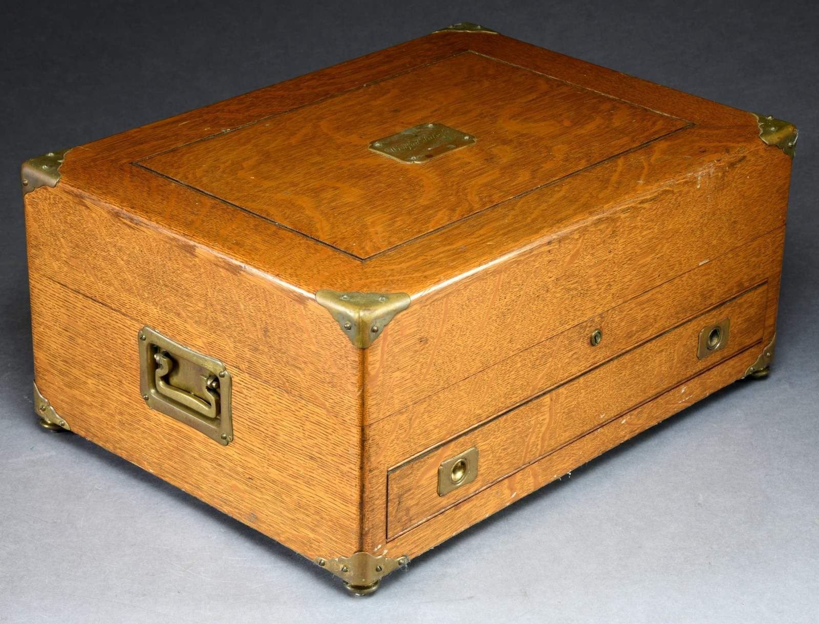Late 19th century. The quarter sawn oak case with hinged lid opening to a silk lined interior for storage of knives. The brass bound case with campaign style hardware. The case additionally fitted with a lower storage drawer at the front. SIZE: 9" h x 20 3/4" w x 15" d. CONDITION: very good with original surface, untouched patina. Hardware is original. (05-742/TG). $50-100.
