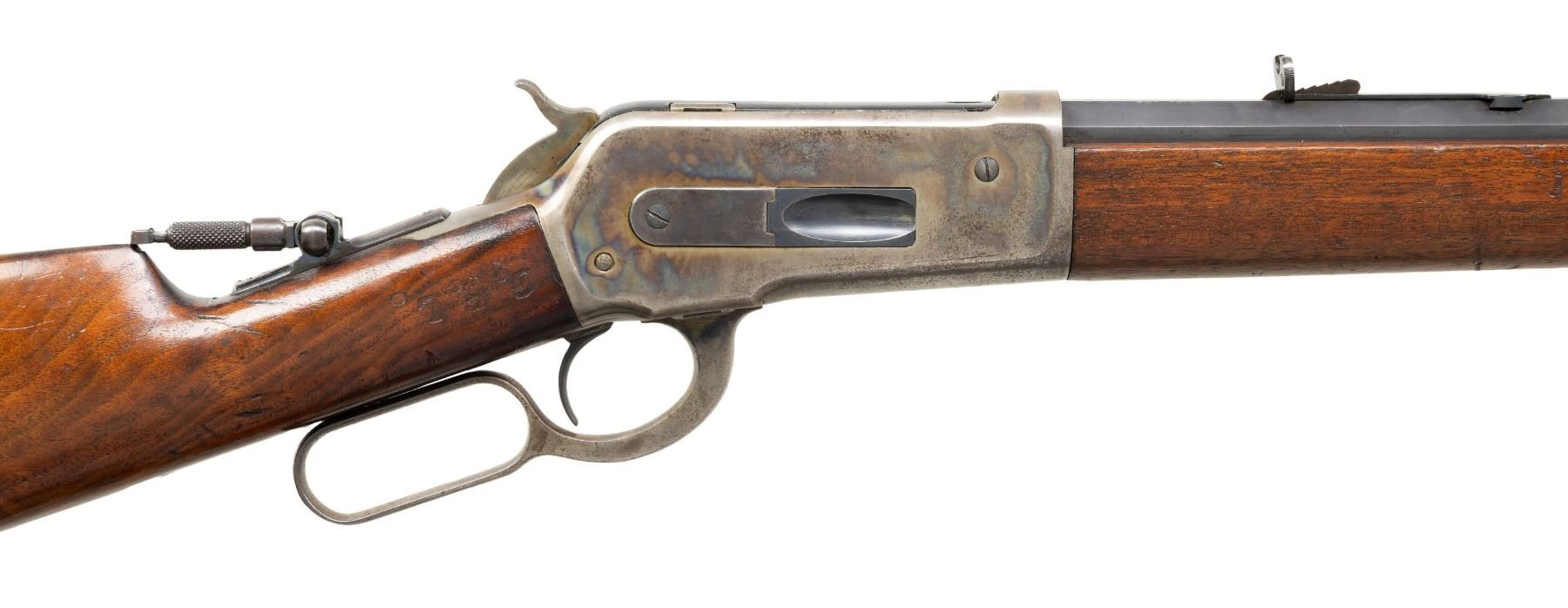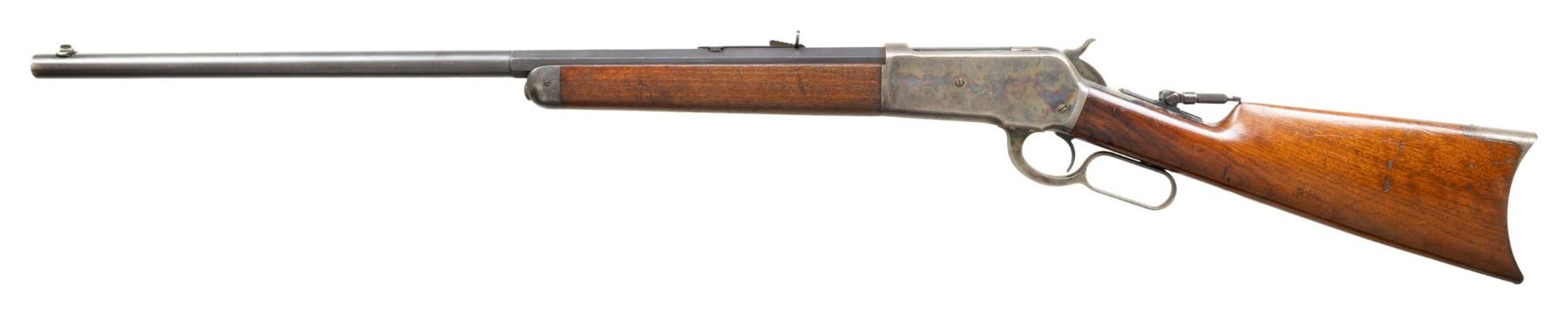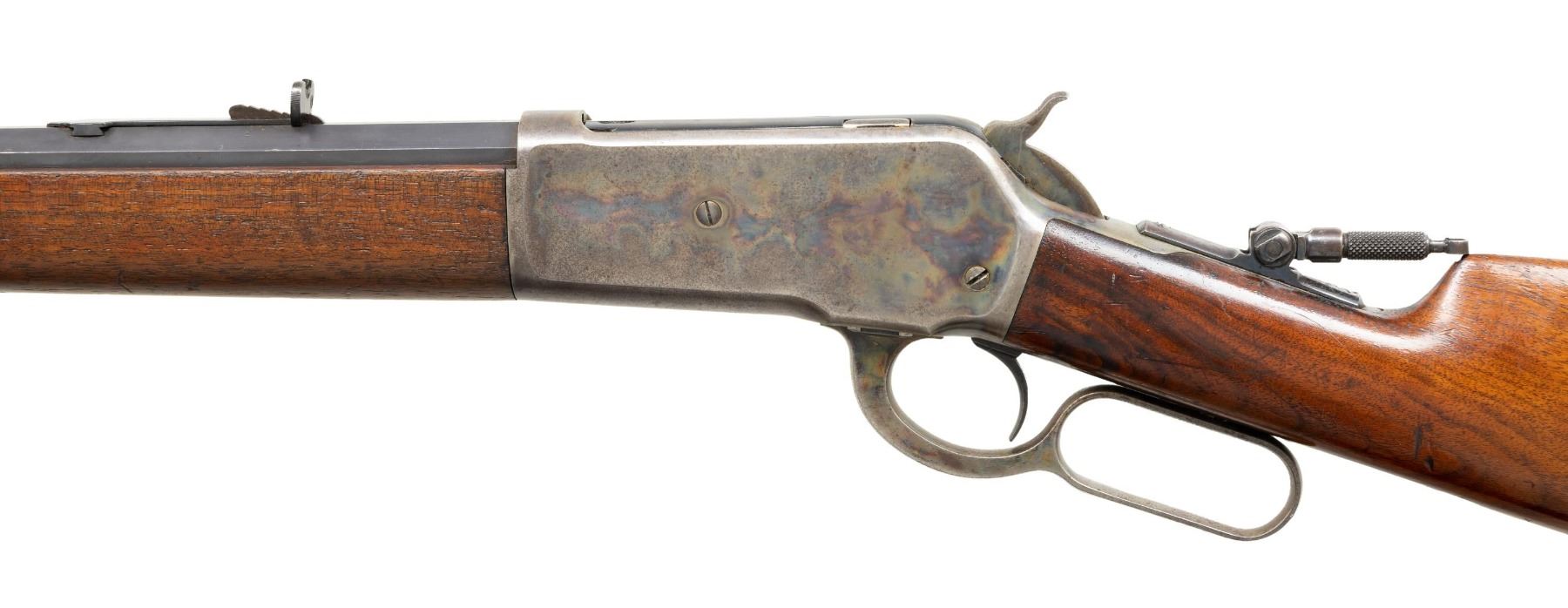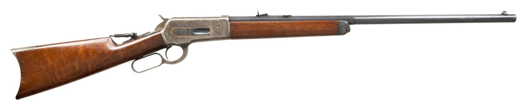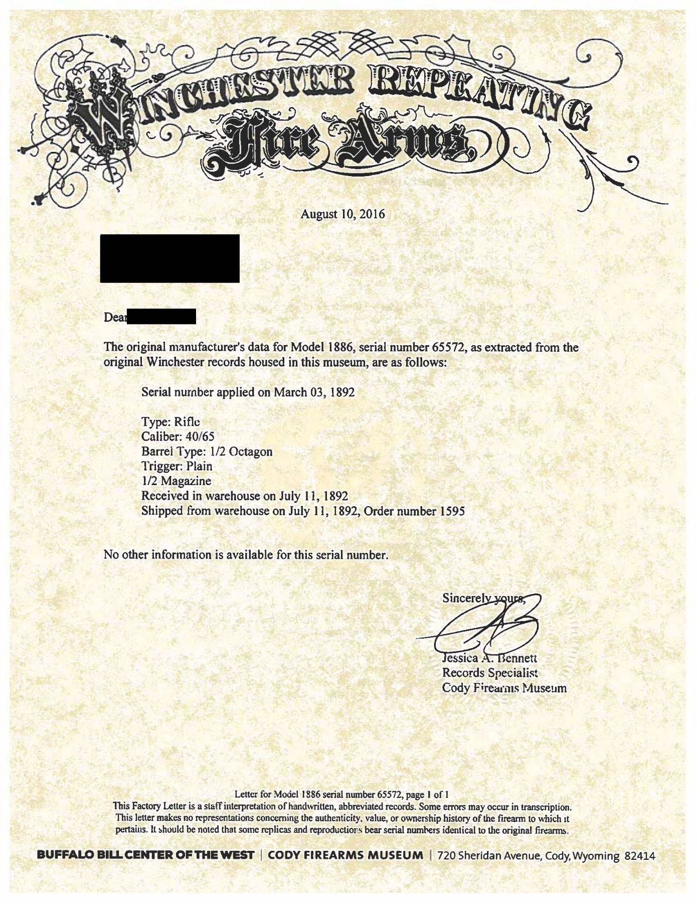 1886 HALF OCTAGON/ BUTTON MAG LEVER ACTION RIFLE WITH FACTORY LETTER. Cal. 40-65 WCF. S# 65572. Mfg. 1892 with 26" octagon to round barrel. White bead sporting front sight with sporting rear sight & combination tang sight. Button mag. Blue finish with case colored action, forearm cap & buttplate. Walnut forearm & straight grip stock w/ crescent steel buttplate. Right wrist of stock has stamped initials "G.F.L.". UNATTACHED ACCESSORIES: Winchester Repeating Fire Arms letter, "Type: Rifle / Caliber: 40/65 / Barrel Type: 1/2 Octagon / Trigger: Plain / 1/2 Magazine / Received in warehouse on July 11, 1892 / Shipped from warehouse on July 11, 1892, Order number 1595". CONDITION: 90% lightly worn original bbl. blue, showing slight muzzle wear with scattered marks & spots of freckling. Action retains 70% lightly faded original case colors, upper & lower areas are fading to gray, showing spots of freckling. Forearm cap retains 70% dark vivid case colors, buttplate has faded to gray brown. Original wood finish shows normal wear with scattered scratches & handling marks. Very good bright bore retains strong rifling. Overall this special order Winchester is in far better condition than you would expect to see compared to other examples of its age. (01-28746/BH). ANTIQUE. $5,500-8,500.