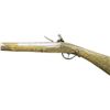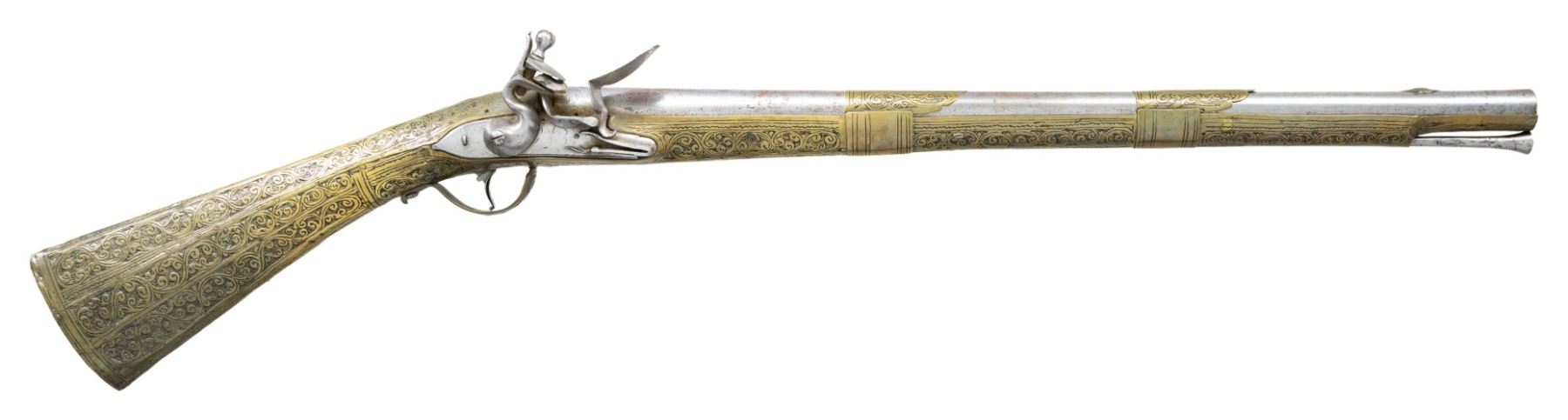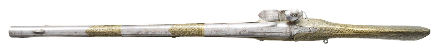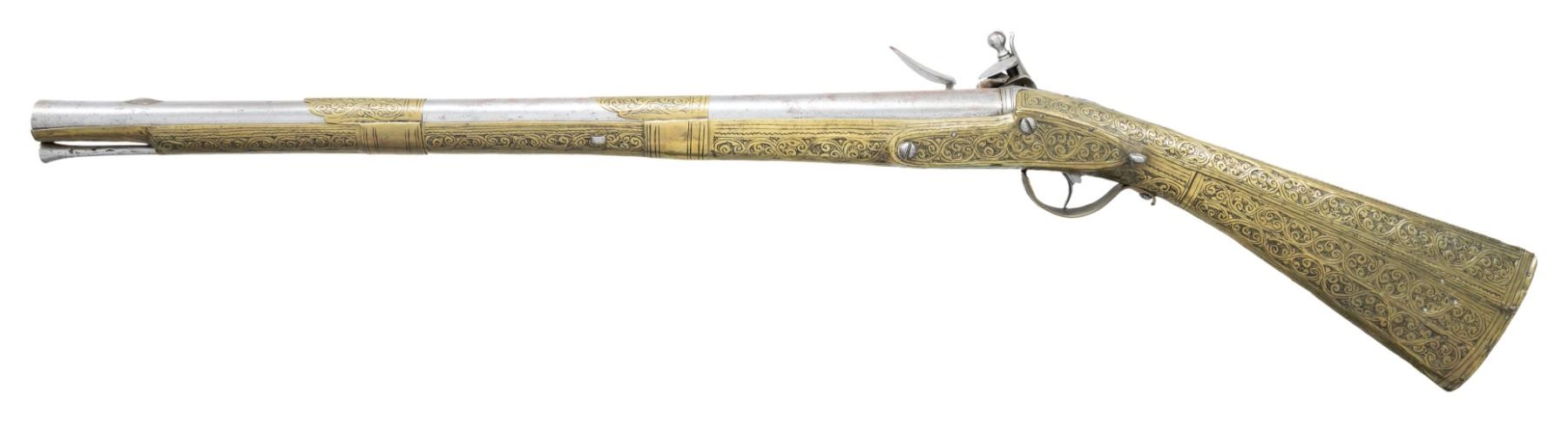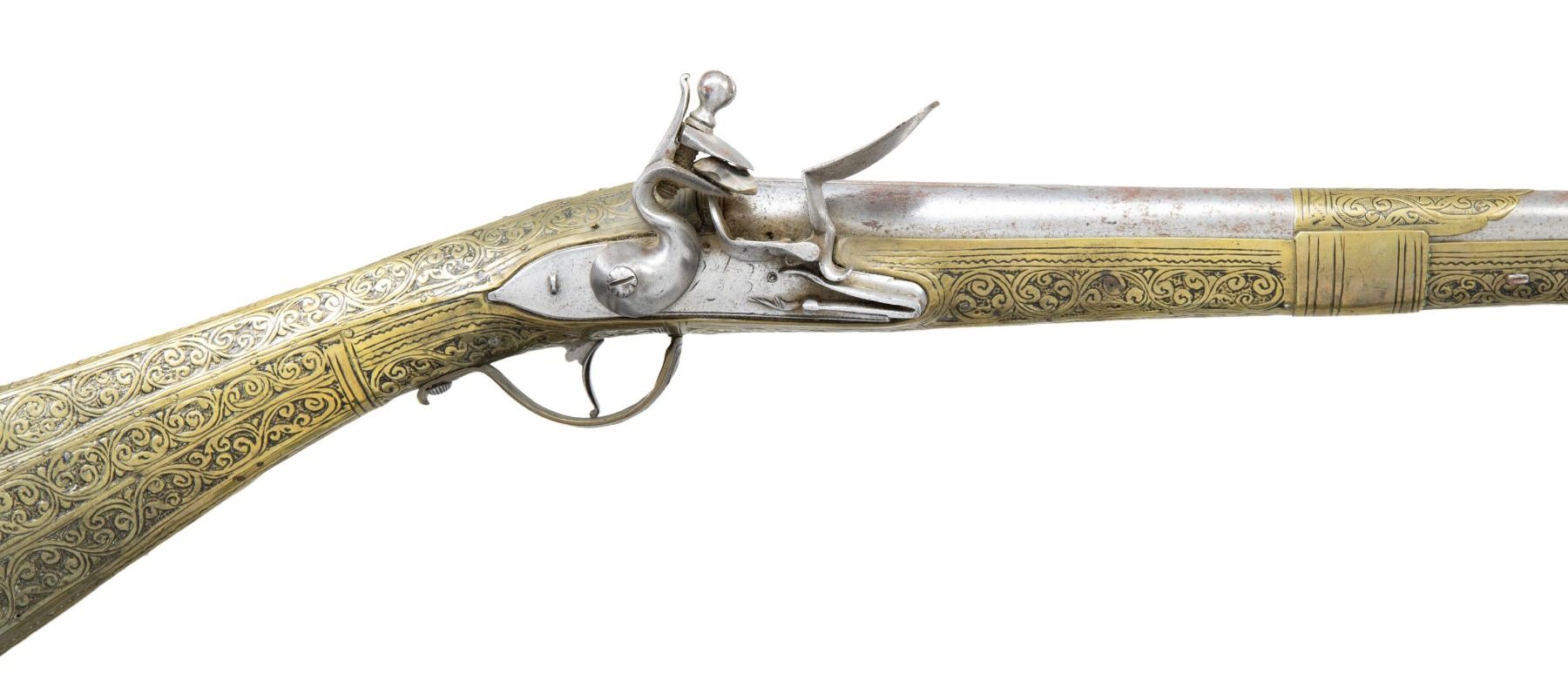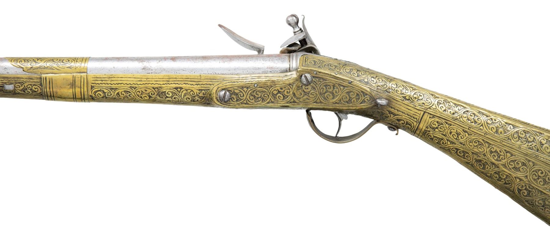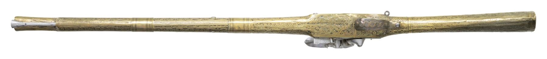 Cal. 80. NSN. 39" overall, 25" flared barrel, totally encased in engraved brass, 2 engraved brass barrel bands. Embossed & engraved design is all Islamic arabesque scrolls, engraved heavy brass trigger guard, steel lock & barrel have original maker marks polished out, saddle ring stud, original threaded ram rod. UNATTACHED ACCESSORIES: detailed collection notes including correspondence when purchased 2002, collection history from Denmark, and opinion of origin. CONDITION: fine overall, complete and original, barrel & lock are gray/bright with some light staining, brass well fit with toned patina. Mechanics fine, clear clean smooth bore. PROVENANCE: Estate Collection of Dr. Curtis S. Morse. (01-26311/JS). ANTIQUE. $2,000-4,000.