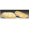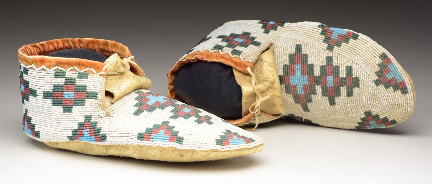 9.5", beaded tops, sinew sewn, geometric designs, white-heart red, sky blue, & green beads on white ground with worn red velvet cloth trim. CONDITION: good overall. PROVENANCE: Martin Lane Historic & Western Americana Lifetime Collection. (02-21668/JS). $400-600.