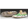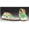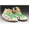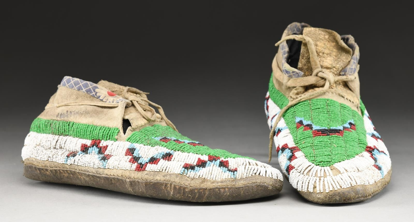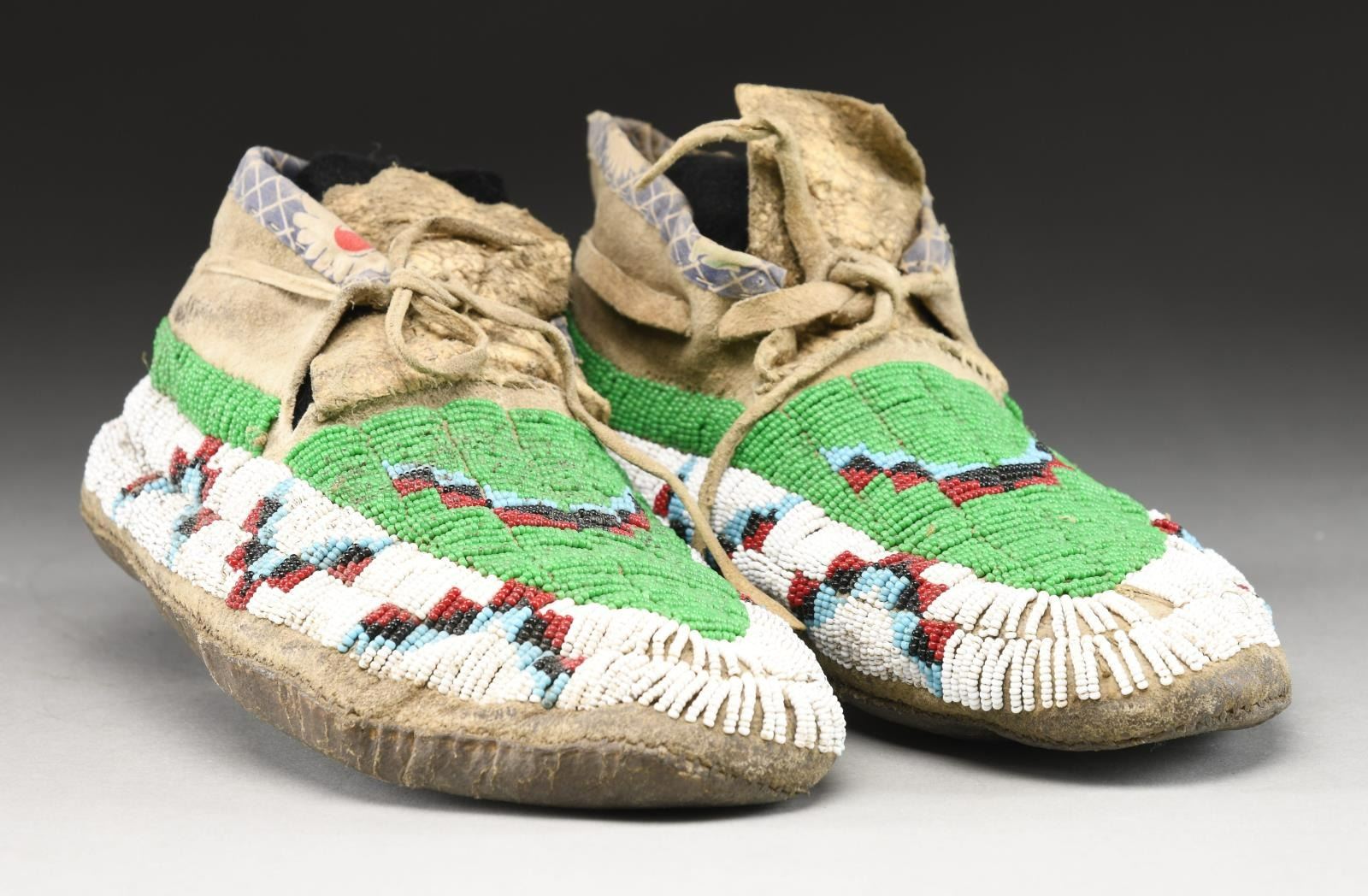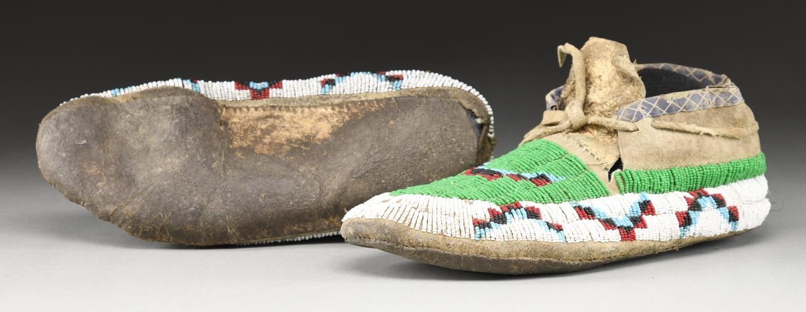 MOCCASINS.10" overall length, thread & sinew-sewn, geometric red, light blue, dark blue, black, green, & white beaded full coverage, trade cloth edged, hard sole. CONDITION: very good overall, scattered losses of beads, wear & light soiling, separation on one hard sole at heel. PROVENANCE: From the Lifelong Collection of Glen E. Mattox. (02-18732/JS). $400-800.