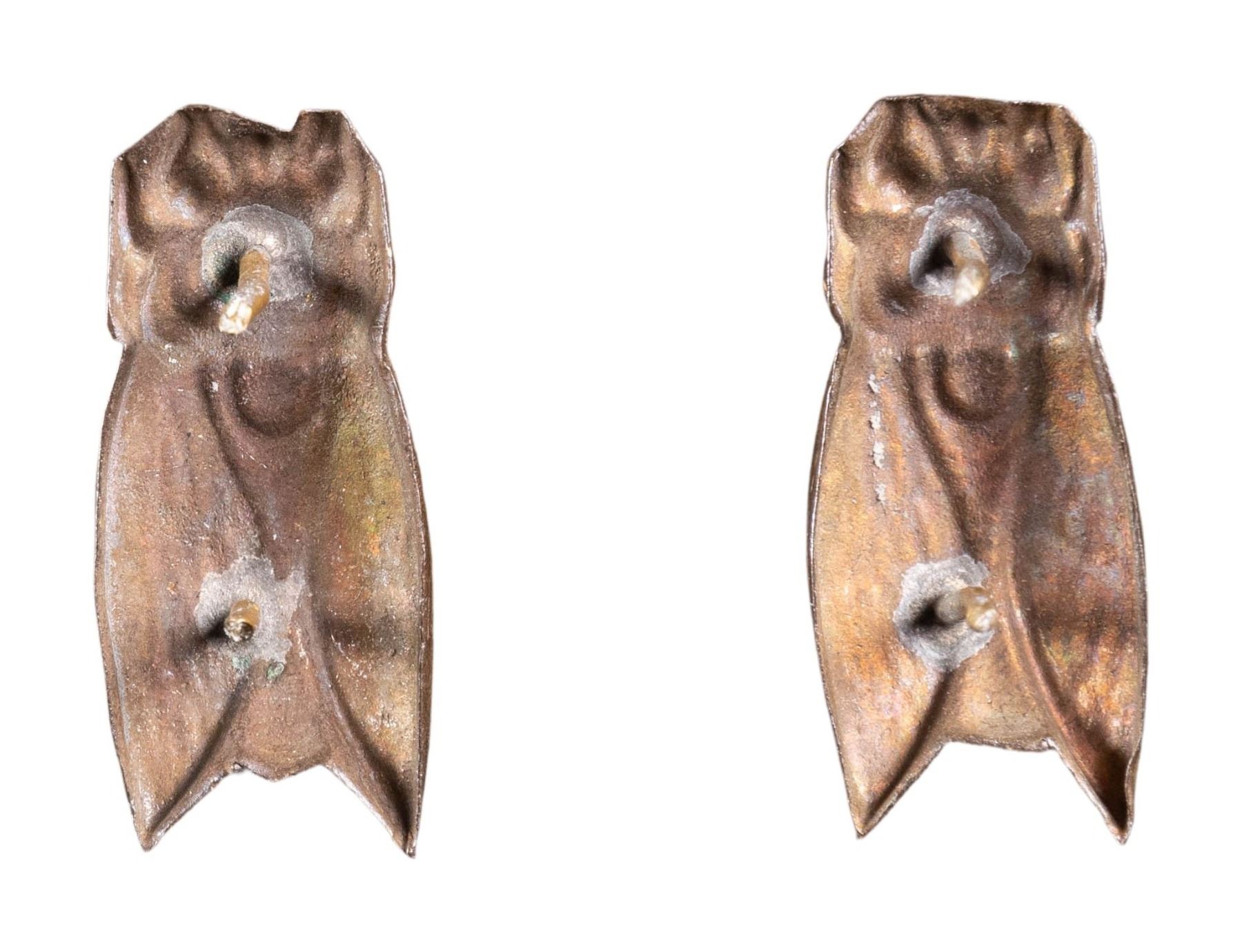 A fine pair of Japanese gold inlaid bronze cicada menuki. These are small ornamental fittings for the tsuka of a samurai sword. They depict cicadas, a popular Japanese motif that symbolizes rebirth, impermanence and summer. CONDITION: menuki show light overall wear. (02-25826/BF). $200-300.