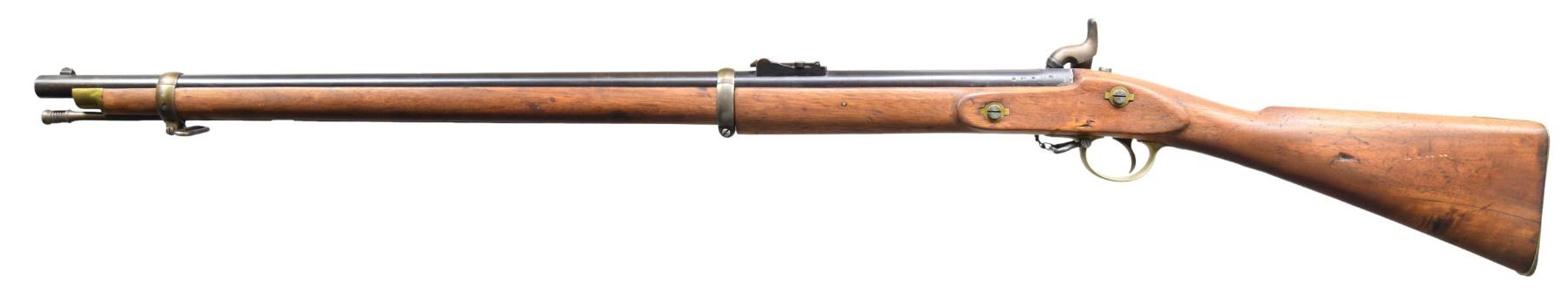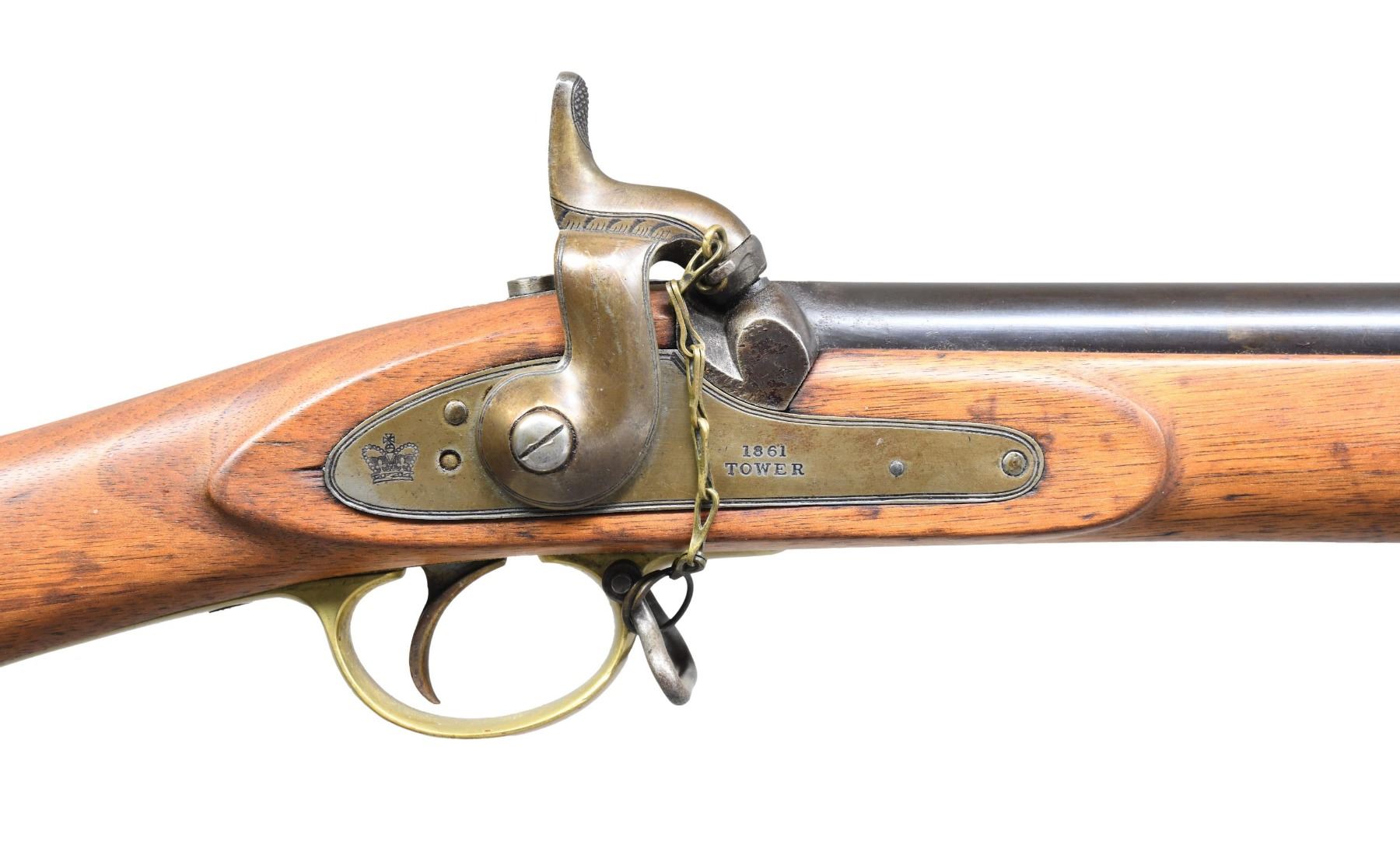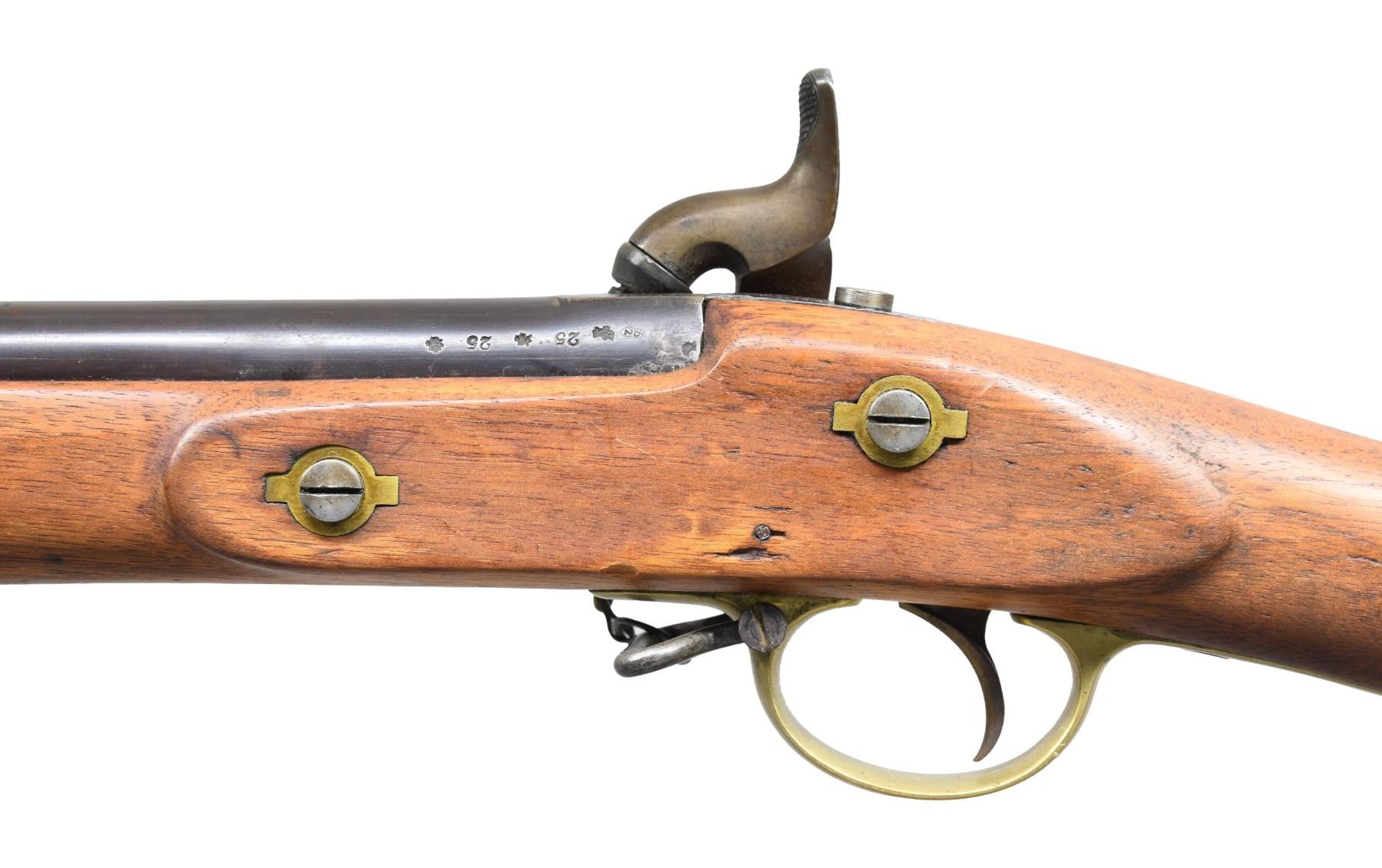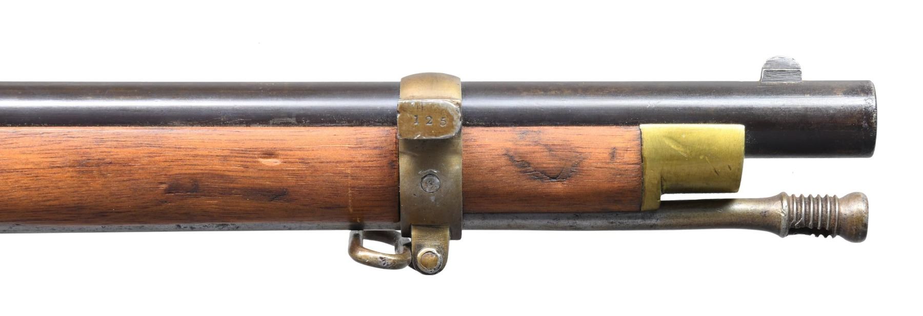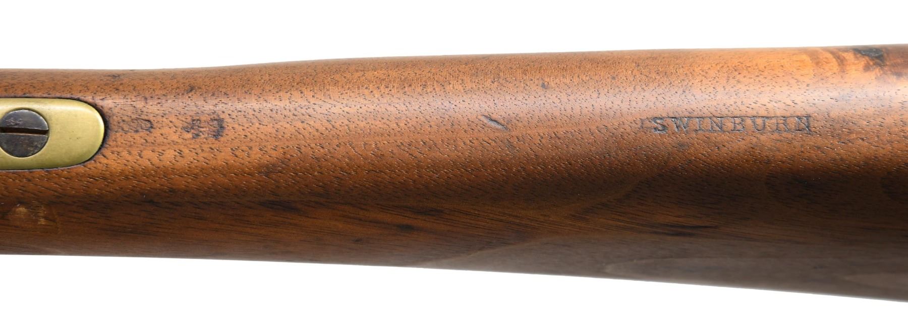 Cal 577. NSN. Standard configuration, 33" Birmingham proofed barrel, long range ladder sight, brass furniture, 2 steel barrel bands, front band made with integral bayonet lug numbered "125". Stock has Birmingham Small Arms black powder proof stamped rear of trigger guard and contractor "SWINBURN" further on belly. Tower lock is dated 1861 with crown and no cipher which shows this gun was for export. No Confederate markings, this is a pattern that is very rare to find in this superior condition with Confederate association. CONDITION: fine overall, barrel retains much of its original military blue finish, dark plum overall, stock has crisp markings with scattered dings and dents. Mechanically fine, bright shiny 5-land & groove rifled bore. (01-26896/JS). ANTIQUE. $1,500-2,500.
