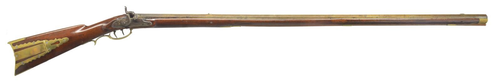 OF ALLENTOWN, PA CONVERTED TO PERCUSSION. Cal. 47. NSN. Bbl. 45" oct. Fitted w/ U-notch rear & brass blade front sights, stamped "MOLL" on top flat (most probably John Moll II working in Allentown, PA 1810-1820). Bbl. converted to percussion w/ drum & nipple. Lock is fitted w/ flat faced chamfered hammer w/ stamped scroll engraving. Lockplate w/ light game scene engraving marked "R & W.C. Biddle & Co." "PHILADELPHIA". Double set triggers are fitted. Full length walnut stock attaches to bbl. w/ 3 bronze bolts & is brass mounted. Crescent buttplate w/ patchbox release at center has 4 1/2" return w/ floral engraving & fancy outline. Patchbox on right side of stock has crenelated border to side panels & finial pierced in keyhole form. Patchbox matches that known by J. Moll as listed in "Chandler Vol. 1". Trigger guard has spur at rear of grip. Sideplate is of bird wing style & hickory ramrod is held by 2 line engraved pipes & matching tail pipe. Left side of stock has very sm. fluted cheekpiece. CONDITION: good to fine. As converted. Bbl. w/ old cleaning is now silver to brown w/ some scattered marks & light rusting. Lock is basically the same. Stock retains most of an old oil refinish w/ some minor repairs along right bbl. channel & at center stock mounting bolt. Brass once cleaned is now dark gold. Fine bore, shiny w/ some light pitting toward muzzle. Lock will not hold at full cock. Triggers do set. PROVENANCE: The Estate Collection of Gary Parietti. (01-19027/MGM). ANTIQUE. $1,200- 1,800.