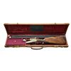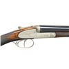 ACTION GAME GUN WITH CASE. Cal. 16 ga. 2 1/2". S# 27391. The 27 1/2" dovetailed bbls. are fitted with slightly raised matted concave game rib. Bbl. flats are stamped with 1947 Belgian nitro proofs for 65mm chambers. Choke and steel information are marked on bottoms of bbls. Bottom of rear lump is stamped "LTC" and there appears to be a maker's mark which is indecipherable. Coin finished boss type rnd. bodied sidelock action is stocked to the fences and features nonautomatic safety ("S" inlaid in gold), Purdey type hidden third fastener, bushed and vented strikers, raised rib tumbler end cocking indicators, and double triggers (front articulated). Action and locks are engraved with very well cut and nicely shaded varying size but mostly large open scroll within geometric borders. Trigger guard with matching scroll on bow has serial number on tang. Slightly swan necked straight grip buttstock of well marbled and lightly figured European walnut measures 15" over checkered wood butt on 1 1/4" lengthening piece that matches well as to color, but not marbling. Point pattern checkering is at grip and a sling loop matching that screwed to bottom rib of bbl. is on toeline.  Matching splinter ejector forend with Anson release has interesting floating uncheckered diamonds in pattern. MEASUREMENTS: BBLS: Bore Diameter: R .668", L .667". Restriction: R .037" (EXTRA FULL), L .037" (EXTRA FULL). Min. Wall Thickness: R .027", L .026". STOCK: DAH: 2 9/16". DAC: 1 9/16". LOP: 15". CAST: approx. 5/8" off. WEIGHT: 6 lb. 3 oz. UNATTACHED ACCESSORIES: good quality English type leather V.C. case with stitched leather corners is embossed "Y.K" on central oval on top. Interior is lined in purple velvet and reproduction "Artesanal Belga" label is in lid. Case contains bag for action, a BGI ebony two piece cleaning rod, two Boss marked snapcaps and a newly made English oilbottle marked "Hogan & Colbourne Ltd". Case comes with brown suede outer cover with polished leather trim having snap closure. CONDITION: fine as partially refinished. Bbls. retaining nearly all of a best reblack. Action retains nearly all of what appears to be its original coin finish with little evidence of cleaning. Stockes retain nearly all of a best oil refinish, most likely done at time of stock addition. Checkering appears to be cleaned but not recut. Bores are shiny and bright but some light frosting bordering on pitting can be seen at breech ends of both bbls. Action is tight. Bbls. are on face. Ejectors are strong and in time. Case leather is fine with some minor scuffs. Handle is good. Interior cloth shows some rubs and soiling. Some partitions have been reworked and smaller compartment cover has nonmatching cloth. Outer cover is fairly new. A fine high quality piece. Guns like this represent a great bargain in todays market. (22-4462/MGM). MODERN. $4,500-7,500.
