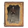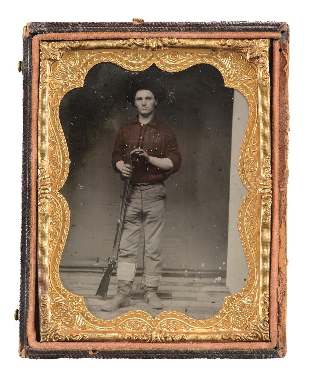 MILITIAMAN AND SPORTING RIFLE. Quarter plate full length portrait of unknown "red shirt" militiaman, likely Southern, holding half stock, full octagonal barrel percussion rifle, tinted red shirt with gilded buttons, fly front light color trousers, boots with leggings, large brimmed hat. CONDITION: very good overall, good detail with light spotting, half case. PROVENANCE: Martin Lane Historic & Western Americana Lifetime Collection. (02-21908/JS). $800-1,200.