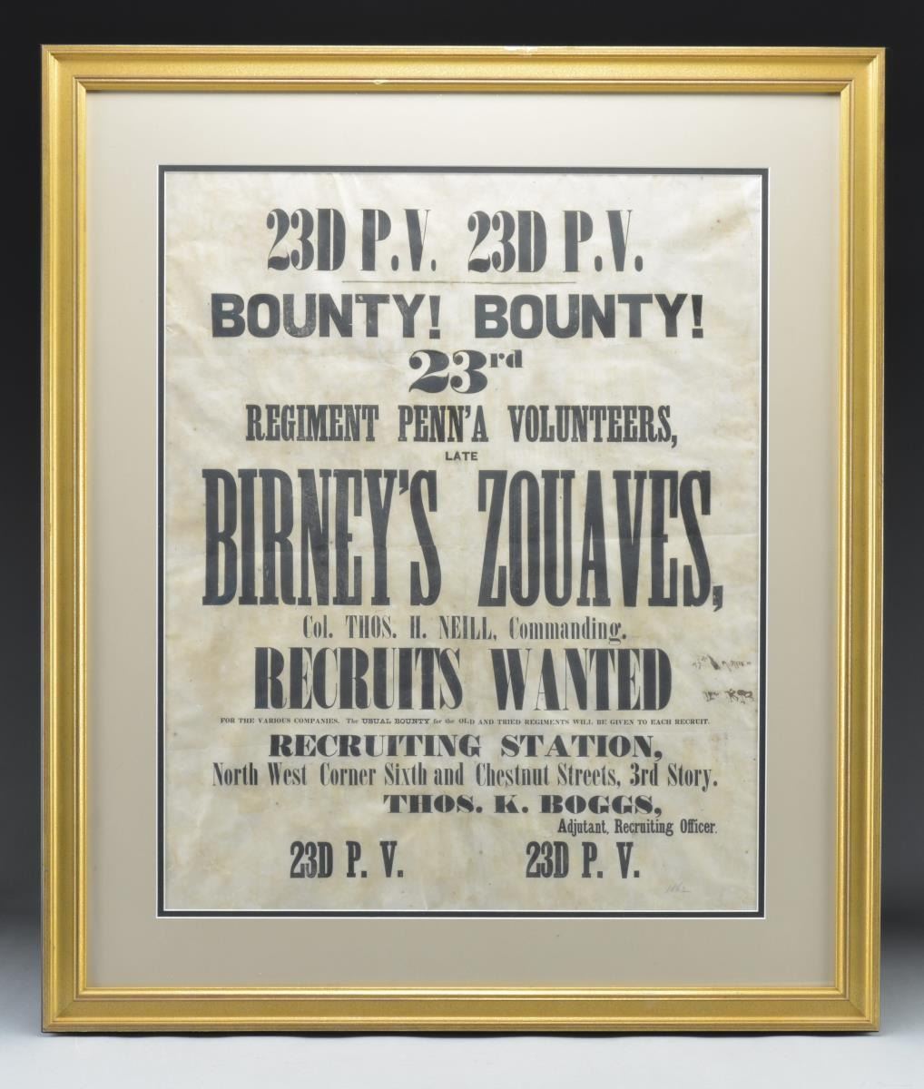 CIVIL WAR 23RD PENNSYLVANIA INFANTRY RECRUITING BROADSIDE. 30” x 35” frame, 21” x 26.5” mat. Birney Zouaves were recruited from Philadelphia, wore distinctive colorful red trimmed Zouave coats and pantaloons, and had good war record in army of Potomac. David Bell Birney, Colonel of the 23rd PA, raised the regiment in Philadelphia at his own expense. He was promoted to Brigadier General in late 1861 and to Major General for distinguished service on May 20, 1863. Birney's division in the III corps was demolished at Gettysburg where he took over command of the Corps after Sickles' wounding. He was given command of the 10th Corps, Army of the James by Grant in July, 1864. He died of typhoid fever in October of that year. At Gettysburg, one member won the Congressional Medal of Honor. Large, oversized recruiting posters like this are rare with few surviving especially early war and from such famous regiment. CONDITION: very good overall, crisp contrast, not removed from frame, not dry-mounted, surfaces appear very good with some age yellowing, 2 brown ink names signed on verso on right edge can be discerned. Frame has one chipped area at top. (02-17444/JS). $6,000-8,000.