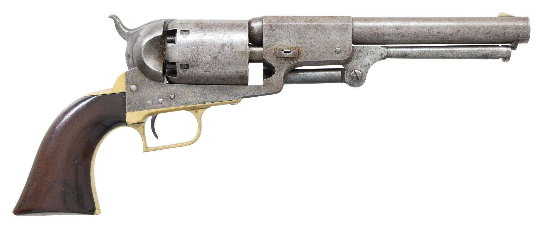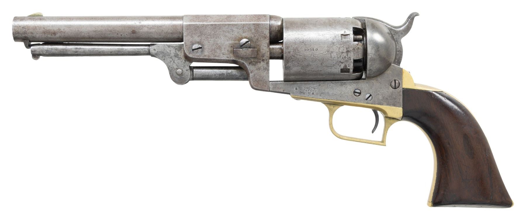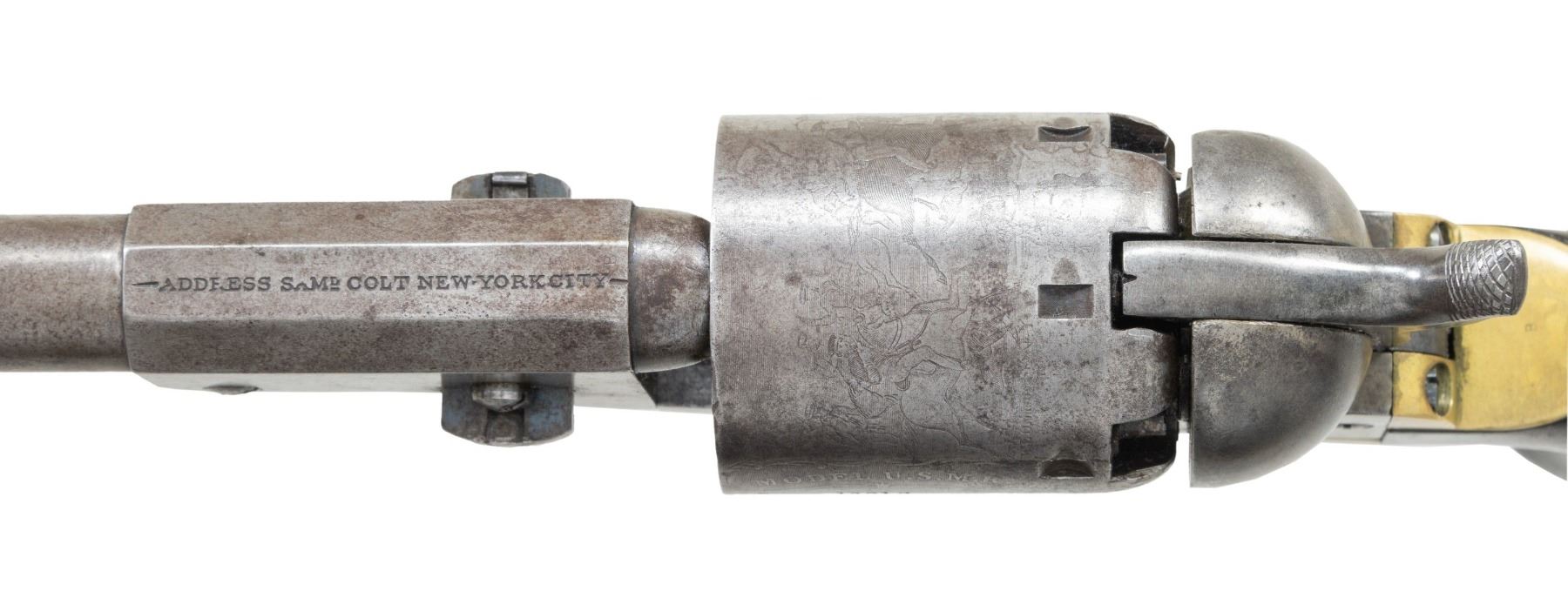 2ND MODEL DRAGOON REVOLVER CARRIED BY PROMINENT MASSACHUSETTS GENERAL CHARLES DEVENS OF WORCHESTER. Cal. 44. S# 10648. Only 100 Massachusetts 2nd model Dragoons were purchased. All bought by Mass board of Ordnance in 1852. All are scattered in the mid 10000 serial range. Several were owned by important Massachusetts personalities, such as one of a pair in Smithsonian carried in Civil War by General Benjamin Butler, S# 10603. Another was owned by 6th Mass surgeon who performed the field surgery of the Civil War, S# 10646. General Charles Devens, Jr (1820-1891) was Civil War Union Brigadier General with impressive bronze equestrian statue in front of Worchester County Courthouse since 1906. Another larger-than-life bronze statue of the general is displayed in Boston cast in 1895. Devens was longtime prominent & important Massachusetts personage, graduate of Harvard Law School in 1840, member of the Massachusetts State Senate in 1848, US Marshall of Massachusetts, 1849 to 1853 (where he probably received this revolver), general in Mass State Militia, and served on the US Department of Justice in 1860 just prior to the Civil War. He volunteered immediately and was appointed Major of the 3rd Mass Mounted Rifles, shortly after, has was promoted to colonel of the 15th Massachusetts and was wounded in action for the first of 3 times at the Battle of Balls Bluff. He was promoted Brigadier General in April 1862 and being wounded a second time at battle of Seven Pines. He was then given command of the 1st Brigade of the IV Corps in the Maryland Campaign. Assigned commander of the 1st Division, XI Corps in 1863, he fought at the Battle of Chancellorsville where he was wounded the 3rd time. In 1864, he was division commander at Battle of Cold Harbor and in the Overland Campaign. During the Siege of Petersburg, he commanded the 3rd Division, XXIV Corps and his troops were the first to occupy Richmond, Virginia in April 1865. For distinguished service, he was brevetted Major General of US Volunteers and served as commander of the military district of Charleston, South Carolina until 1866. After the war, he was judge of the Massachusetts Supreme Judicial Court. No wonder there are 2 statues of him in Massachusetts. Both statues are well known and considered among the finest aesthetic. When the equestrian statue was unveiled in 1906, over 1000 veterans attended and the flag of his old 15th Mass regiment was flown. Devens was also Commander of the Grand Army of Republic from 1873-1875 before being appointed Attorney General of the United States 1877-1881 under President Rutherford Hayes. The revolver is in beautiful condition in standard configuration for Colt 2nd model dragoon, blue and case colored, 7-1/2" octagonal to round barrel, German silver front blade sight and "ADDRESS SAML COLT NEW YORK" address. Trigger guard is stamped with S# and Massachusetts surcharge "MS". "COLT'S PATENT" / "U.S." stamped on left side of frame. Square back brass trigger guard is characteristic of 1st & 2nd model dragoons. Walnut 1-piece grip has 2 inspector cartouches "WAT" (William A. Thornton) and "JCB" (Joseph C. Bragg). Bragg sub-inspector initial "B" is seen on barrel, loading lever, frame, cylinder, trigger guard, backstrap, & grips. Revolver is 100% original and in configuration used in Civil War, all serial numbers match except cylinder which is 10510. Dr. Norman Smith was officer in 6th Mass Militia prior to war and carried S# 10646 just 2 serial numbers apart from General Devens revolver. Smith's revolver had mismatched cylinder like this revolver but was renumbered to match. Most dragoons were issued in pairs as noted by Ben Butler's, another known pair are S#s 10432 & 10549 both with "AME" monogram. The 2nd Model Dragoon was the lowest production of all the Dragoon models and of that limited production, only one hundred were purchased by Massachusetts. This is beautiful & rare Colt 2nd model dragoon owned by a prominent Civil War general, wounded 3 times during war and division commander from 1861-1866. UNATTACHED ACCESSORIES: Family file including notarized affidavit dated May 23, 2023 stating descent of this revolver from General Devens through family of Devens brother Arthur as the general never married. Also in lot is brief biography of General Devens and file on S# 10646 of Norman Smith, Mass militia, a very comparable revolver. CONDITION: very good to fine overall, small traces of blue observed in protected areas, and traces of case colors, revolver is overall smooth gray patina with crisp markings. Rolled "MODEL U.S.M.R." & "COLT'S PATENT" & "Dragoon-Indian fight" cylinder scene is very good, 5 of 6 safety pins are still crisp. Cartouches are both discernible & grips fit well. Mechanics are fine, bore is bright & shiny. PROVENANCE: Charles Devens, Jr (1820-1891), Devens family descent. (01-27273/JS). ANTIQUE. $10,000-15,000.