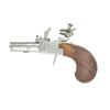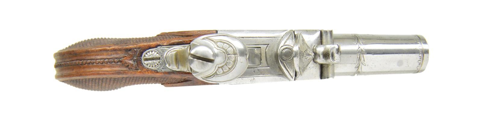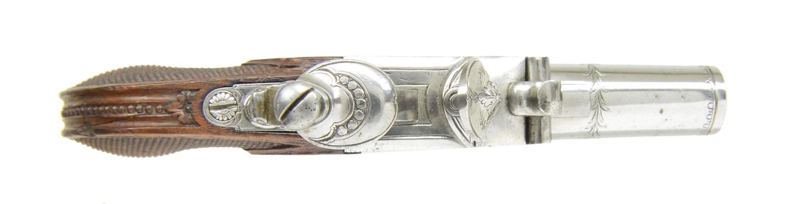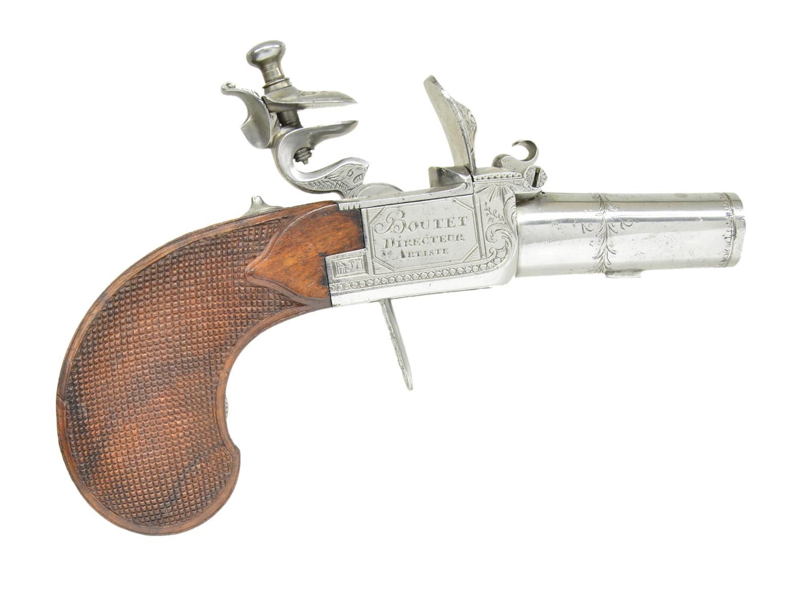 Cal. 44. S# NSN. The 1 1/8" smooth bore turn off barrels are marked "1" & "2" with matching numbers on boxlock actions. Actions are fitted with centrally hung serpentine cocks, frizzens with internal springs and sliding button safetys that engage at half cock and also lock frizzens in closed position. When brought to full cock, triggers extend. The neck of the cocks are filed and engraved in the shape of stylized dolphins. Actions are engraved with bead borders and some scroll. Right sides are also engraved "Boutet" "Directeur" "Artiste". Left sides are engraved "Manufre" "Versailles". Nicholas Noel Boutet was gunmaker to Napoleon Bonaparte as well as the director of the Versailles Manufactory. He is the most renowned of all gunmakers and his signed firearms and swords prized by museums and collectors alike. Checkered walnut short bag grips have deep relief bead carving along back strap. CONDITION: good, showing overall cleaning of metal to bright polish over some scattered very light pitting. Grips retain most of their original finish over many marks and bumps. Bores are bright and shiny, pistols are mechanically good. (01-21866). ANTIQUE. $6,000-8,000.