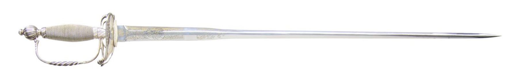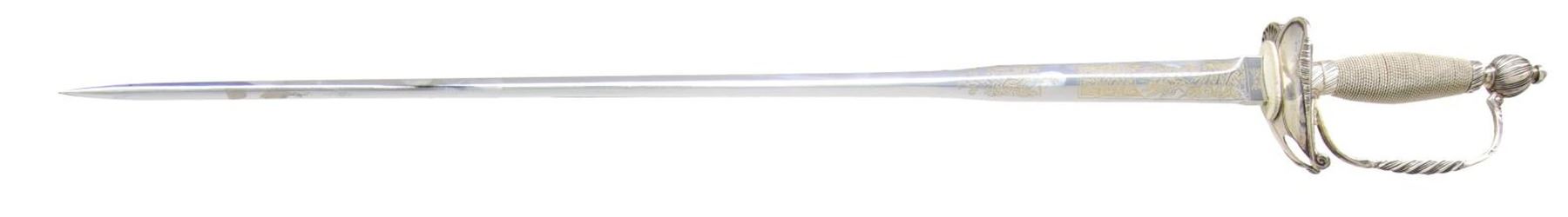 SWORD BY WILKINSON. Overall length: 35”. Blade length: 28 1/8”. This sword is a faithful and quality reproduction of Washington’s dress sword, worn during his inauguration in New York on April 30, 1789. It was given to him by his good friend, Major General William Drake. The sword has a colichemarde blade that is etched over the bottom 7 1/2" with foliate and military motifs. The ricasso has two opposing eagles on one side and “WILKINSON SWORD LONDON” on the other. Silver hilt with a boat-shaped guard and shallow pas d’ane. Twisted knuckle bow and pommel. Hallmarked knuckle bow and top ferrule. Wire-wrapped grip. No scabbard. Sword comes with a protective felt bag. CONDITION: sword shows very light wear overall, with a highly polished blade and a pleasing patina on the hilt. (02-22652/BF). $250-400.