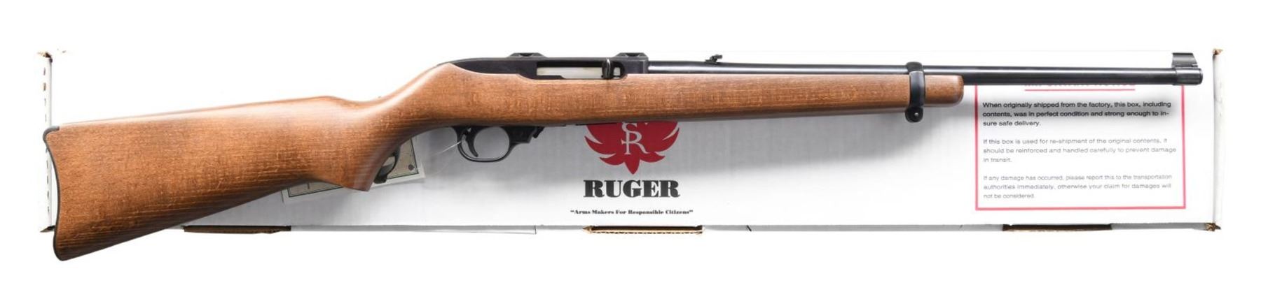 MATCHING FACTORY BOX. Cal. 22 Win Mag. S# 290-43390. Bbl. 18 1/2". Model 10/22 Magnum semi-automatic rifle mfg. by Ruger in 2004. Top of bbl. is marked with Ruger's mfg. information. Left side of receiver is marked with the S#, followed by "RUGER", the model and cal. designations, as well as the Ruger logo. Steel receiver and bbl. exhibit a blue finish, with the aluminum trigger pack exhibiting a black enamel finish. 1-piece plain wood pistol grip buttstock. Brass beaded blade front sight with U-notch rear sight. MAGS: 1 10-rd. UNATTACHED ACCESSORIES: matching factory box. CONDITION: extremely fine, with metal components retaining bountiful amounts of their original factory finishes, exhibiting few light superficial handling marks overall. Mirror bore, exhibiting well defined rifling throughout. Stock is excellent. Box shows some mild exterior wear, but otherwise remains sturdy and serviceable. (23-6847/MLW). MODERN. $500-800.